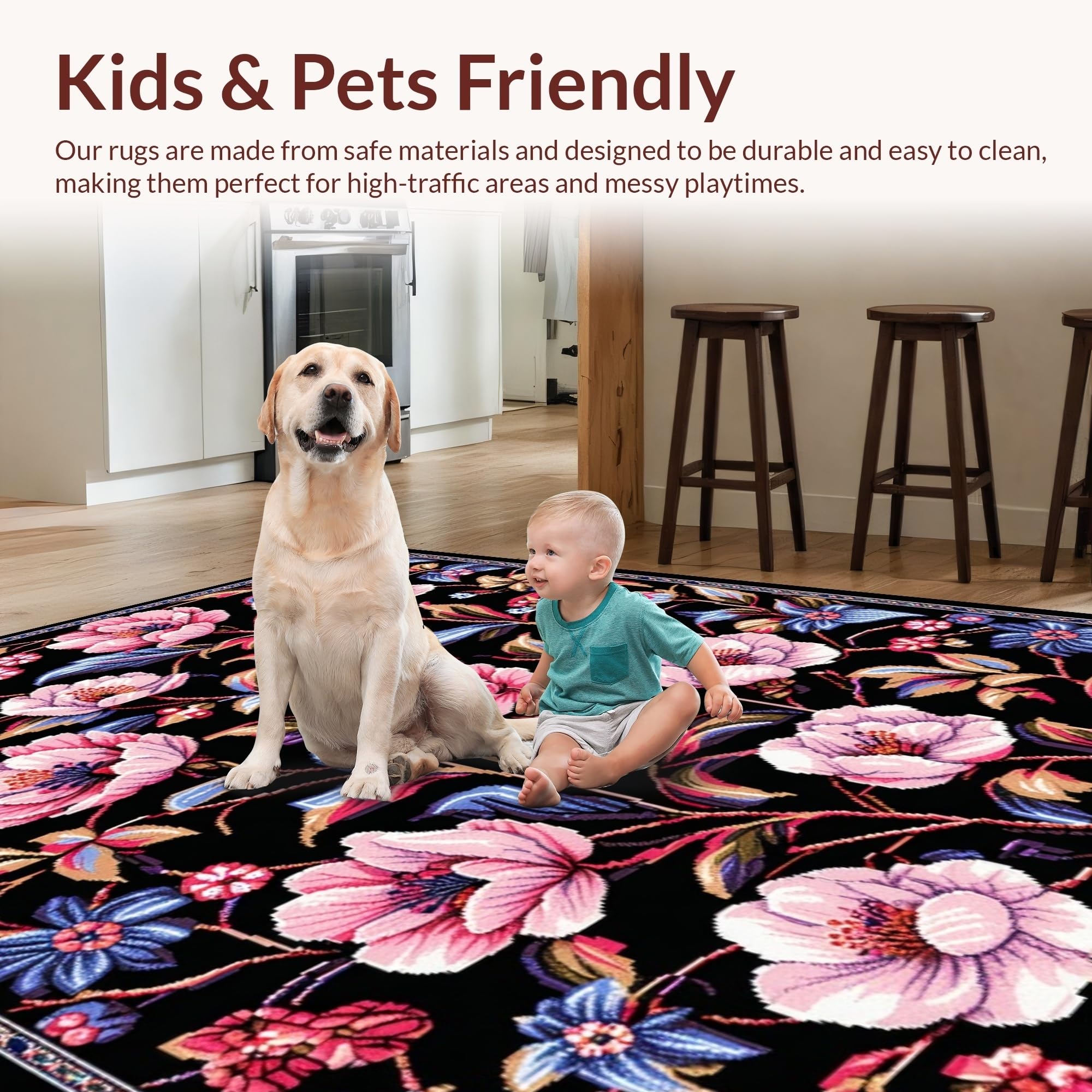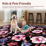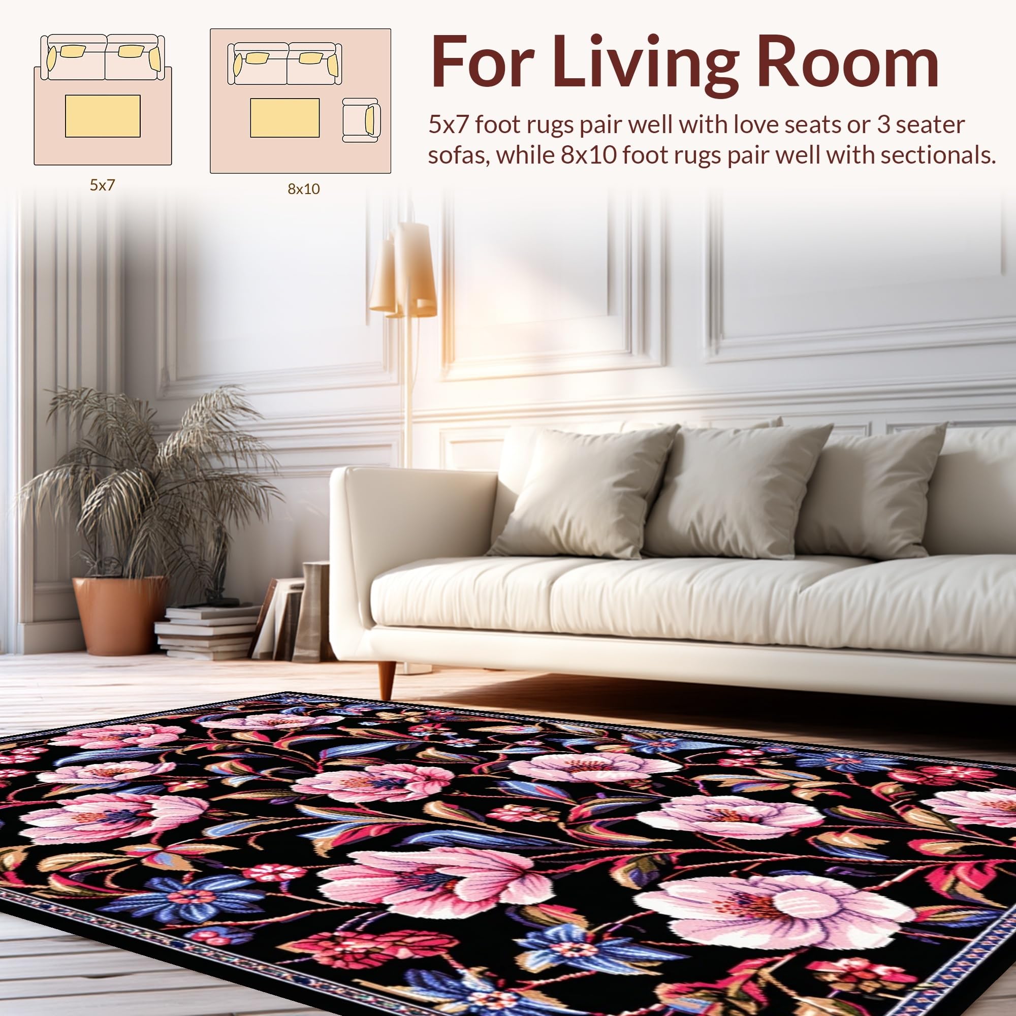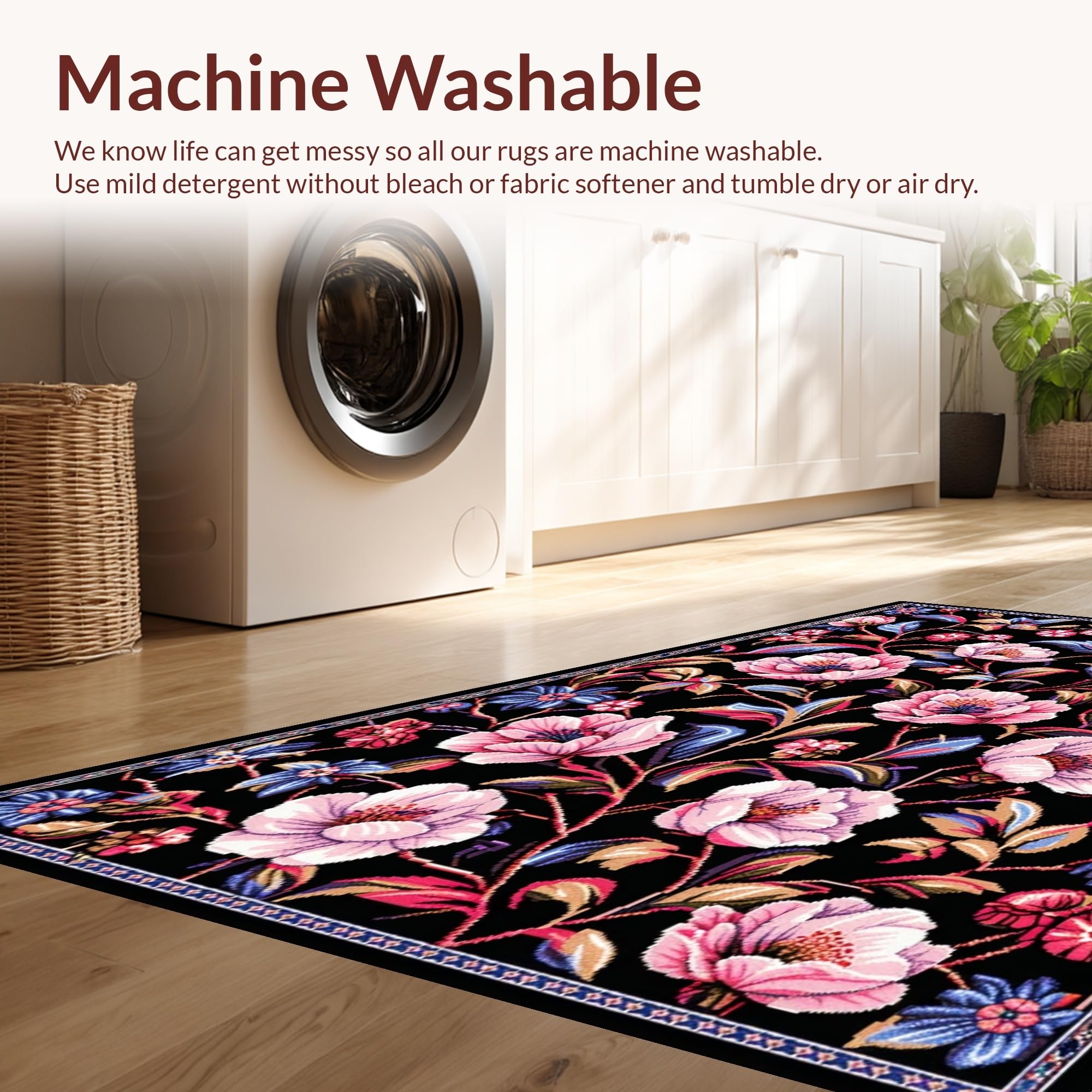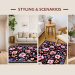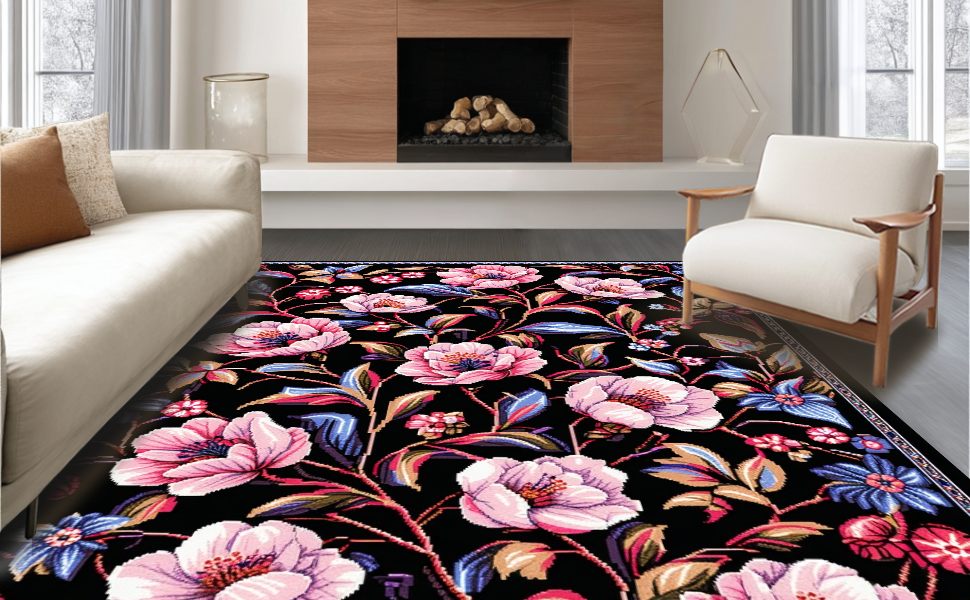 Ultra Soft Area Rug, Non Slip, Stain Resistant, Washable Area Rugs for Living Room, Bedroom, Elegant Black Pink Botanical Motif(Black) Overview: