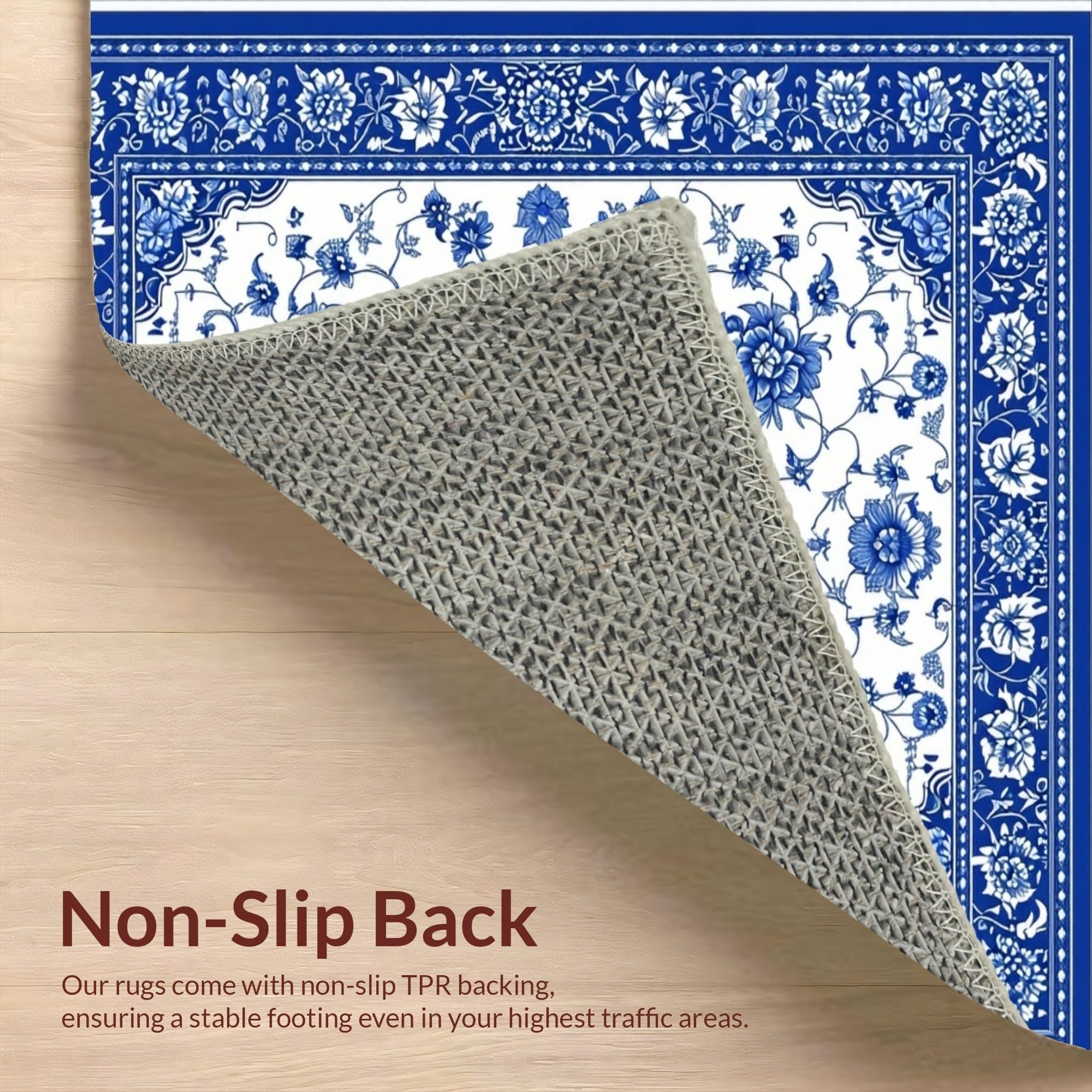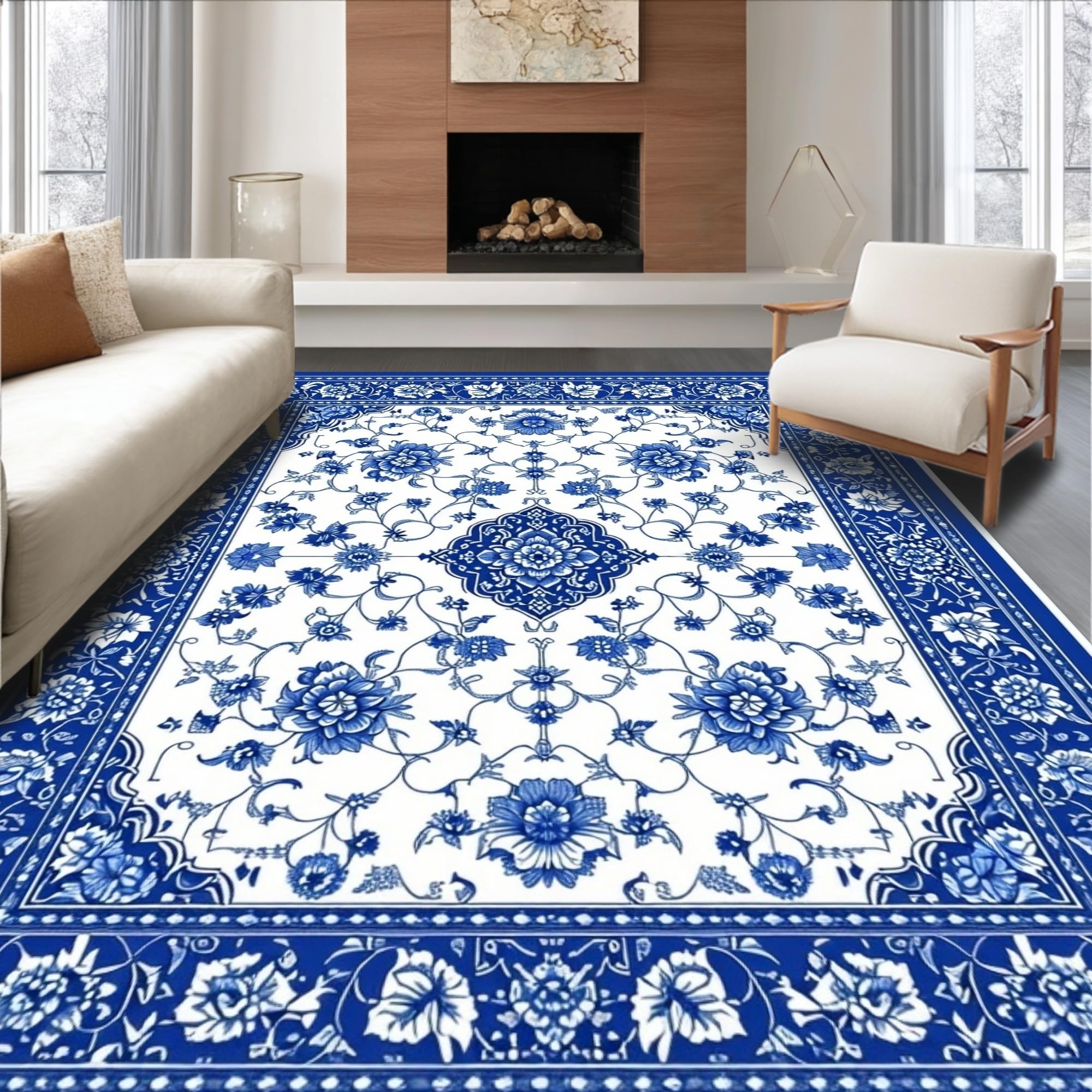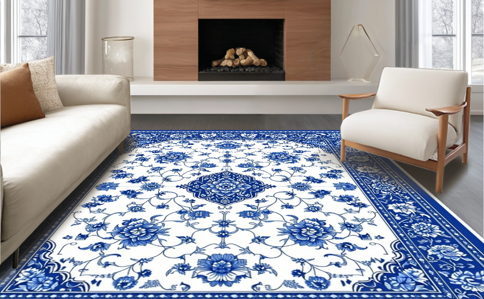 Ultra Soft Area Rug, Non Slip, Stain Resistant, Washable Area Rugs for Living Room, Bedroom, Elegant Blue Porcelain Floral Motif(Blue) Overview: