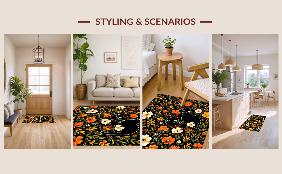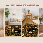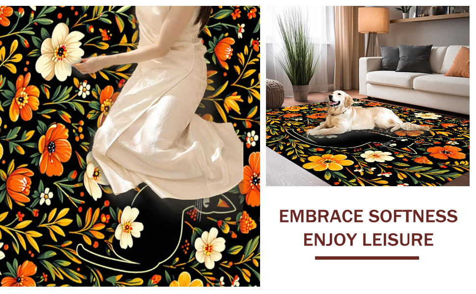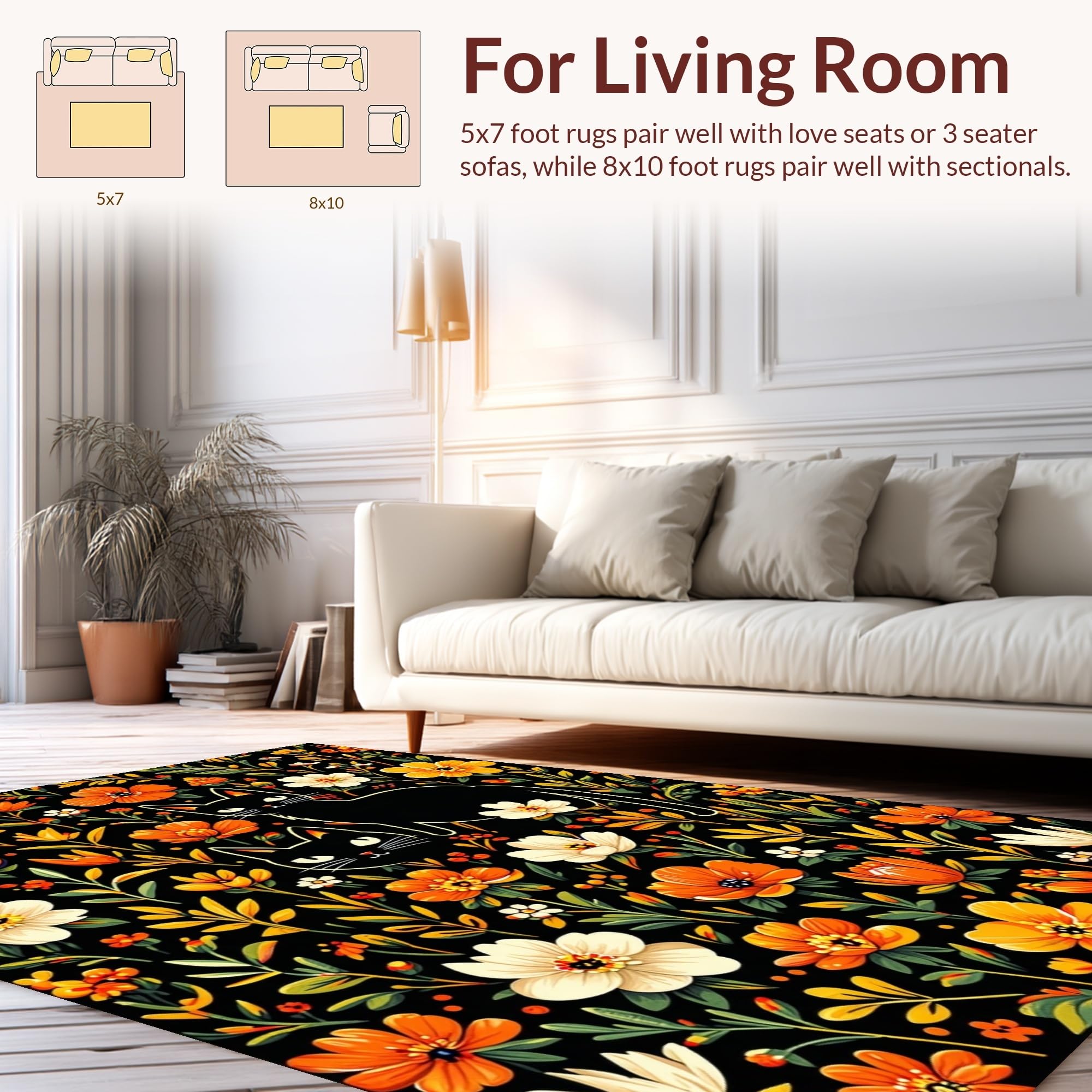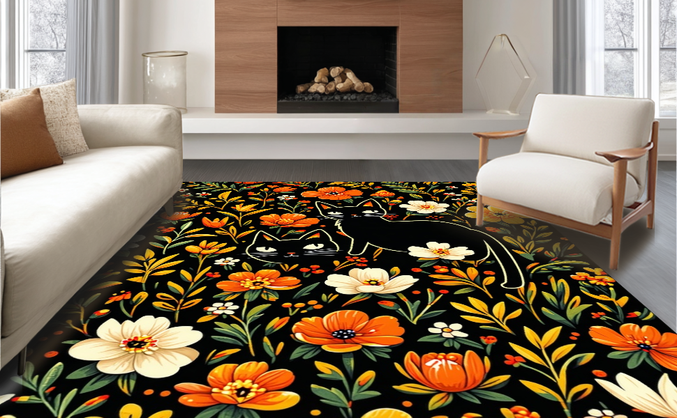 Ultra Soft Area Rug, Non Slip, Stain Resistant, Washable Area Rugs for Living Room, Bedroom, Elegant Cat and Floral Fusion(Black) Overview: