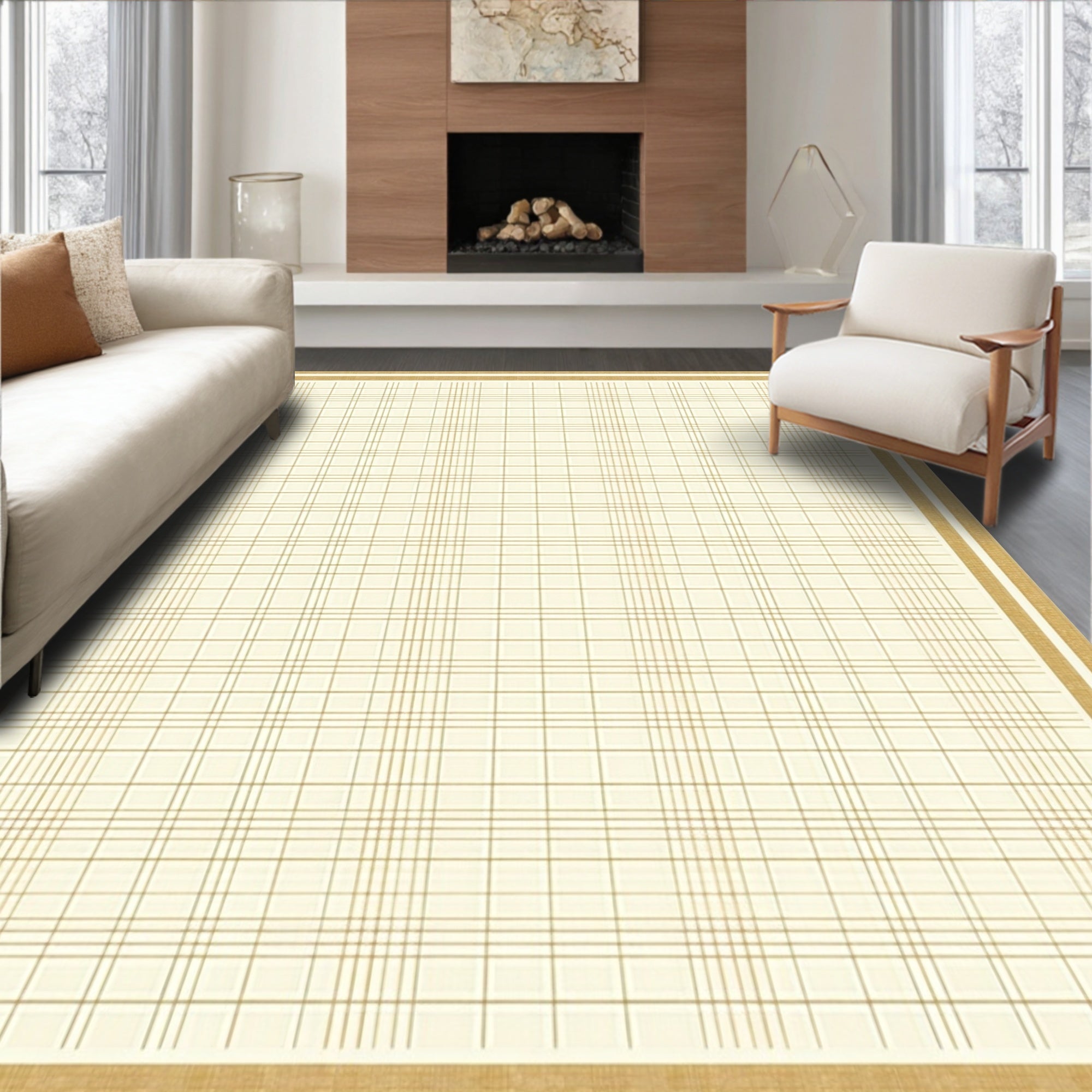 Ultra Soft Area Rug, Non Slip, Stain Resistant, Washable Area Rugs for Living Room, Bedroom, Elegant Cream Camel Grid Area Non Slip Geometric(Beige) Overview: