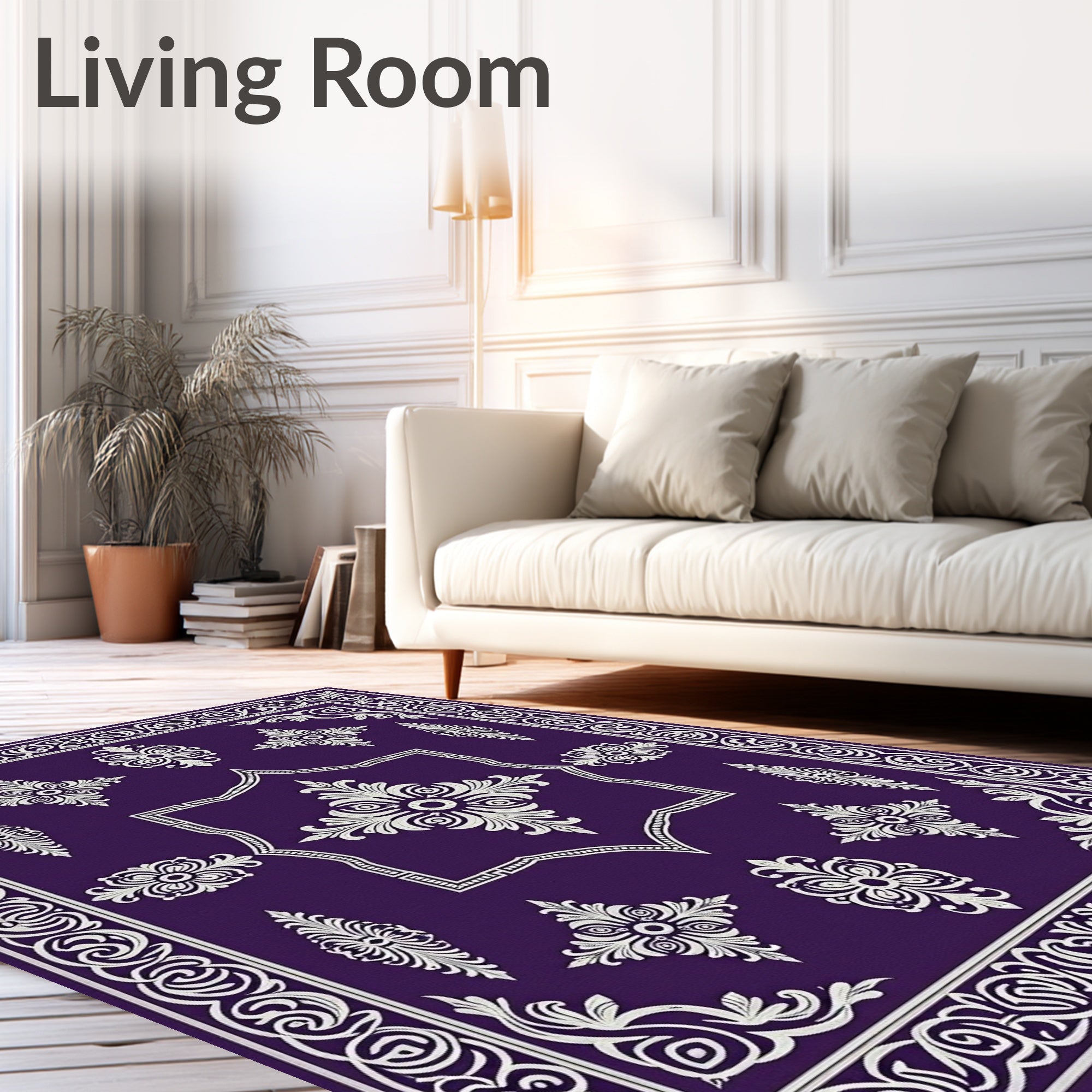 Ultra Soft Area Rug, Non Slip, Stain Resistant, Washable Area Rugs for Living Room, Bedroom, Elegant Damask Flourish Jacquard Symmetrical(Purple) Overview: