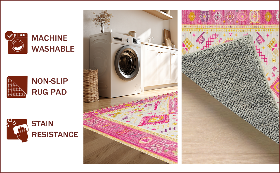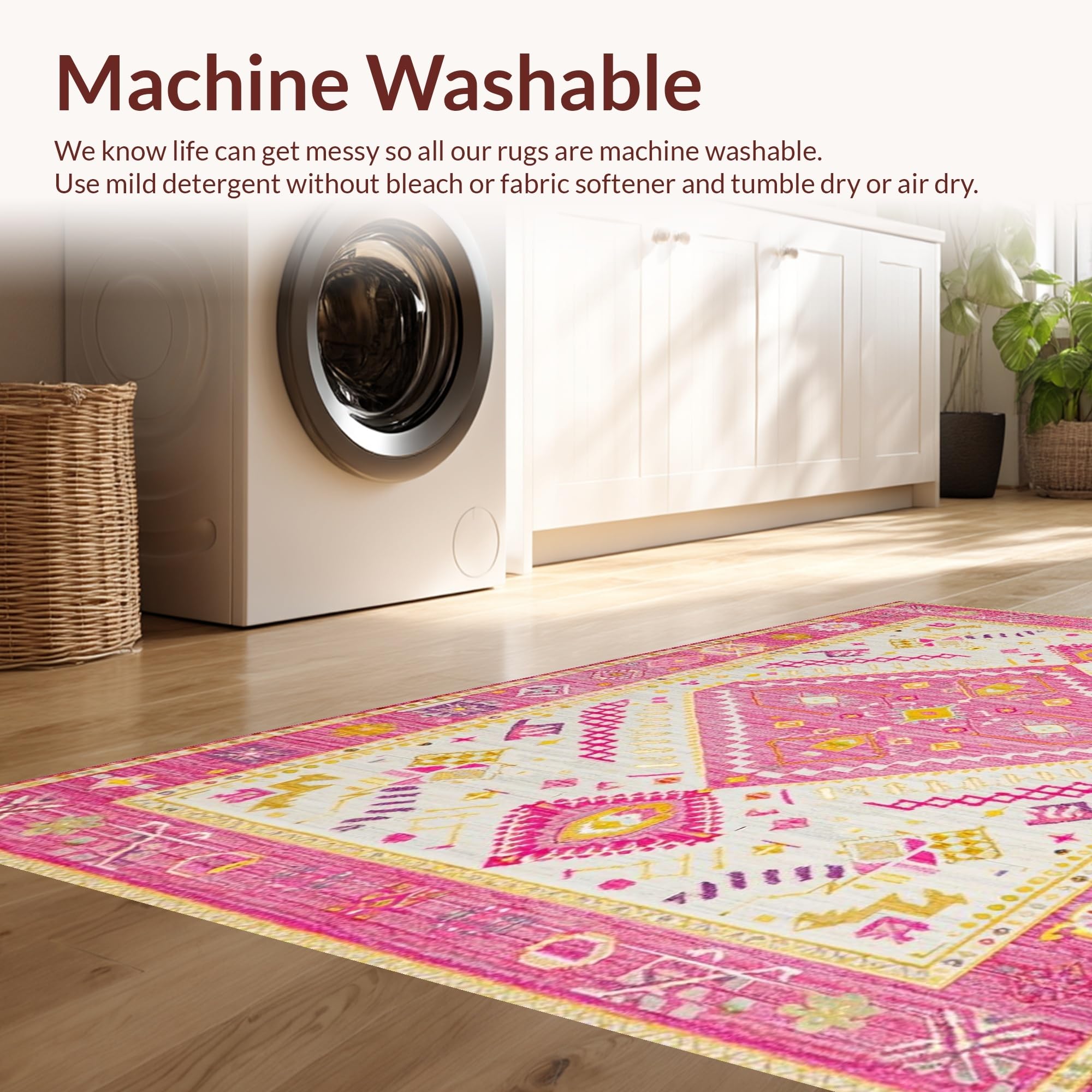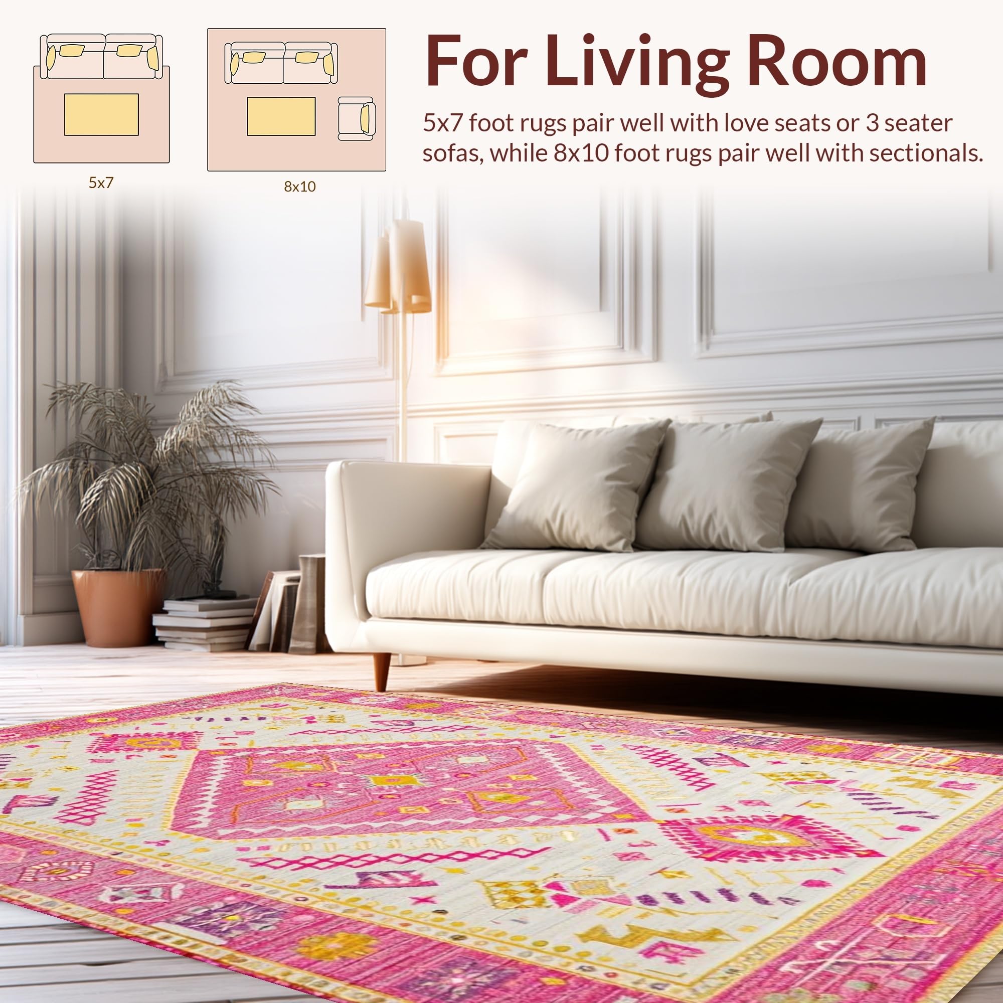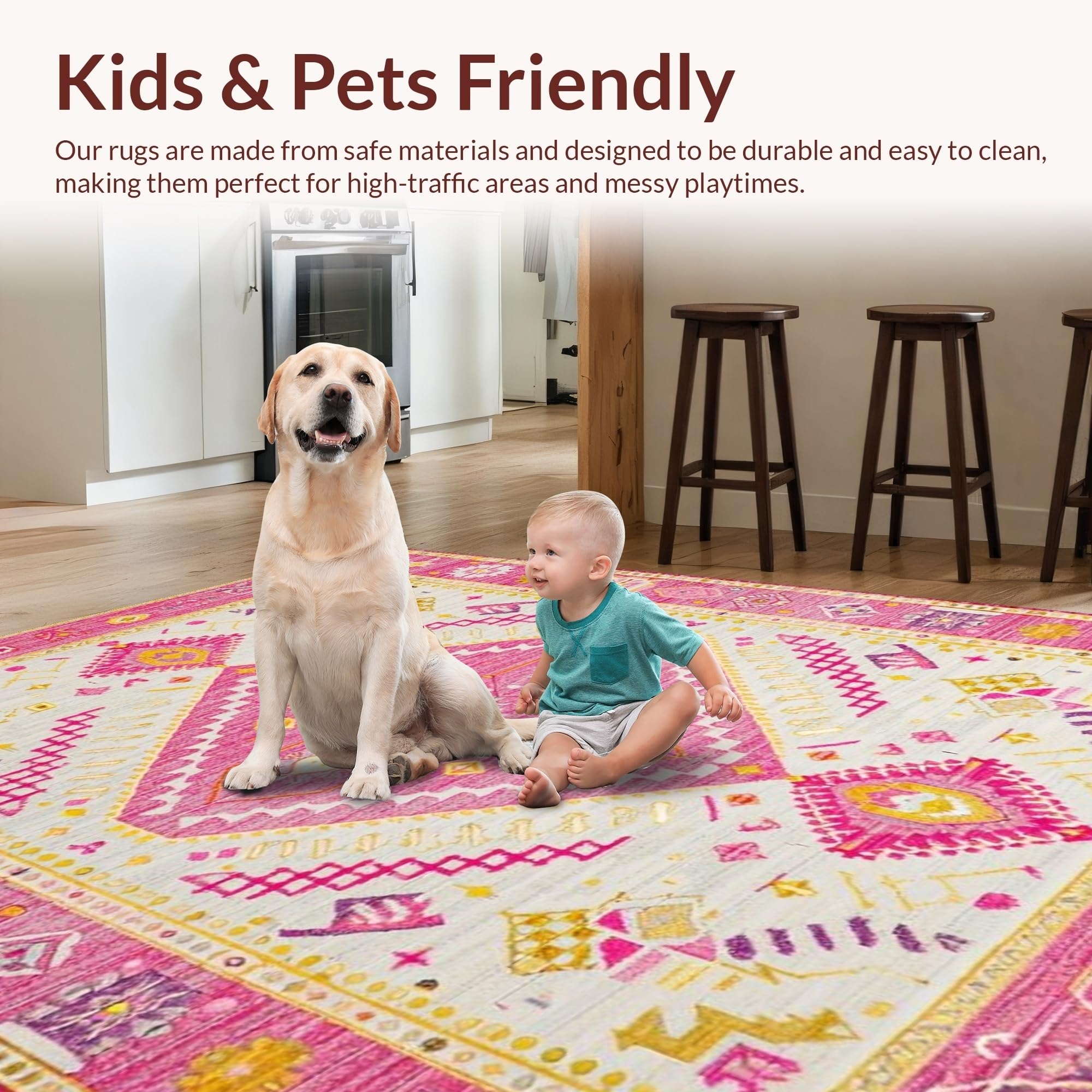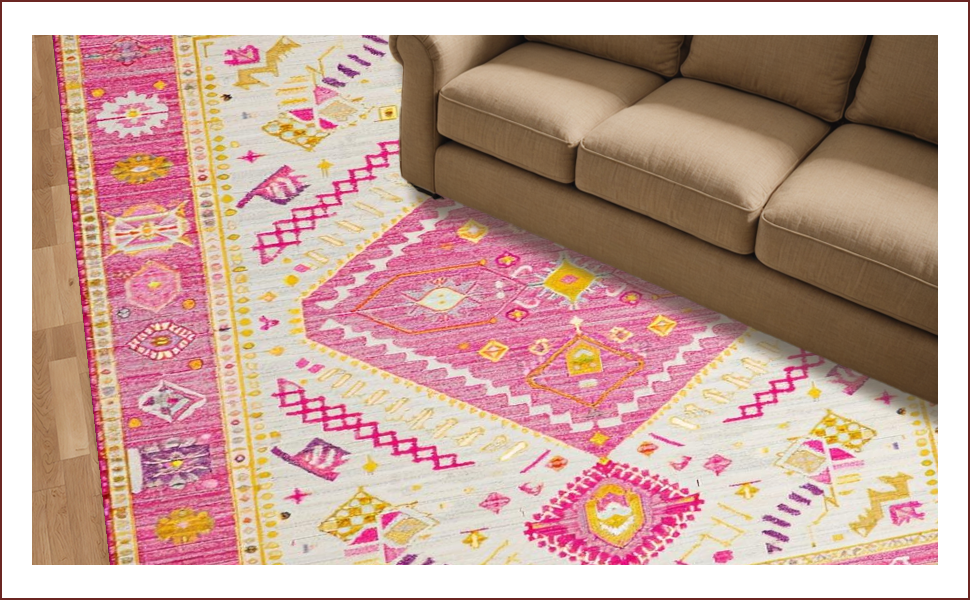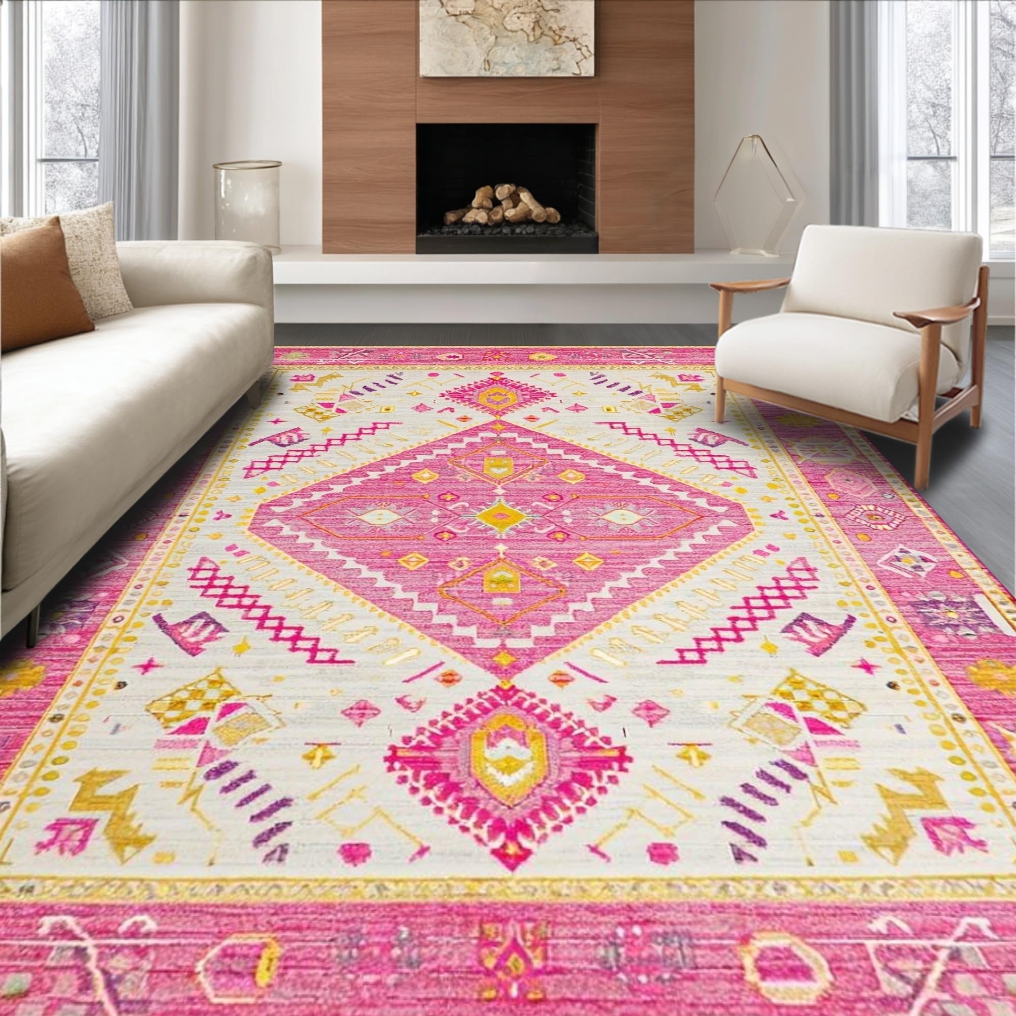 Ultra Soft Area Rug, Non Slip, Stain Resistant, Washable Area Rugs for Living Room, Bedroom, Elegant Earthy Geometric Details(Pink) Overview: