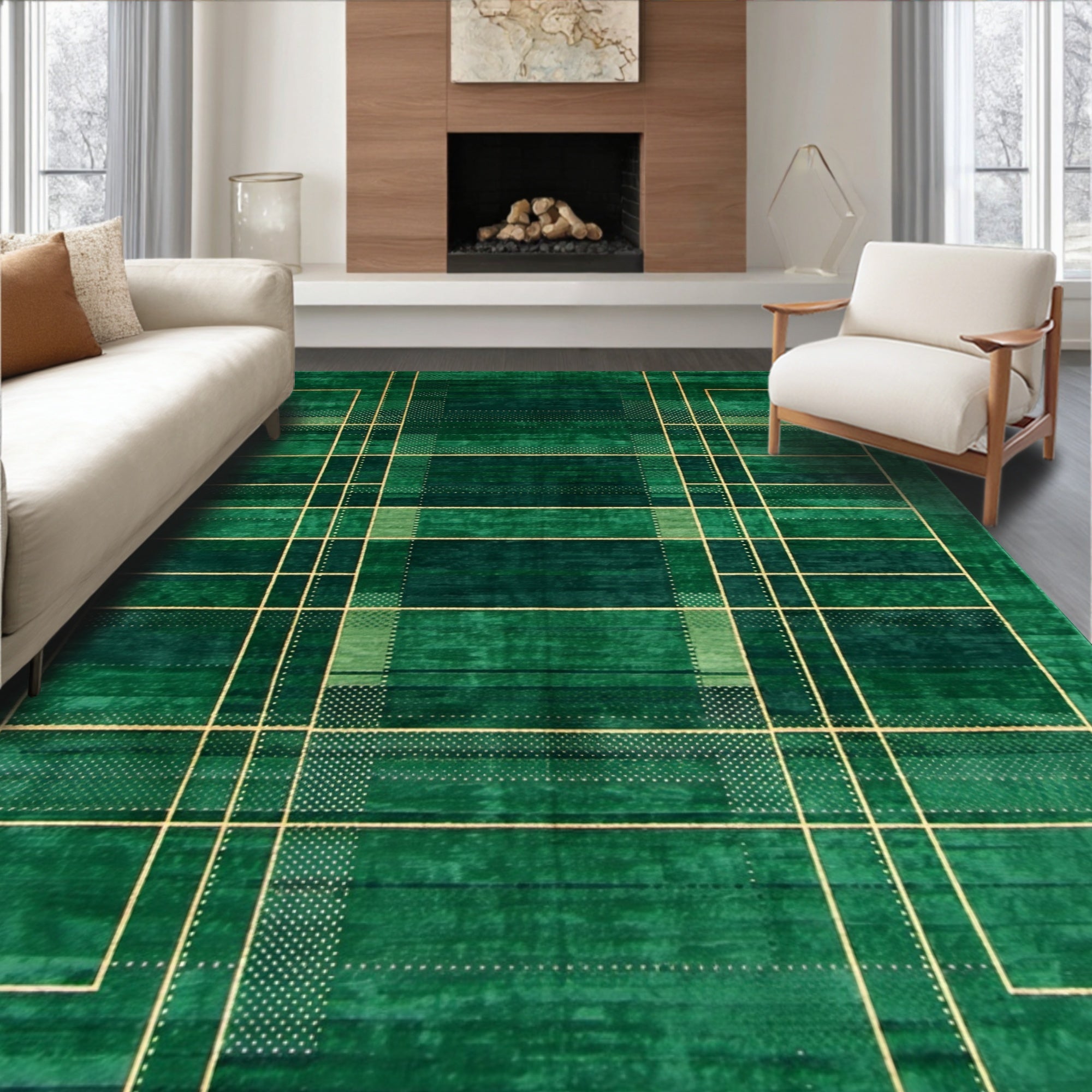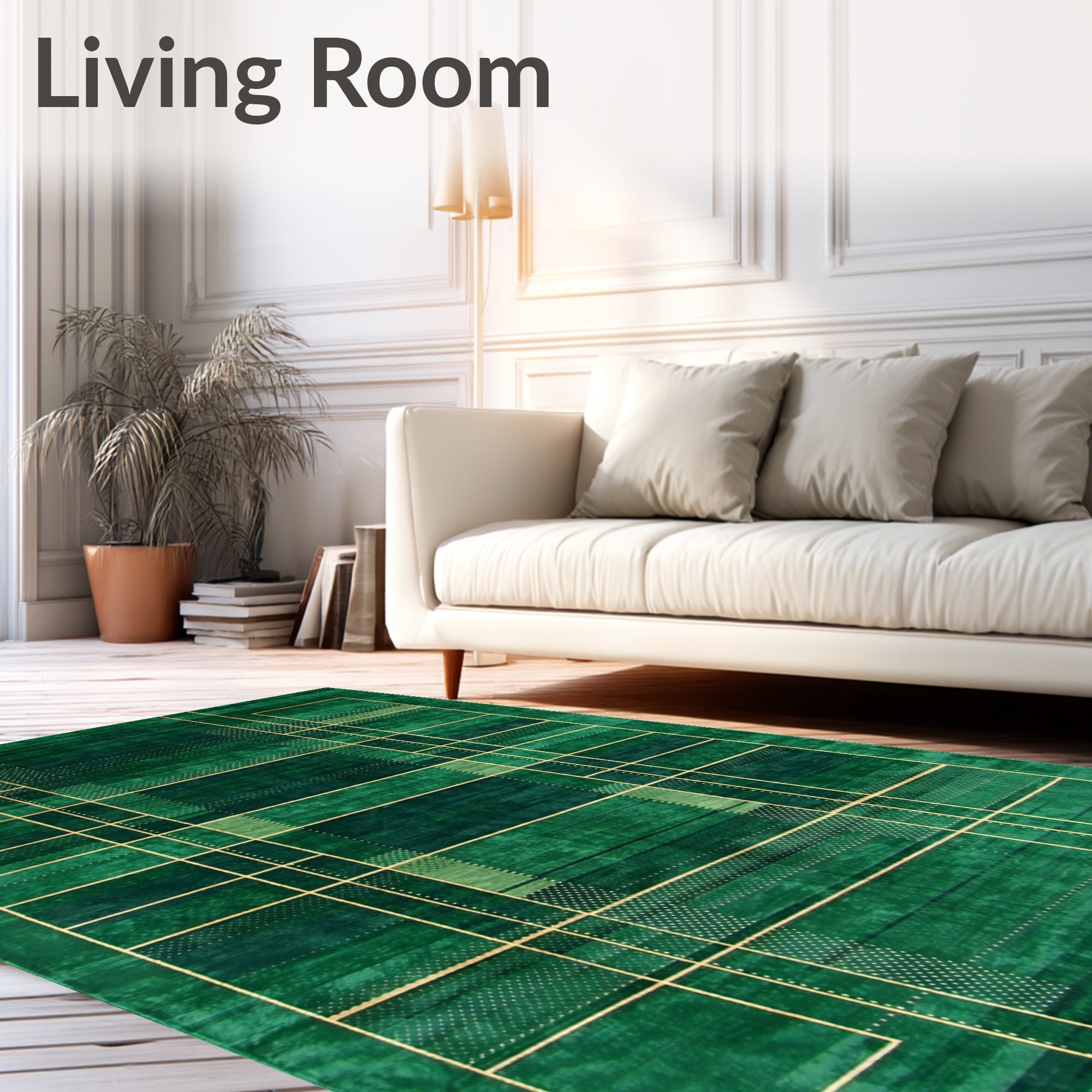 Ultra Soft Area Rug, Non Slip, Stain Resistant, Washable Area Rugs for Living Room, Bedroom, Elegant Emerald Green and Gold Abstract Area with Bold Shapes(Green) Overview: