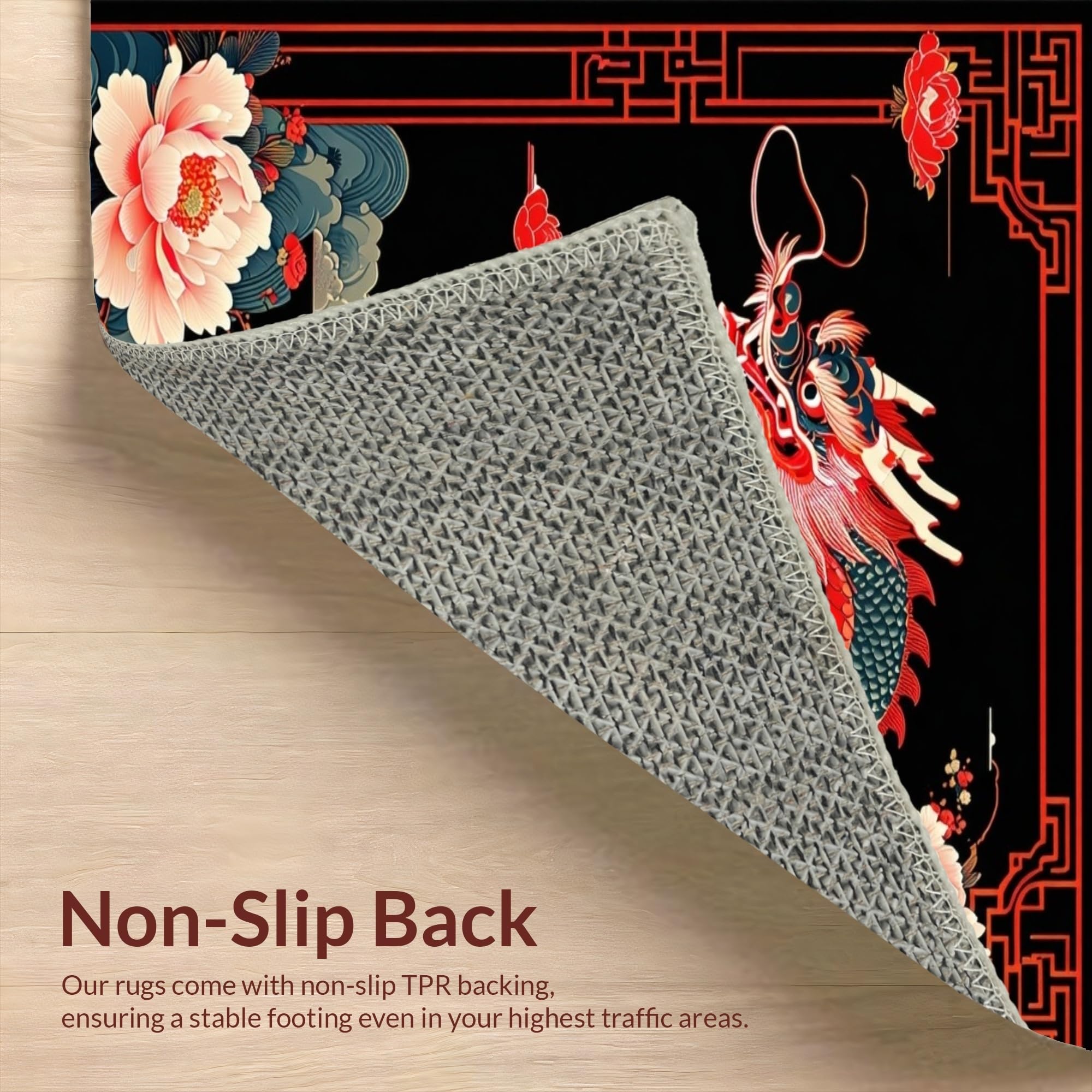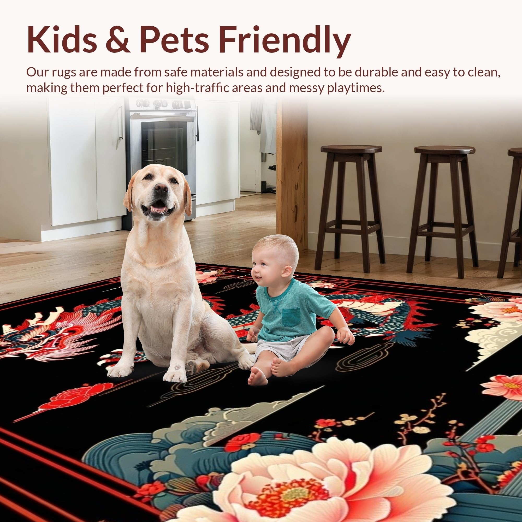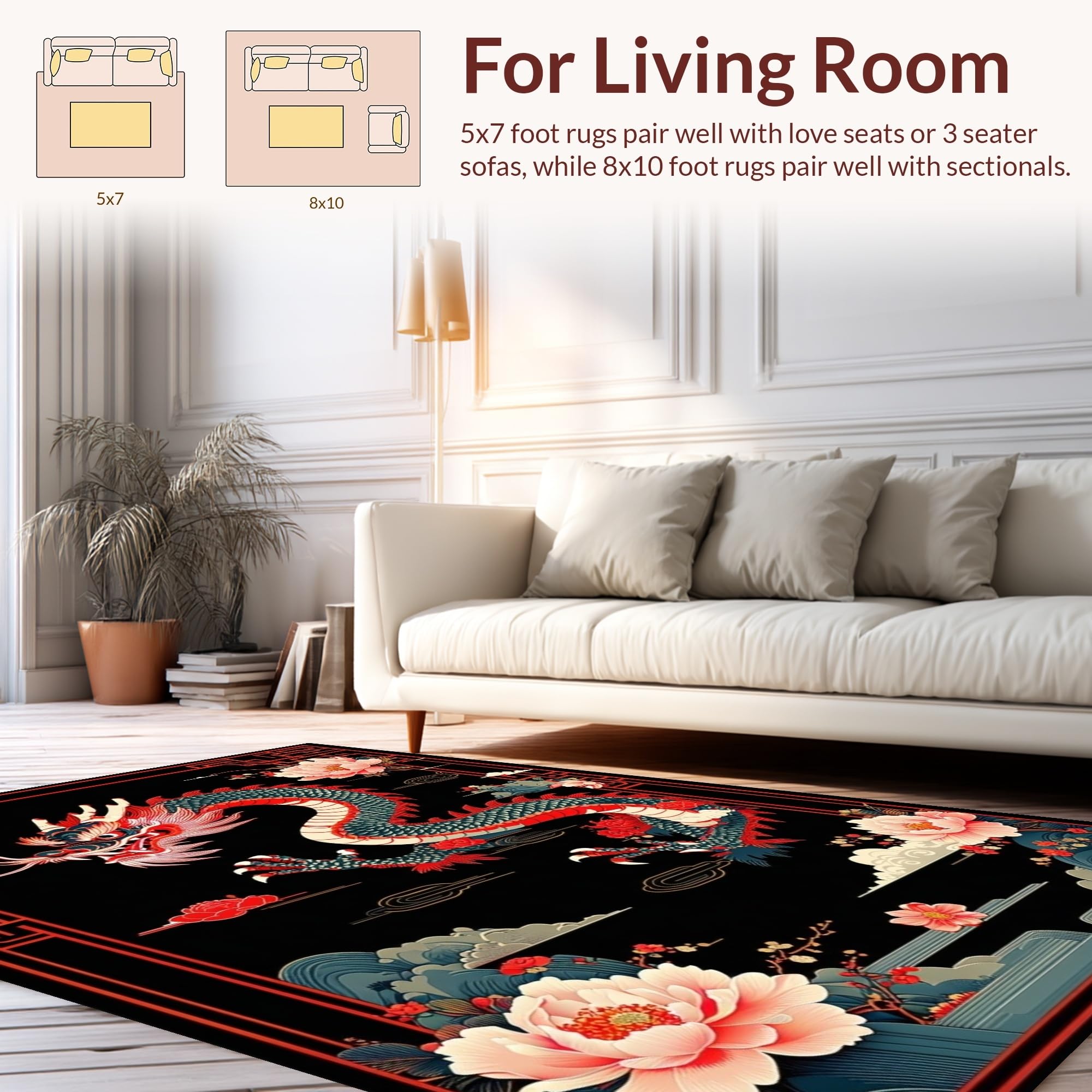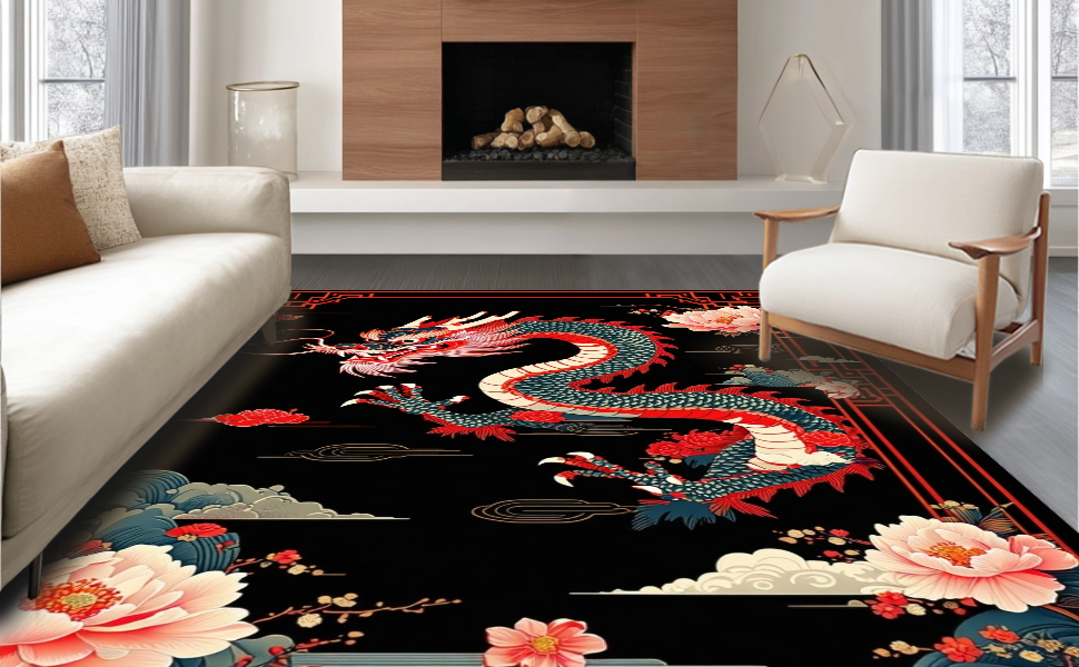 Ultra Soft Area Rug, Non Slip, Stain Resistant, Washable Area Rugs for Living Room, Bedroom, Elegant Floral Dragon Aesthetic(Black) Overview: