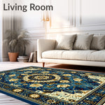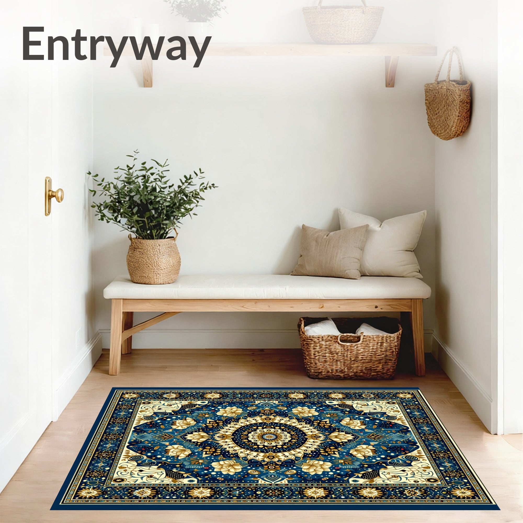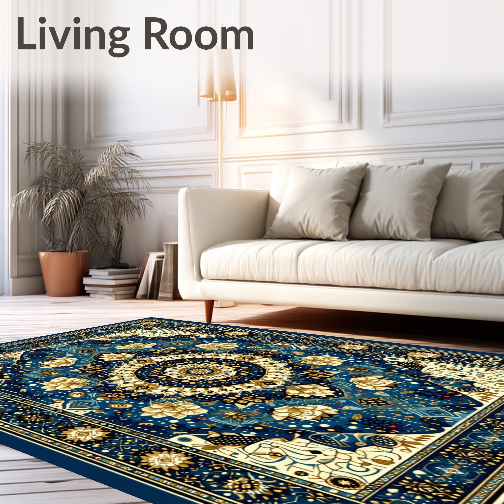 Ultra Soft Area Rug, Non Slip, Stain Resistant, Washable Area Rugs for Living Room, Bedroom, Elegant Geometric Area with Intricate Design in Blue and Gold(Blue) Overview: