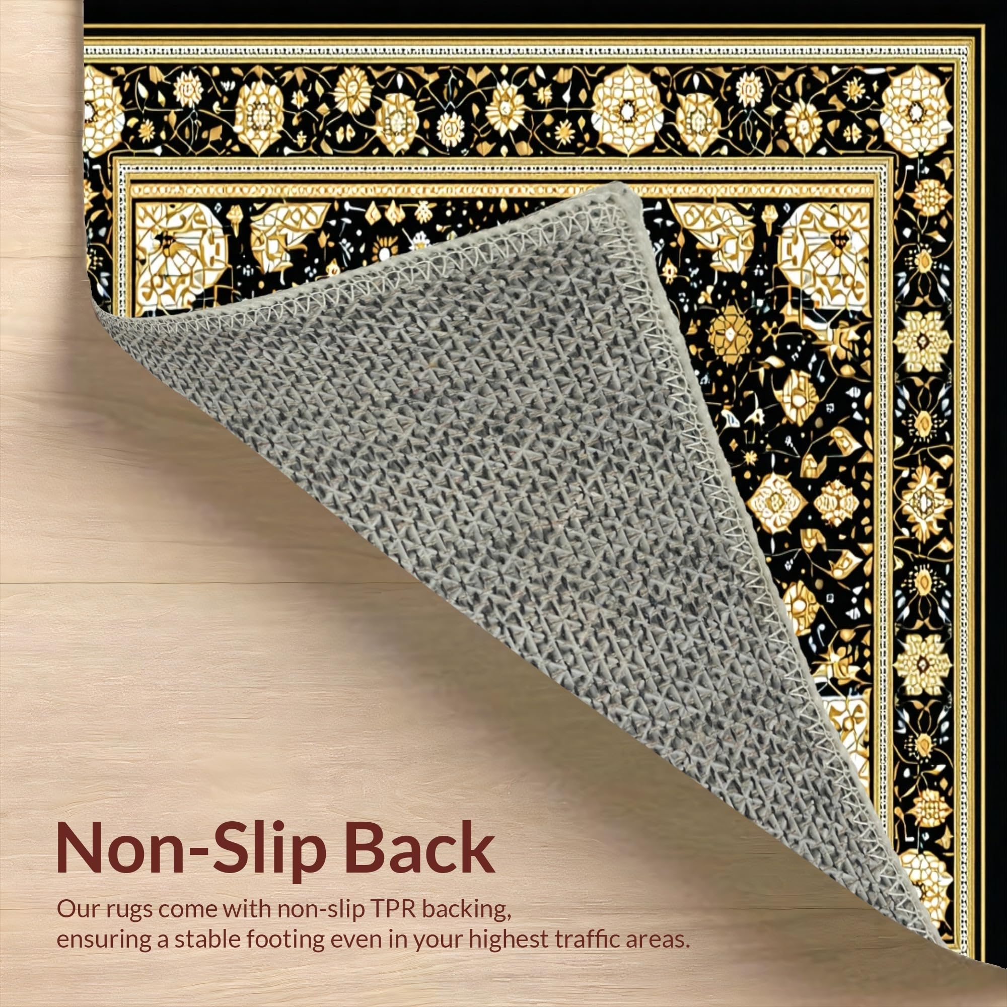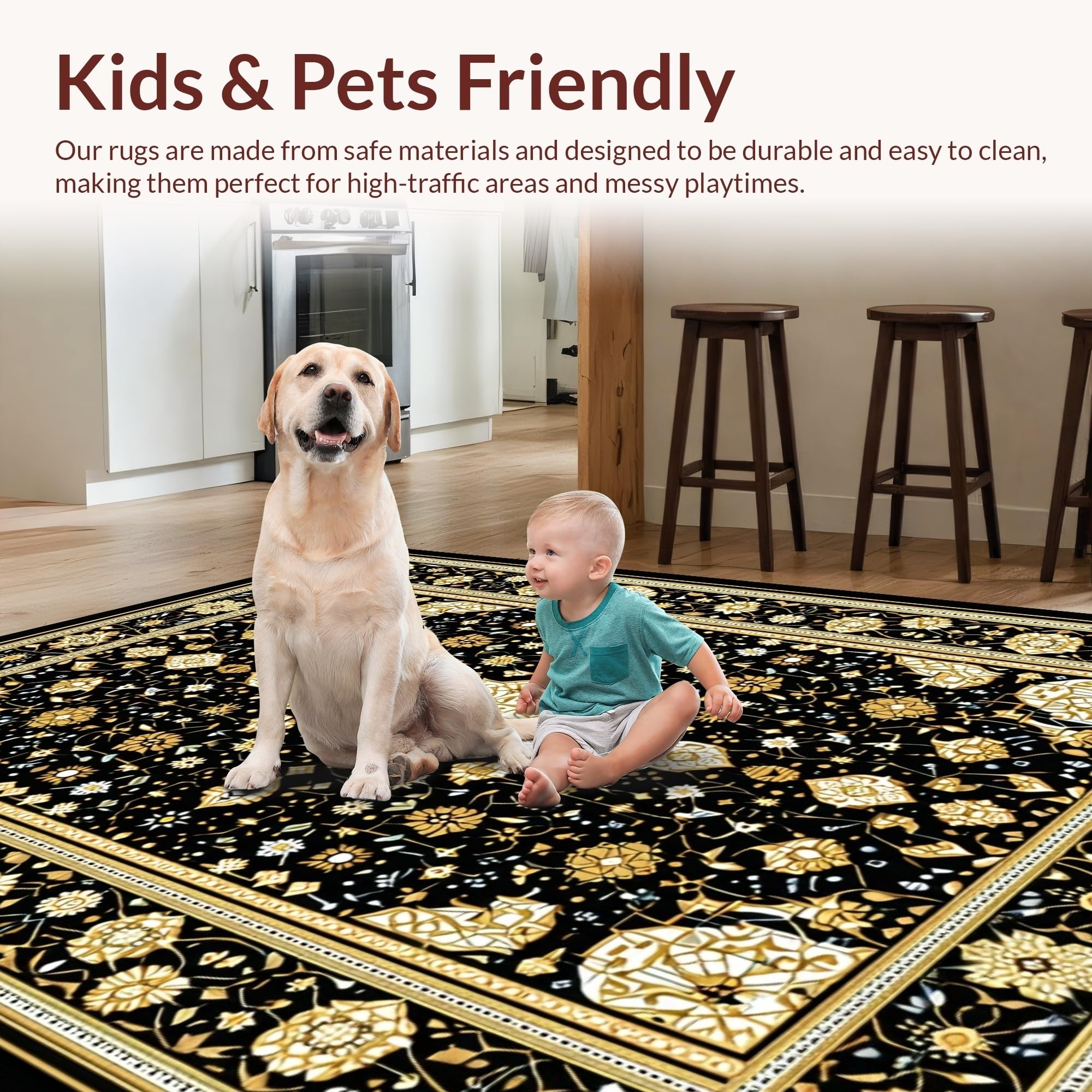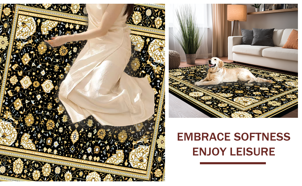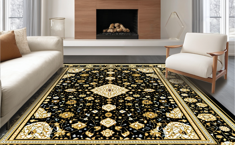 Ultra Soft Area Rug, Non Slip, Stain Resistant, Washable Area Rugs for Living Room, Bedroom, Elegant Gold Medallion Pattern(Black) Overview: