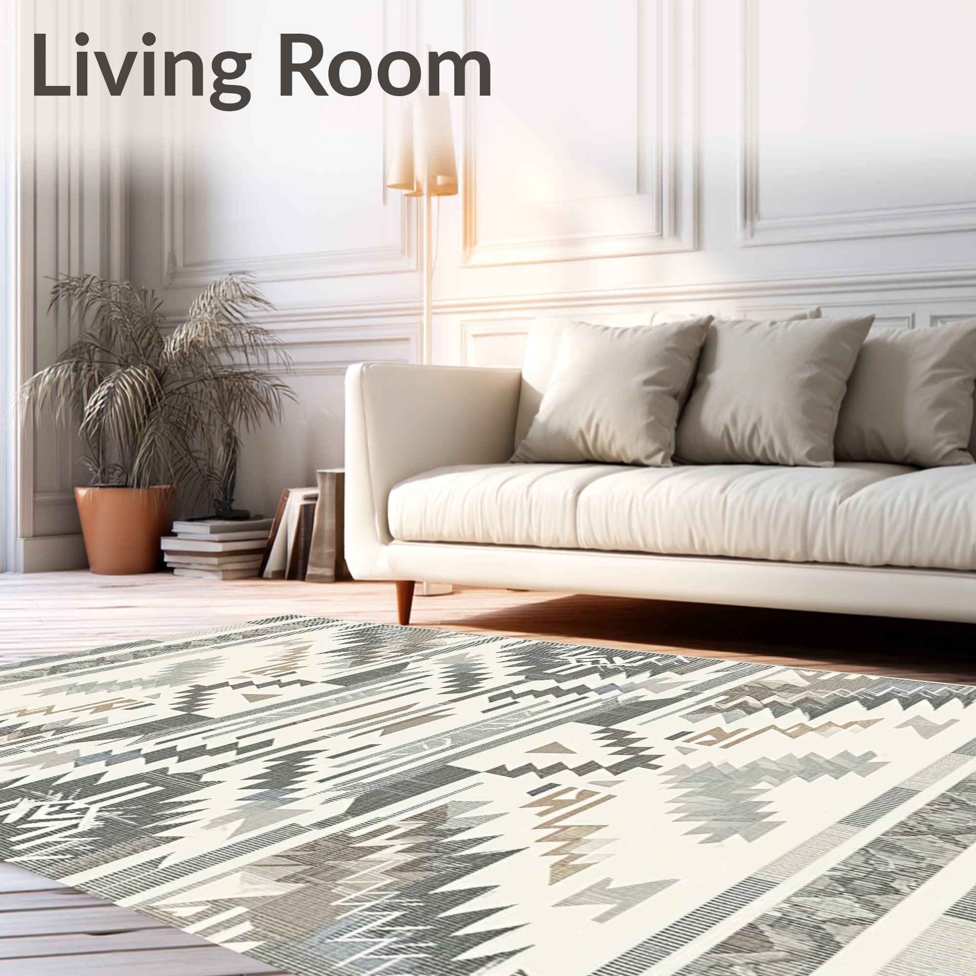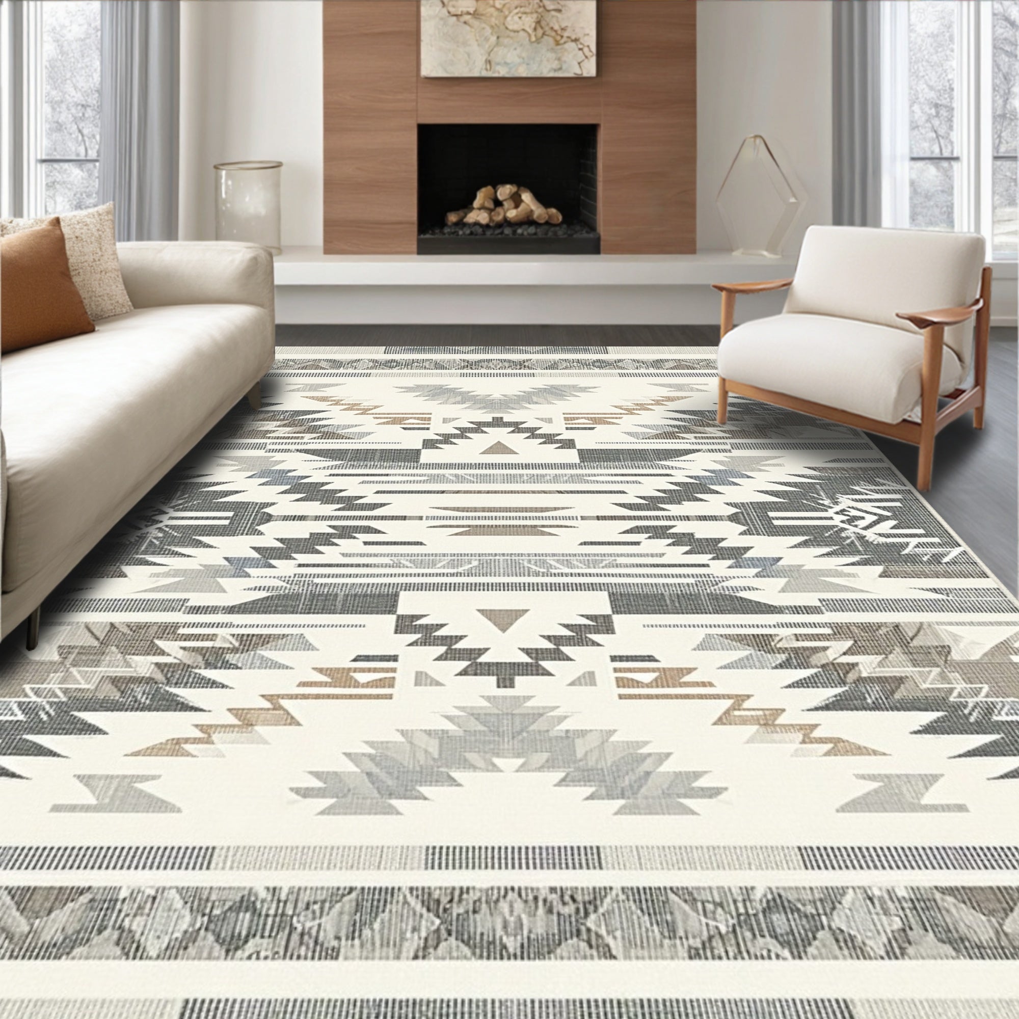 Ultra Soft Area Rug, Non Slip, Stain Resistant, Washable Area Rugs for Living Room, Bedroom, Elegant Greige Aztec Patterned With Layered Linear And Chevron Details(Gray) Overview: