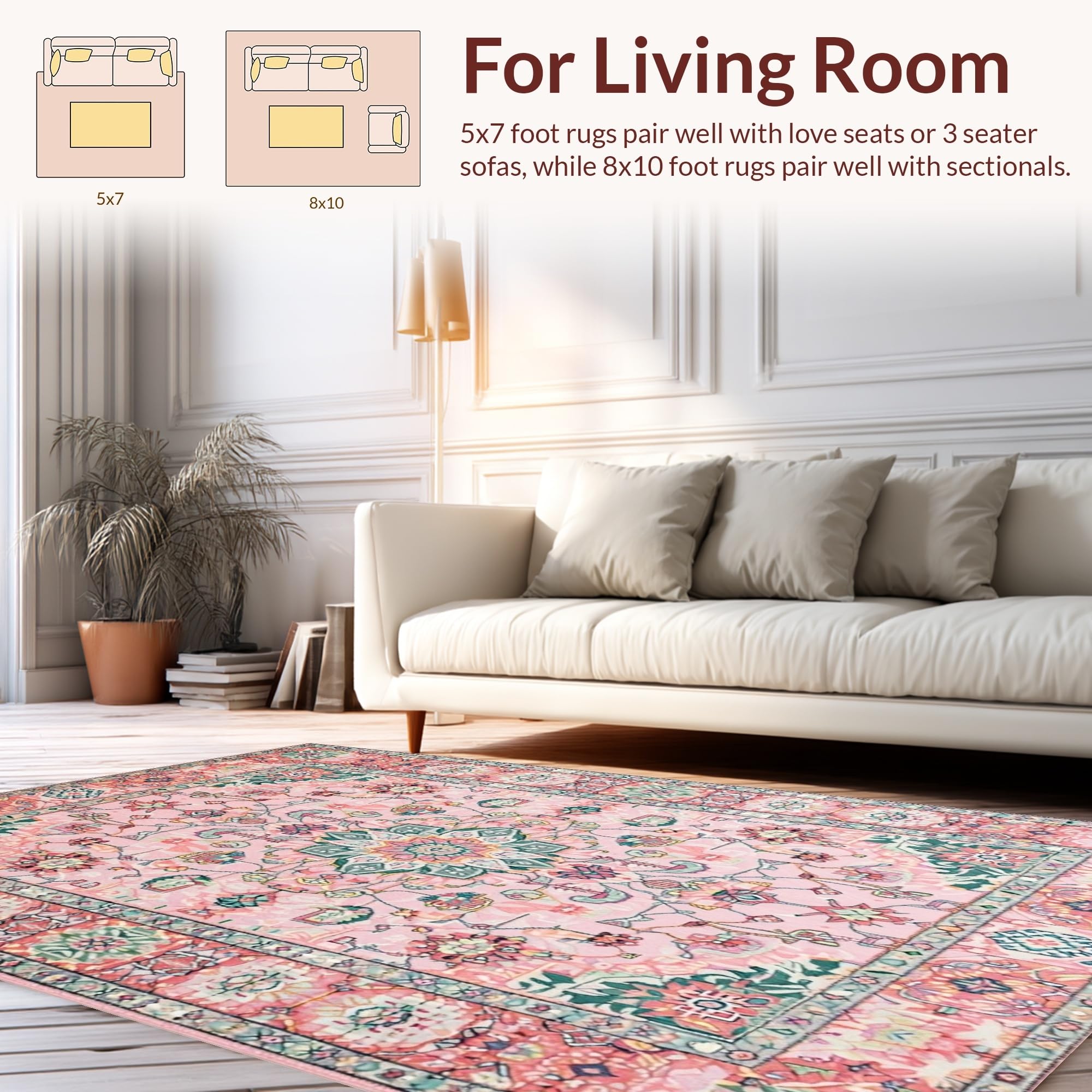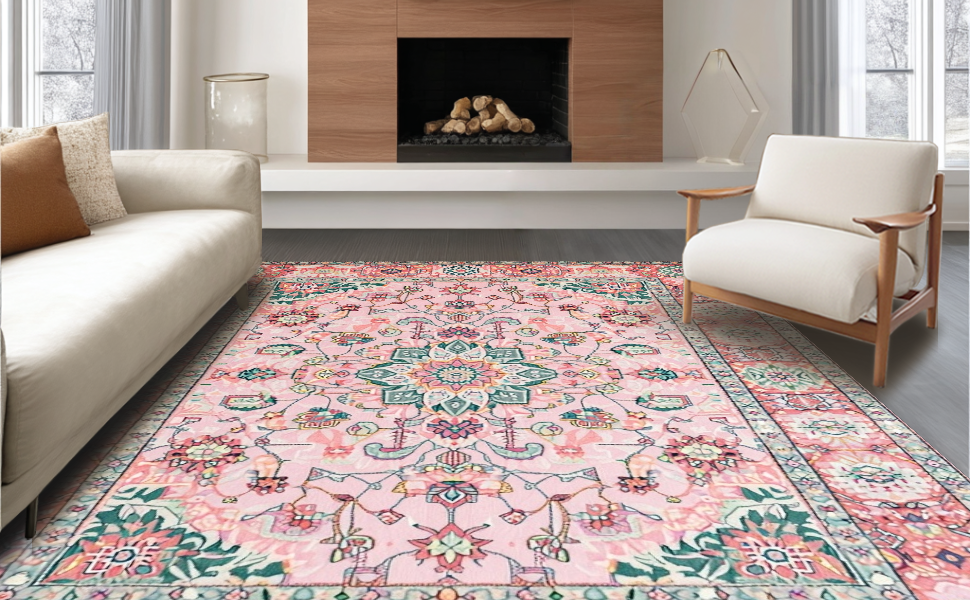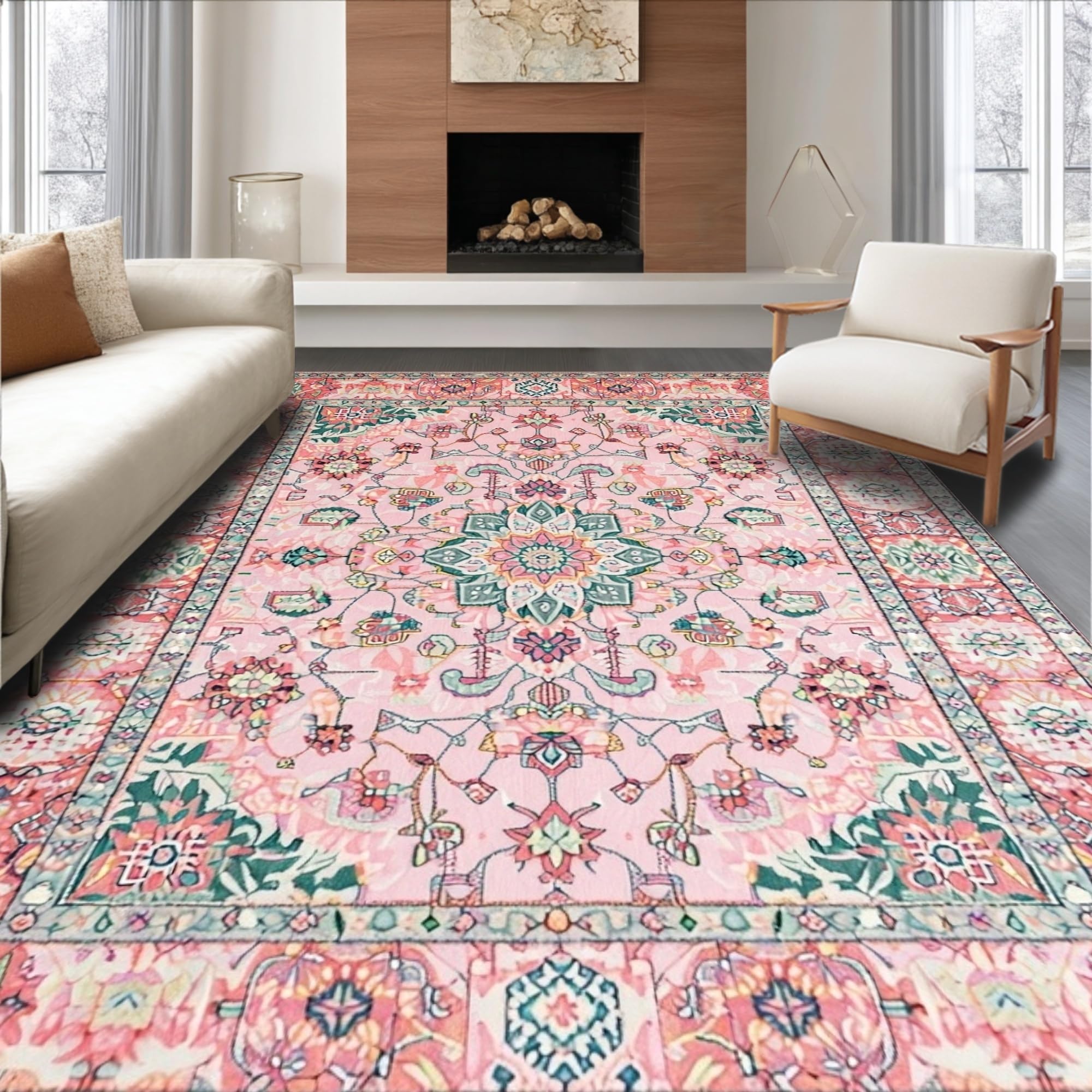 Ultra Soft Area Rug, Non Slip, Stain Resistant, Washable Area Rugs for Living Room, Bedroom, Elegant Medallion Rose Palette(Pink) Overview: