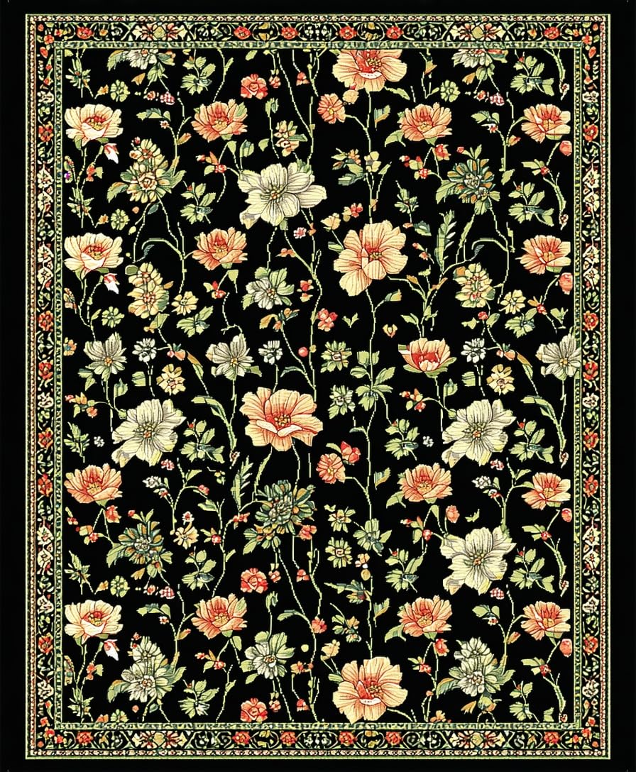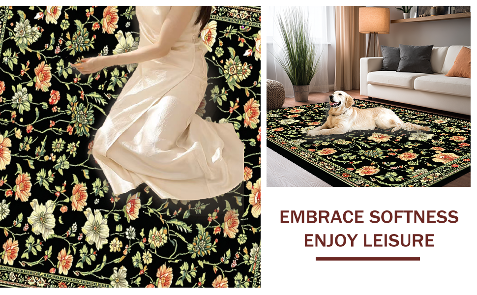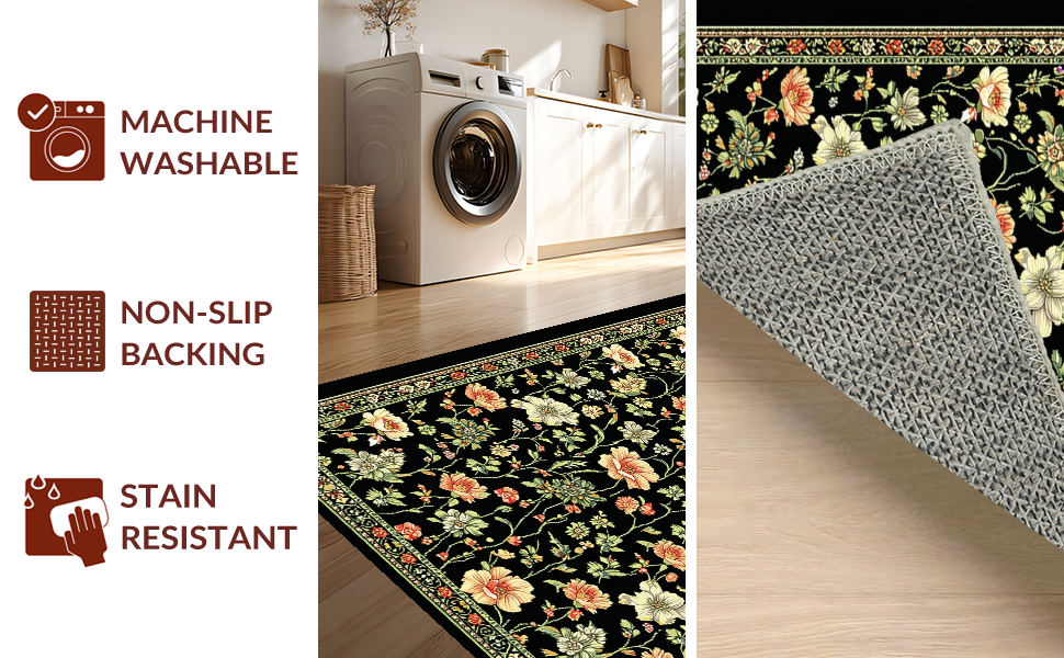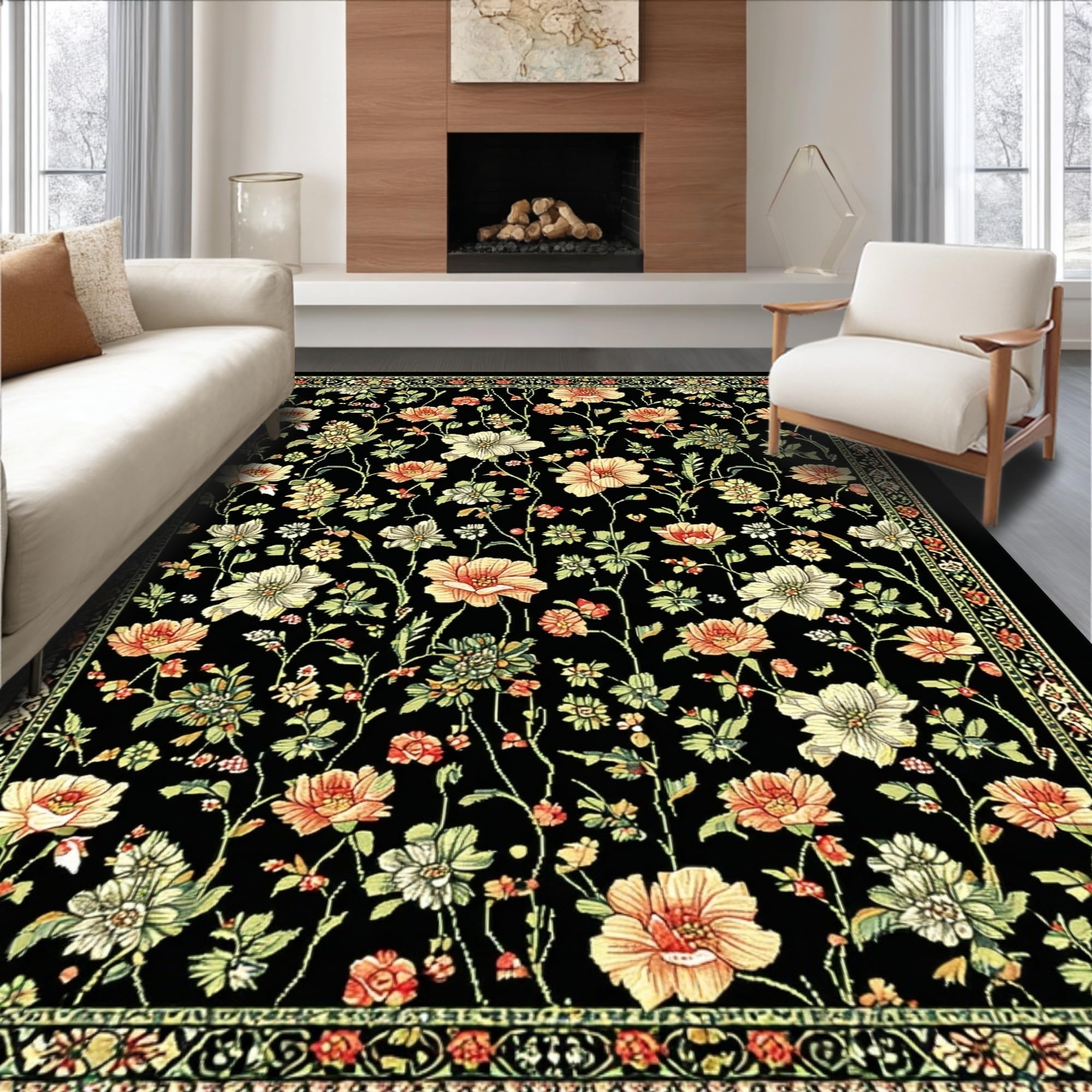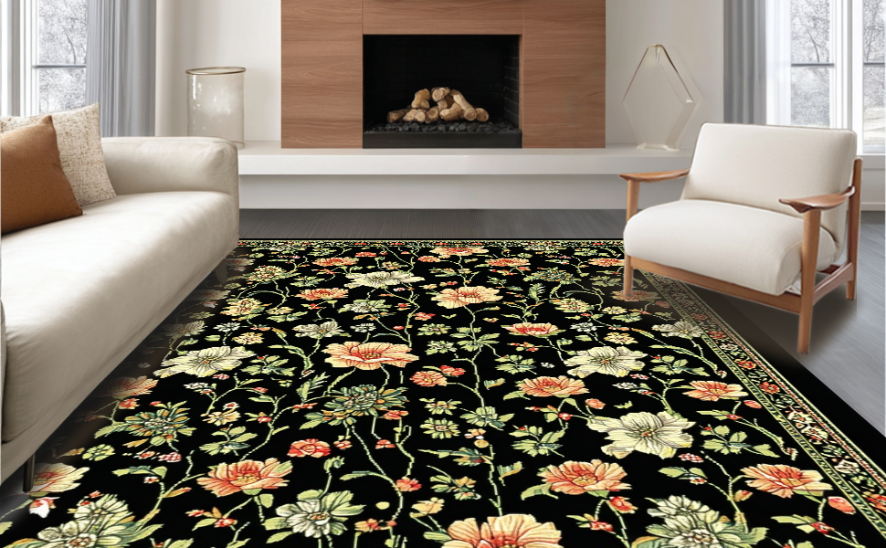 Ultra Soft Area Rug, Non Slip, Stain Resistant, Washable Area Rugs for Living Room, Bedroom, Elegant Monochrome Flower Arrangement(Black) Overview: