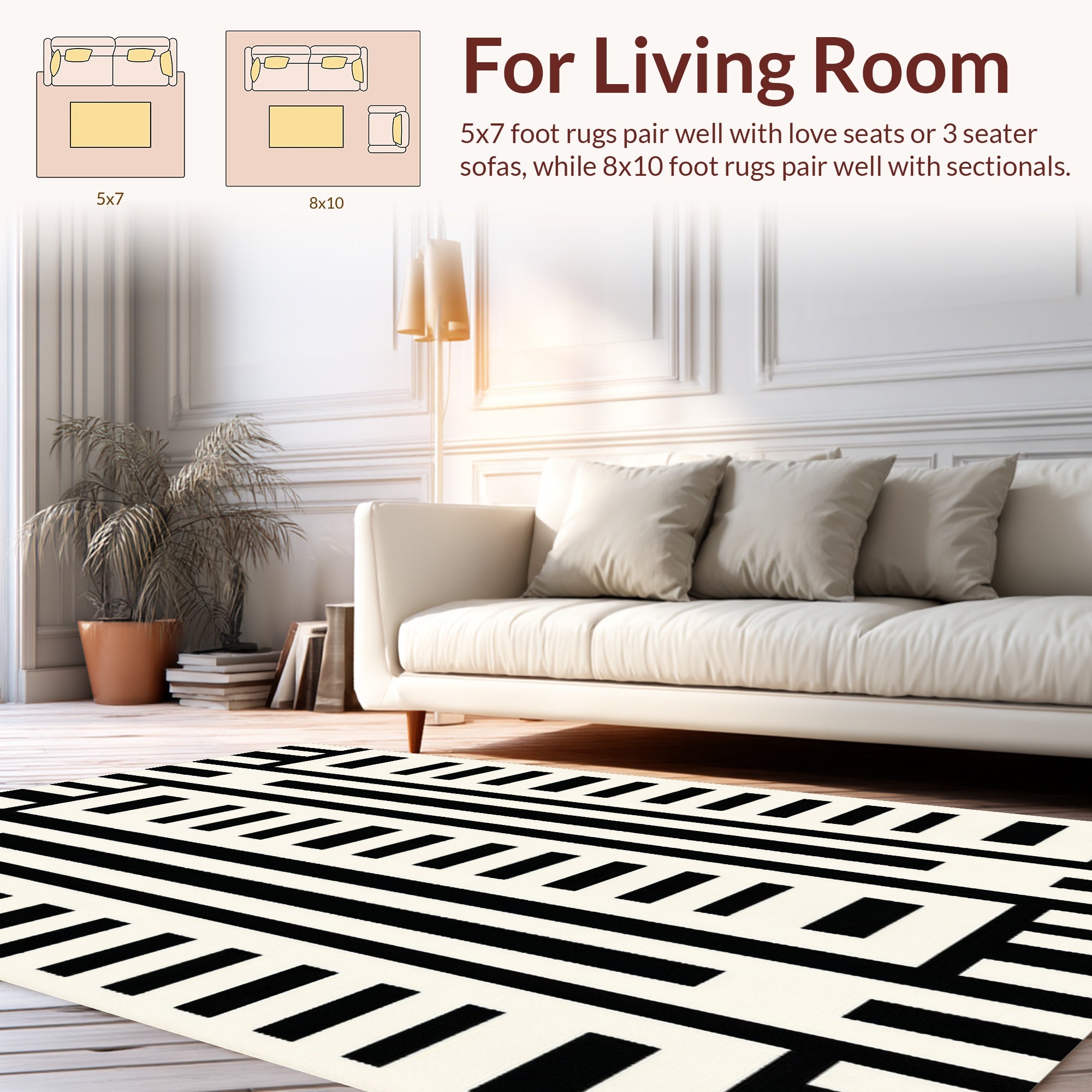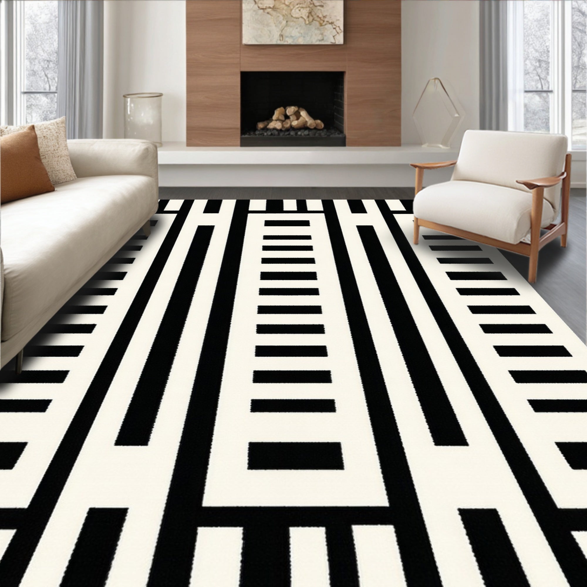 Ultra Soft Area Rug, Non Slip, Stain Resistant, Washable Area Rugs for Living Room, Bedroom, Elegant Monochrome Striped Area Rug with Retro Vibes and Geometric Design(Beige) Overview: