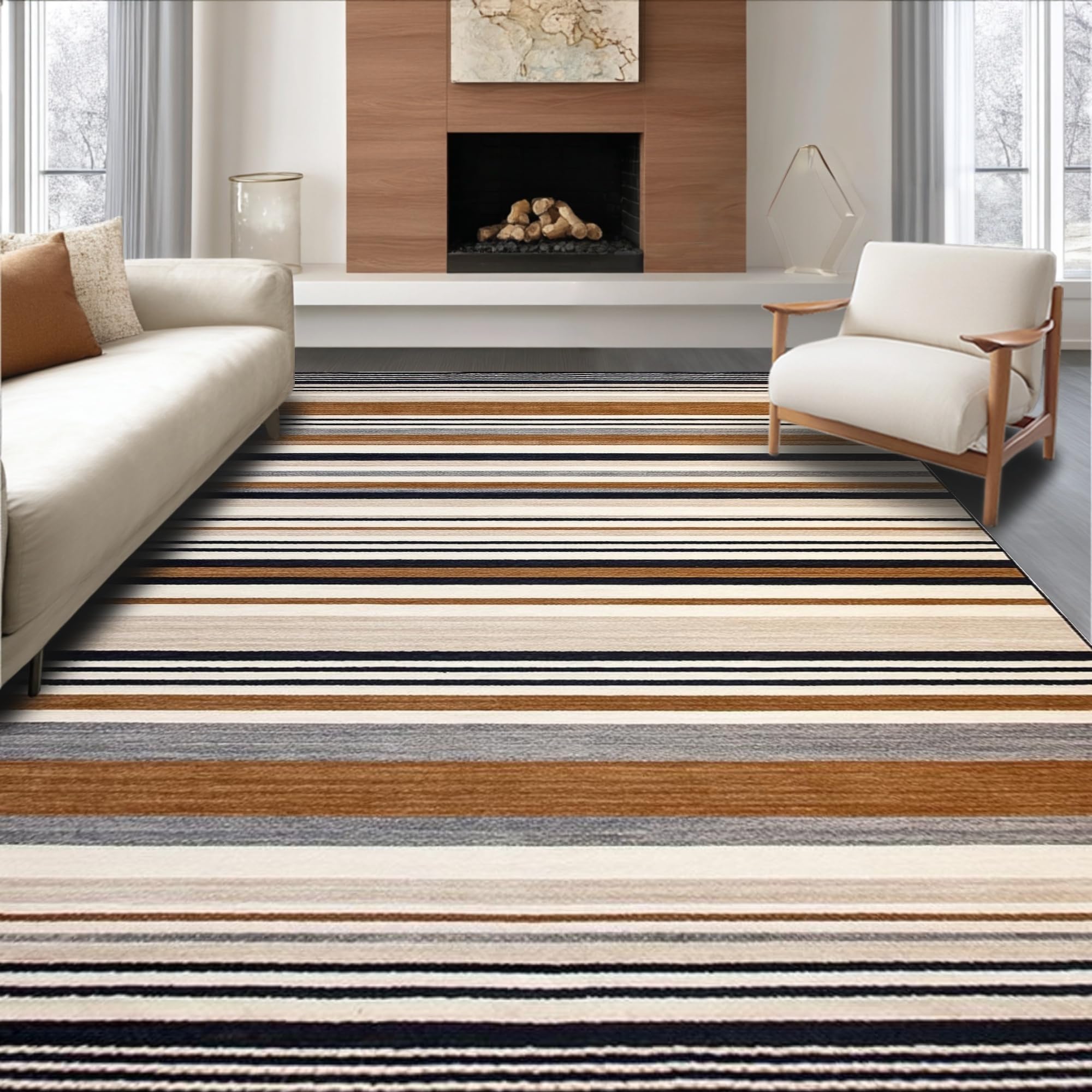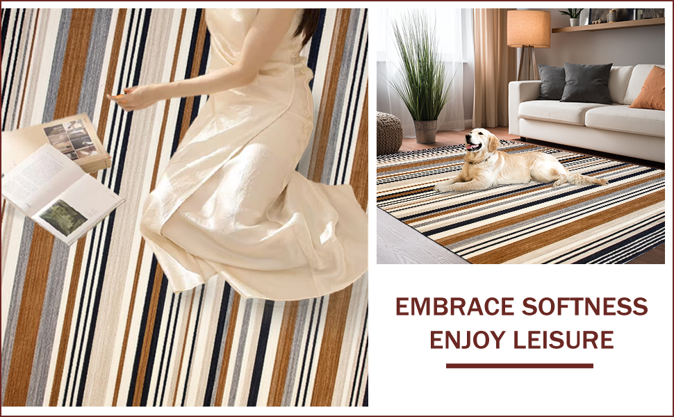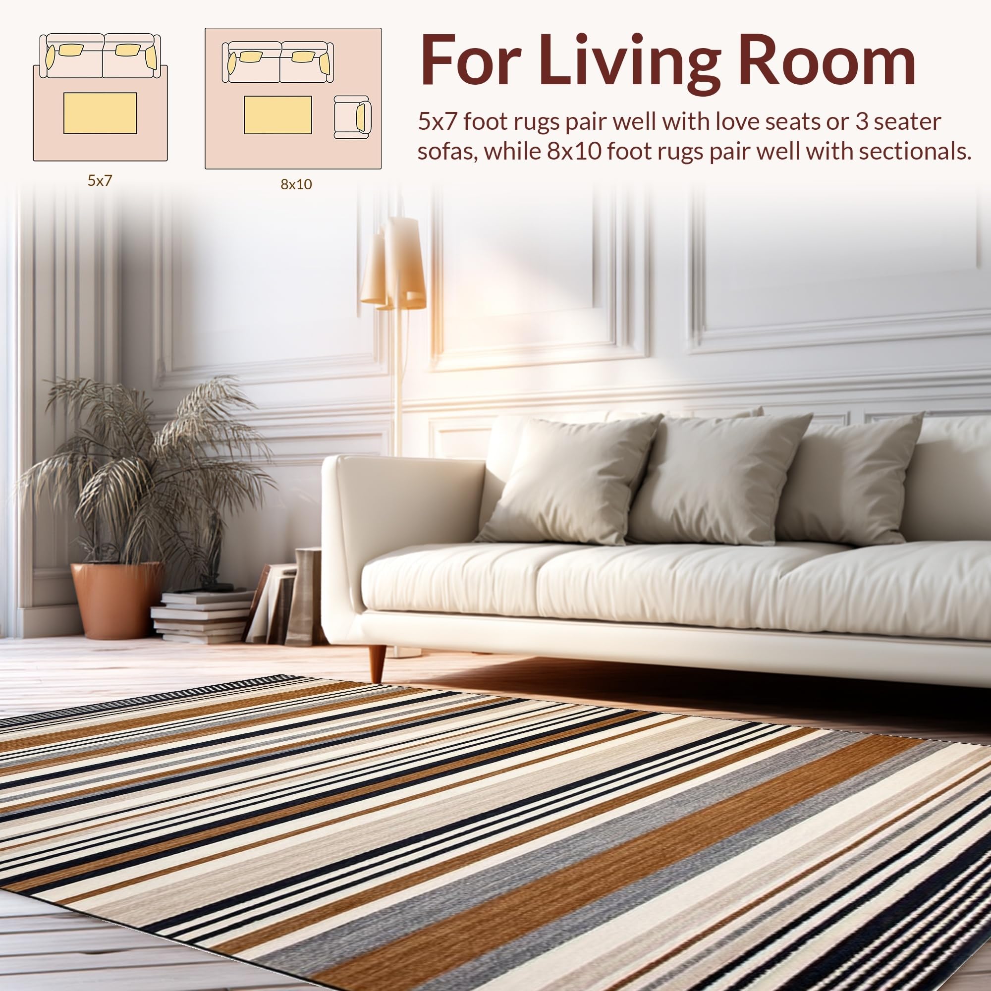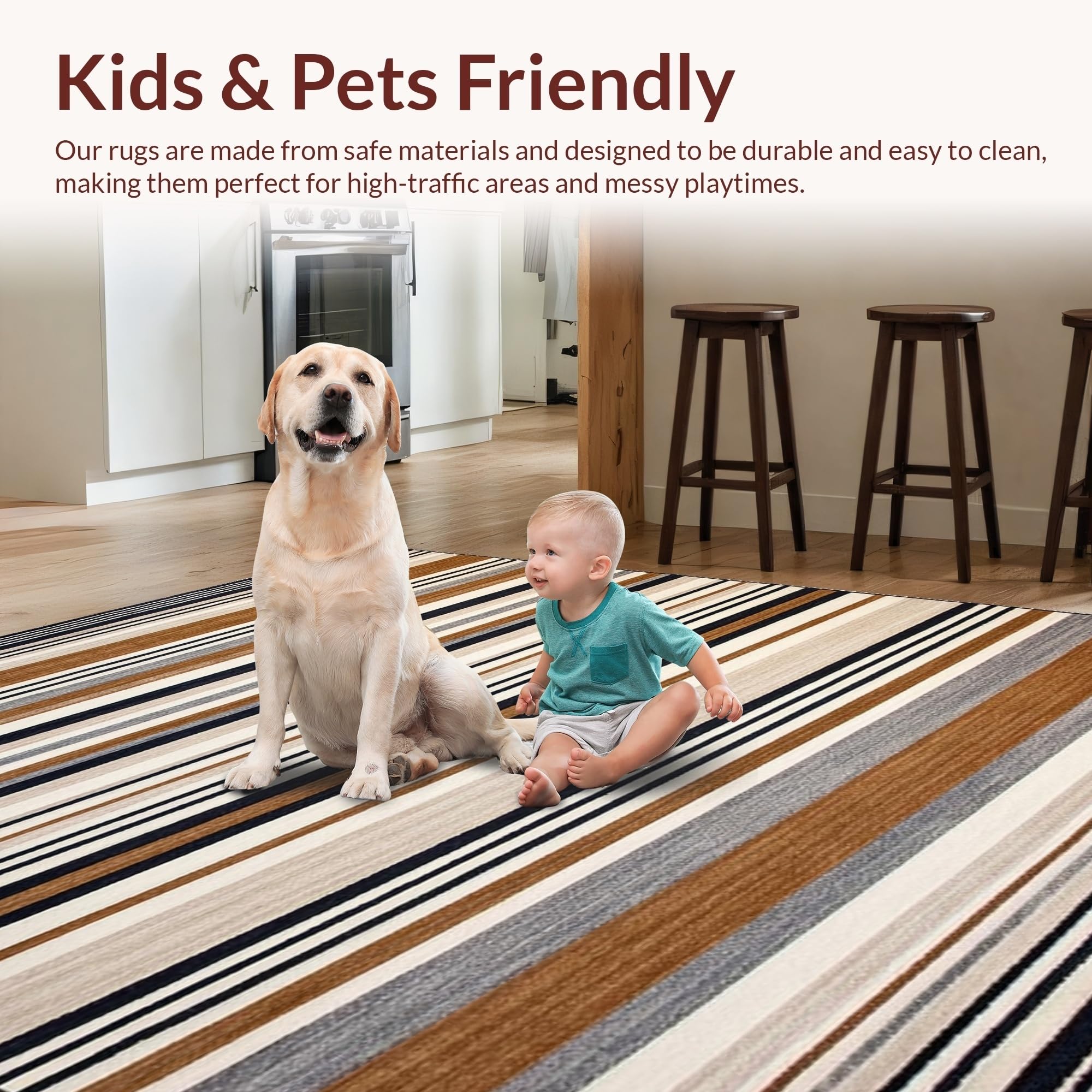 Ultra Soft Area Rug, Non Slip, Stain Resistant, Washable Area Rugs for Living Room, Bedroom, Elegant Striped Neutral Aesthetic(Brown) Overview: