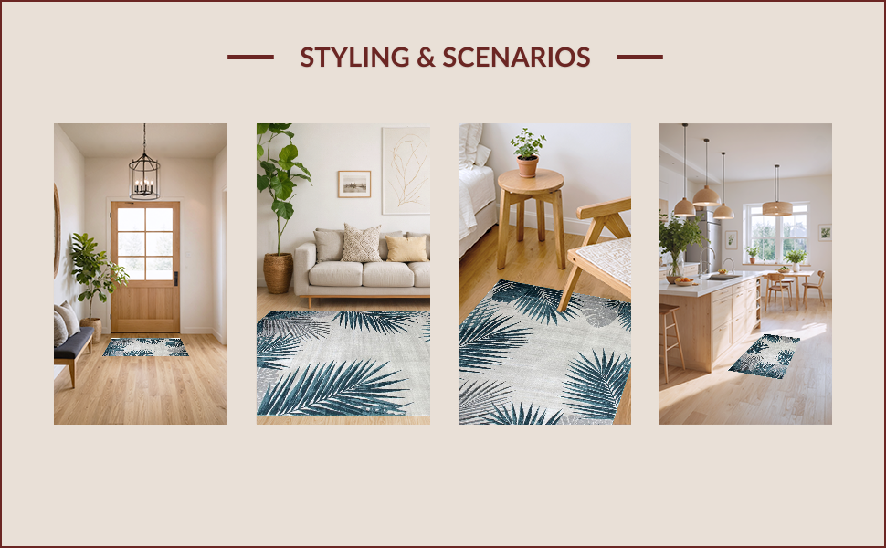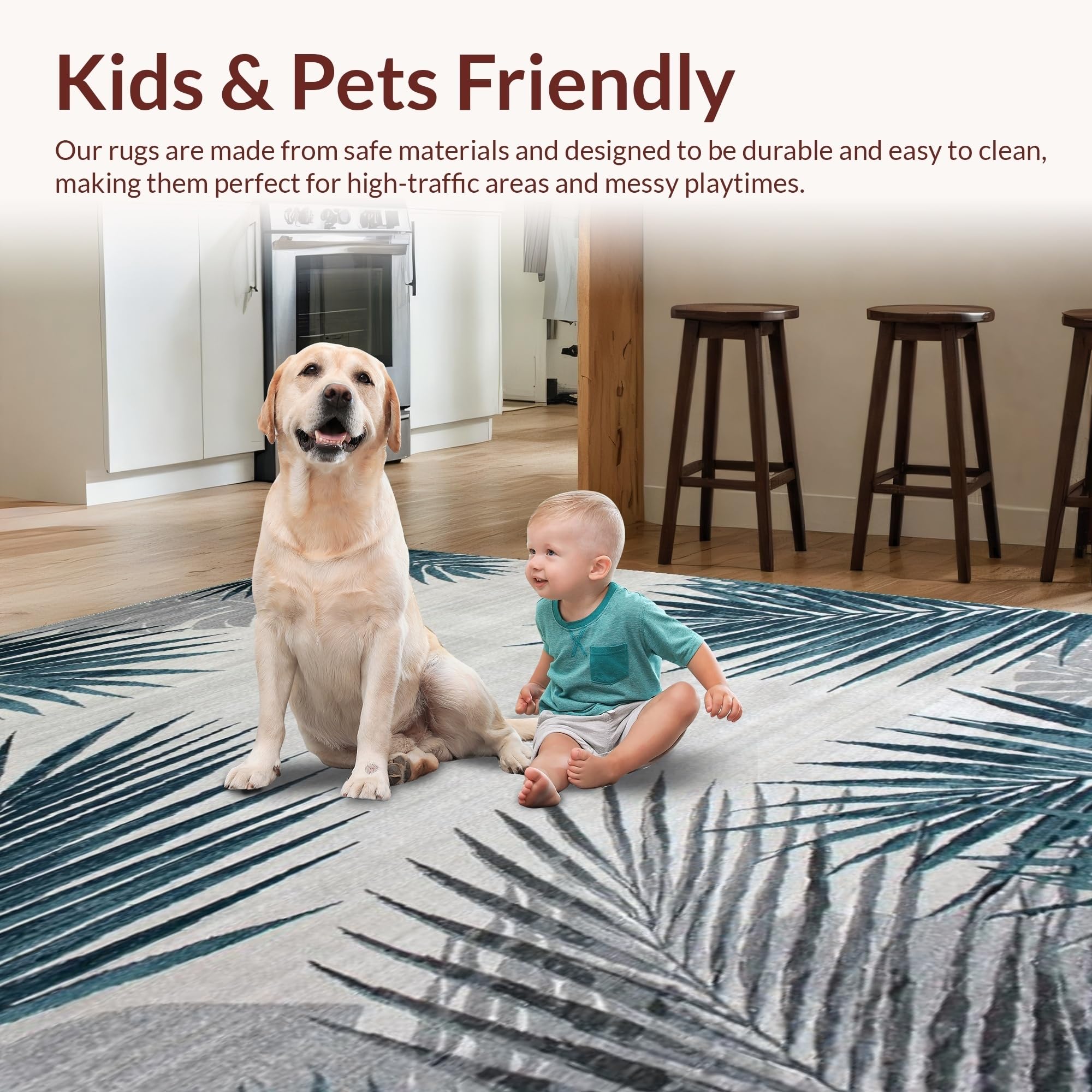 Ultra Soft Area Rug, Non Slip, Stain Resistant, Washable Area Rugs for Living Room, Bedroom, Elegant Tropical Leaf Motif(Blue) Overview: