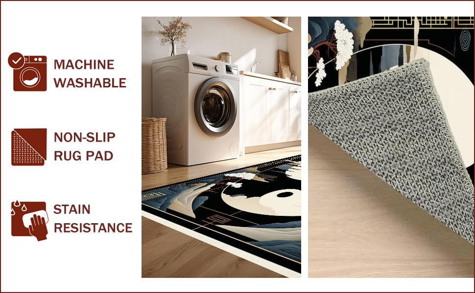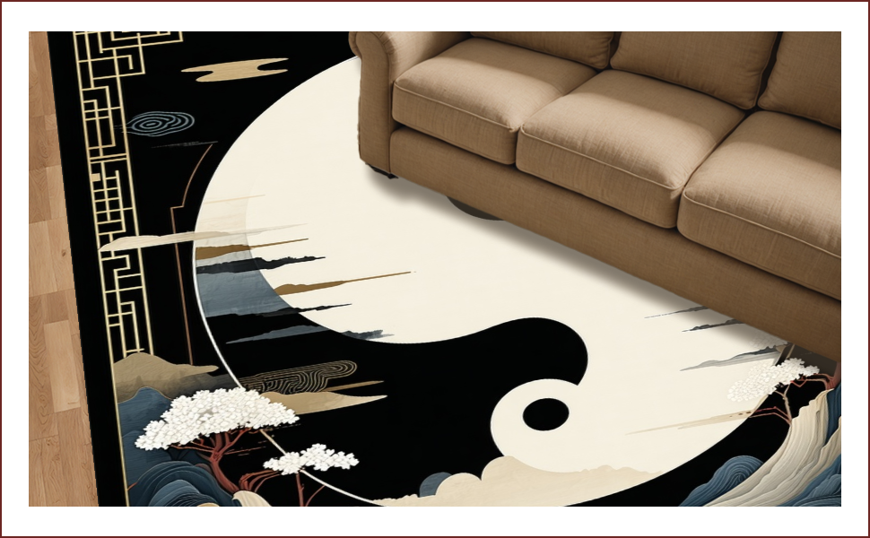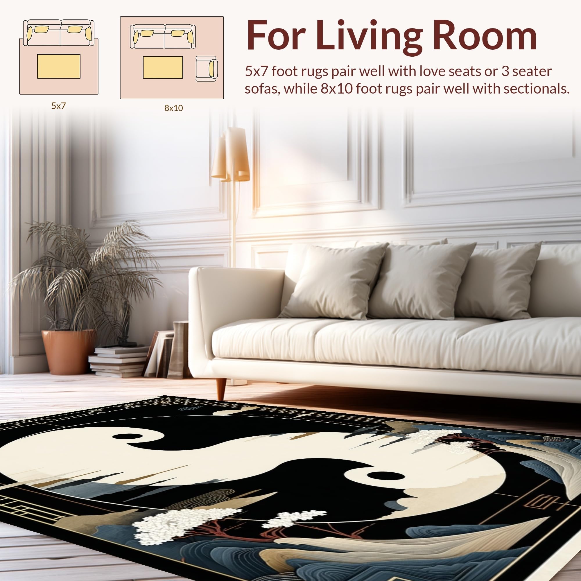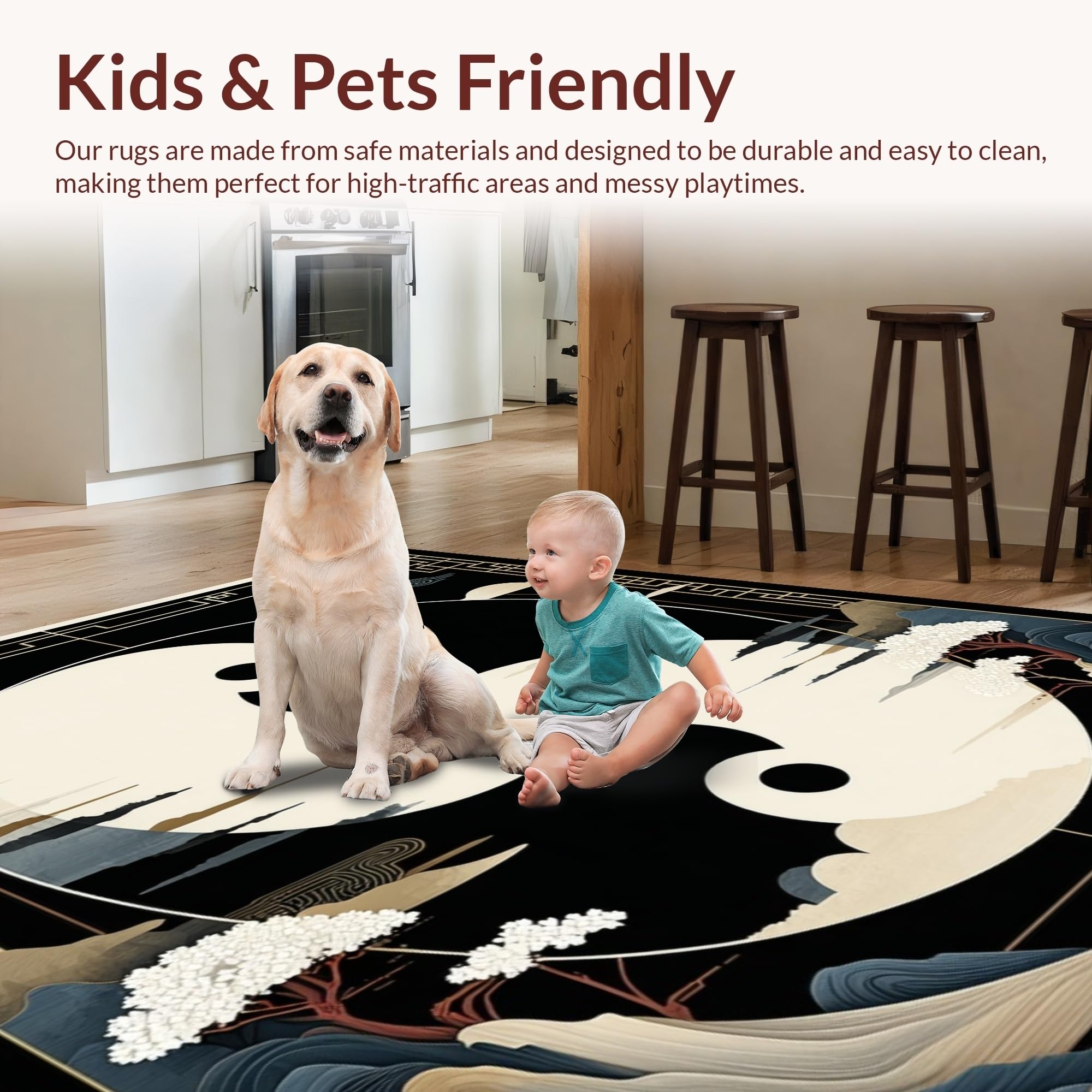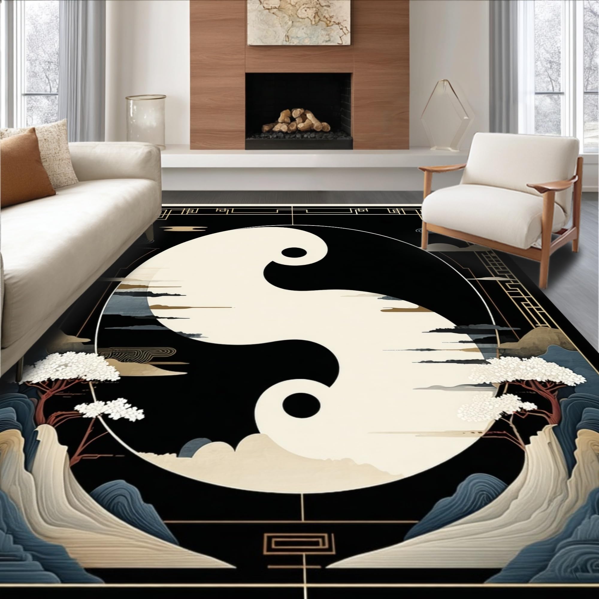 Ultra Soft Area Rug, Non Slip, Stain Resistant, Washable Area Rugs for Living Room, Bedroom, Elegant Velvet Yin Yang Motif(Black) Overview: