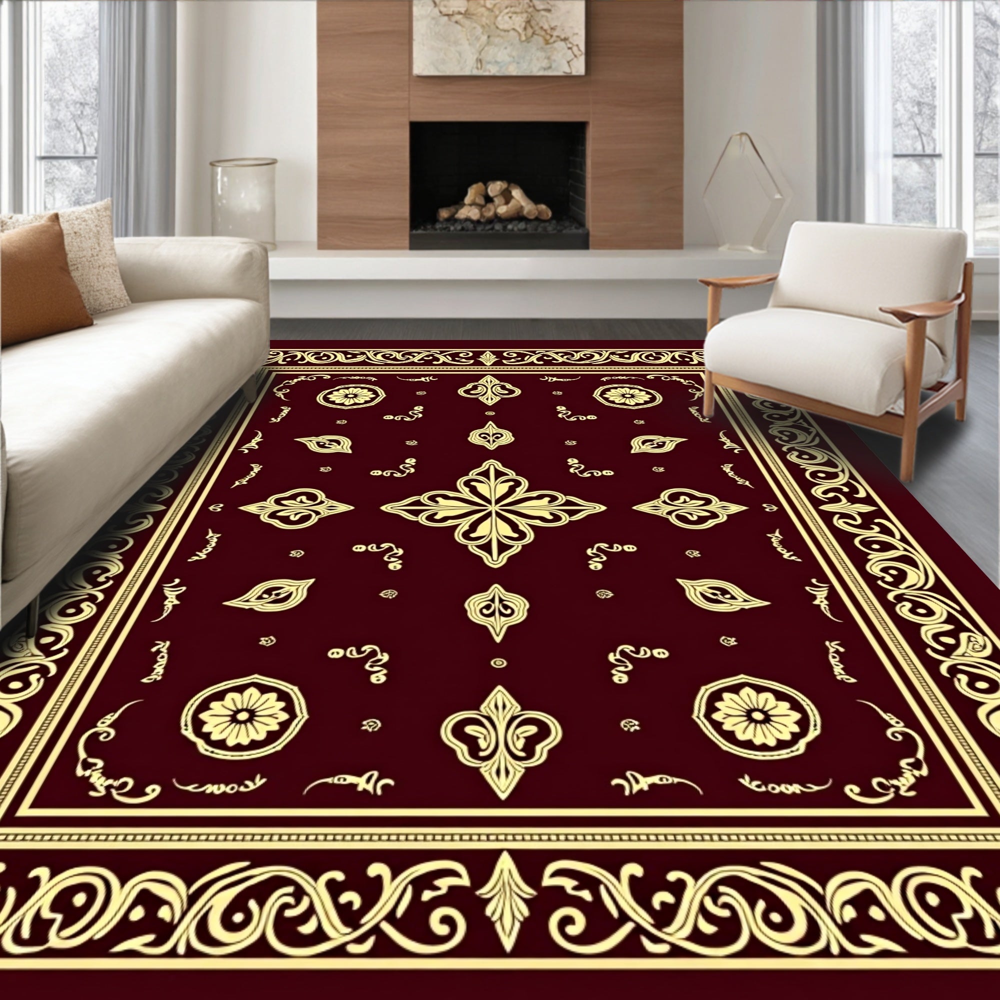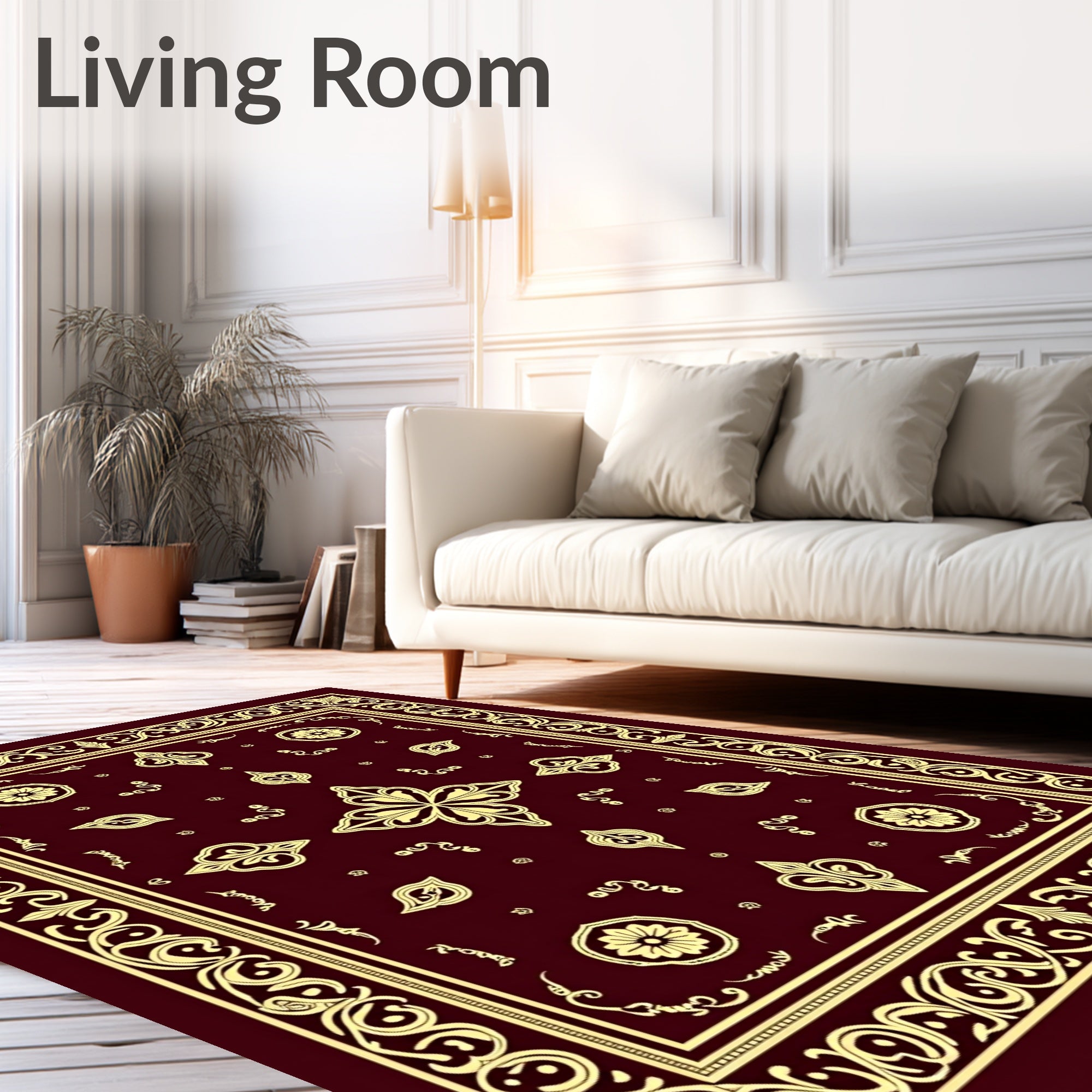 Ultra Soft Area Rug, Non Slip, Stain Resistant, Washable Area Rugs for Living Room, Bedroom, Empress Rocaille Scrolls and Damask Blooms with Interlocking Arabesque(Red) Overview: