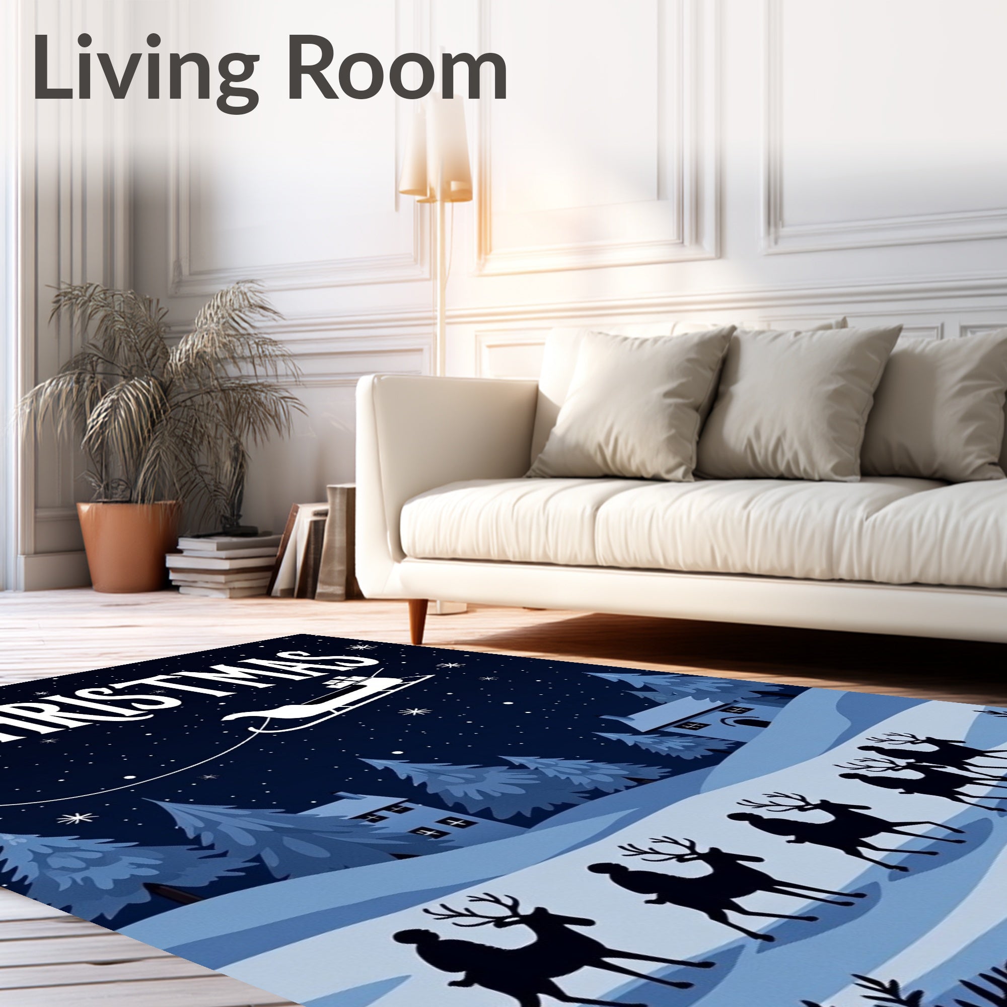 Ultra Soft Area Rug, Non Slip, Stain Resistant, Washable Area Rugs for Living Room, Bedroom, Enchanted December Night Sleigh Journey Decoration(Blue) Overview: