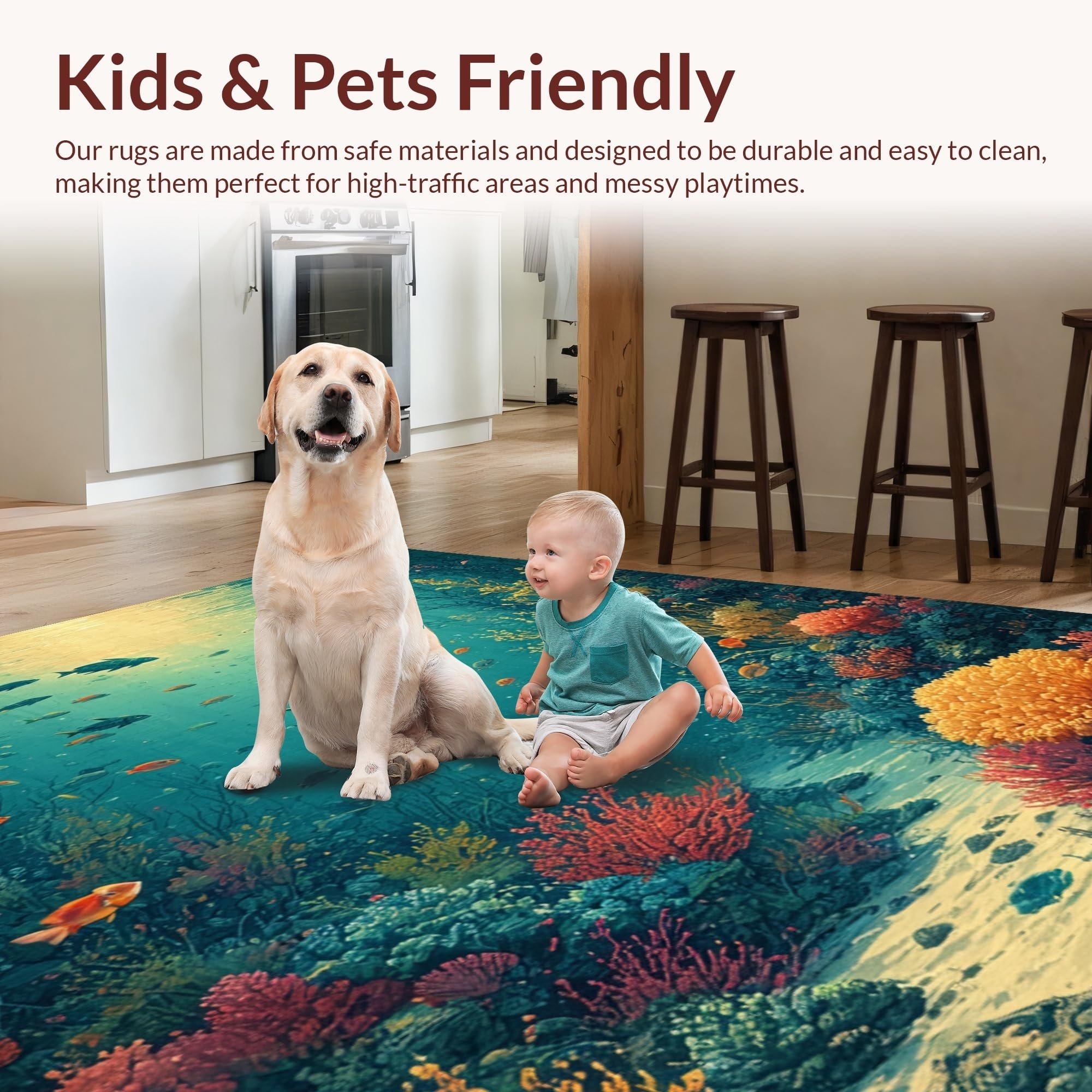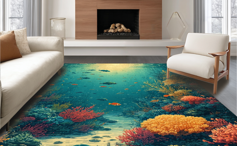 Ultra Soft Area Rug, Non Slip, Stain Resistant, Washable Area Rugs for Living Room, Bedroom, Enchanted Seabed Rug Showcasing Graceful Turtles Amid Tropical Coral Habitat(Blue) Overview: