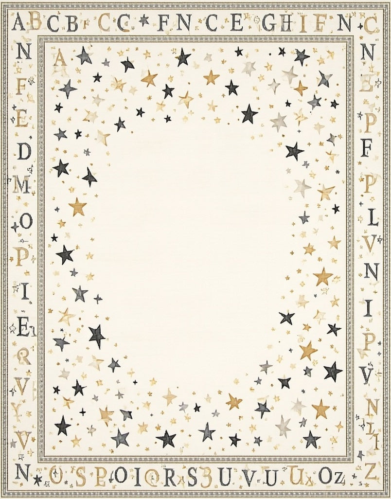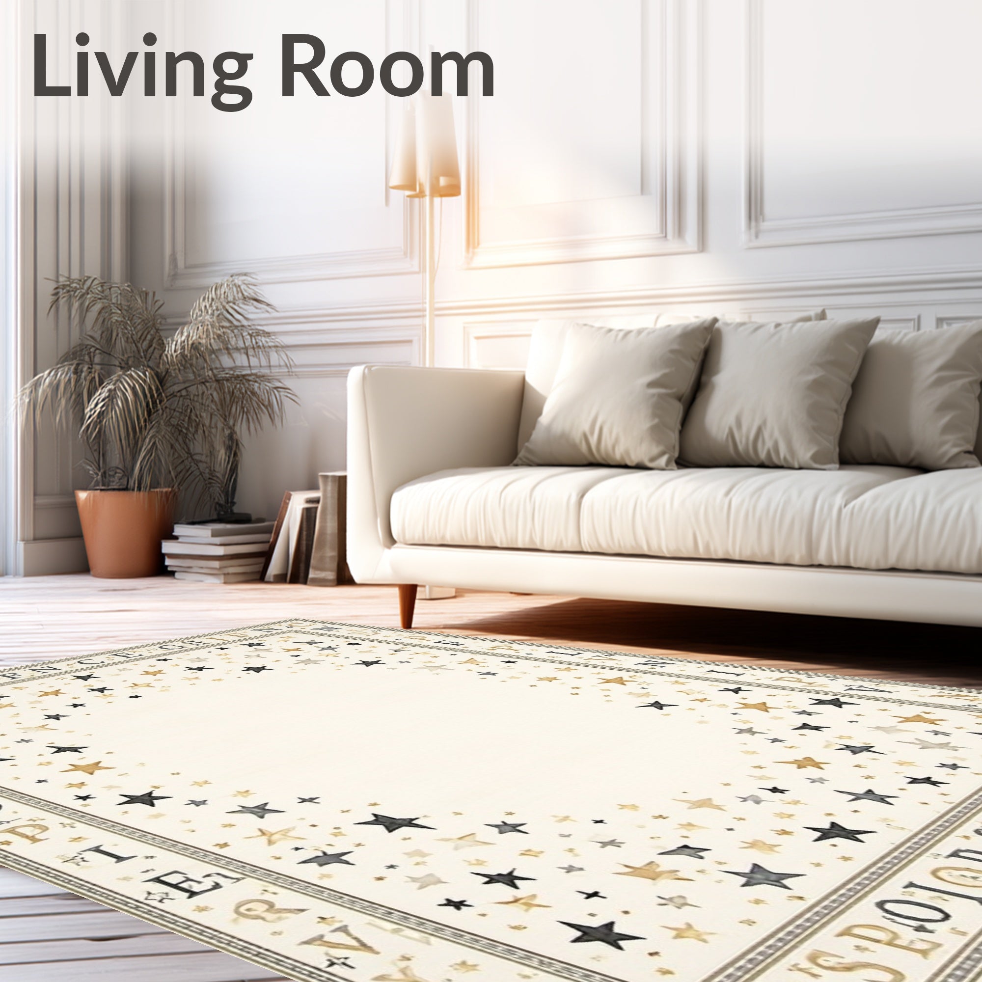 Ultra Soft Area Rug, Non Slip, Stain Resistant, Washable Area Rugs for Living Room, Bedroom, Enchanted Star Script Area with Beige Base and Artistic Lettering Border(Beige) Overview: