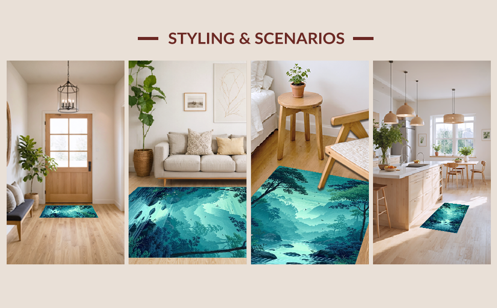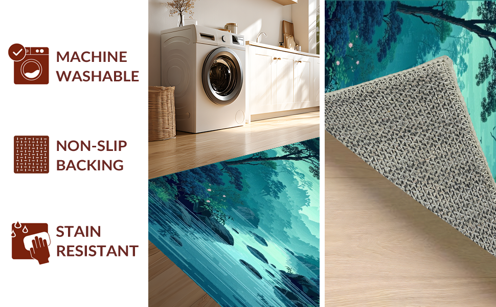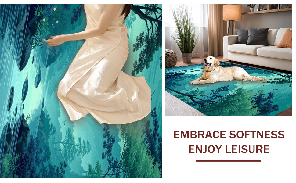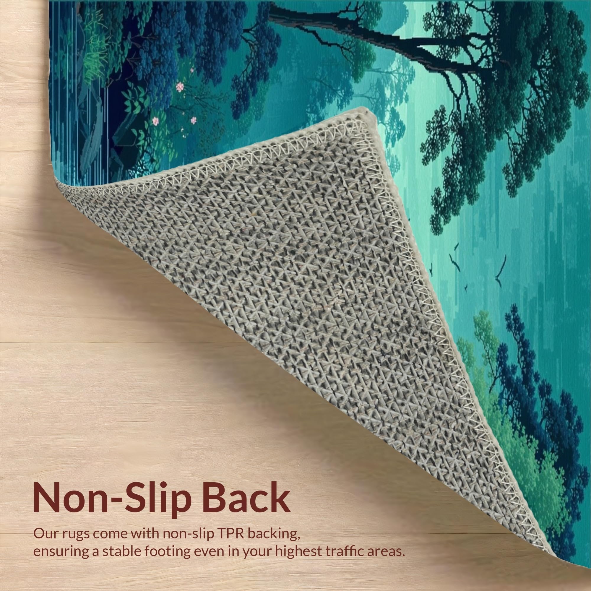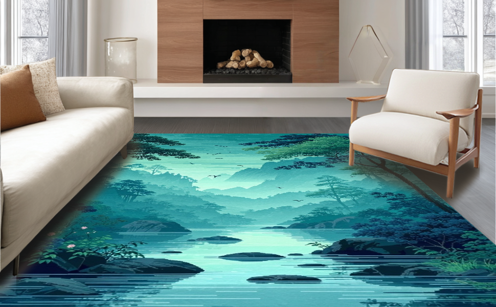 Ultra Soft Area Rug, Non Slip, Stain Resistant, Washable Area Rugs for Living Room, Bedroom, Enchanting Illustrated Waterway Theme(Green) Overview: