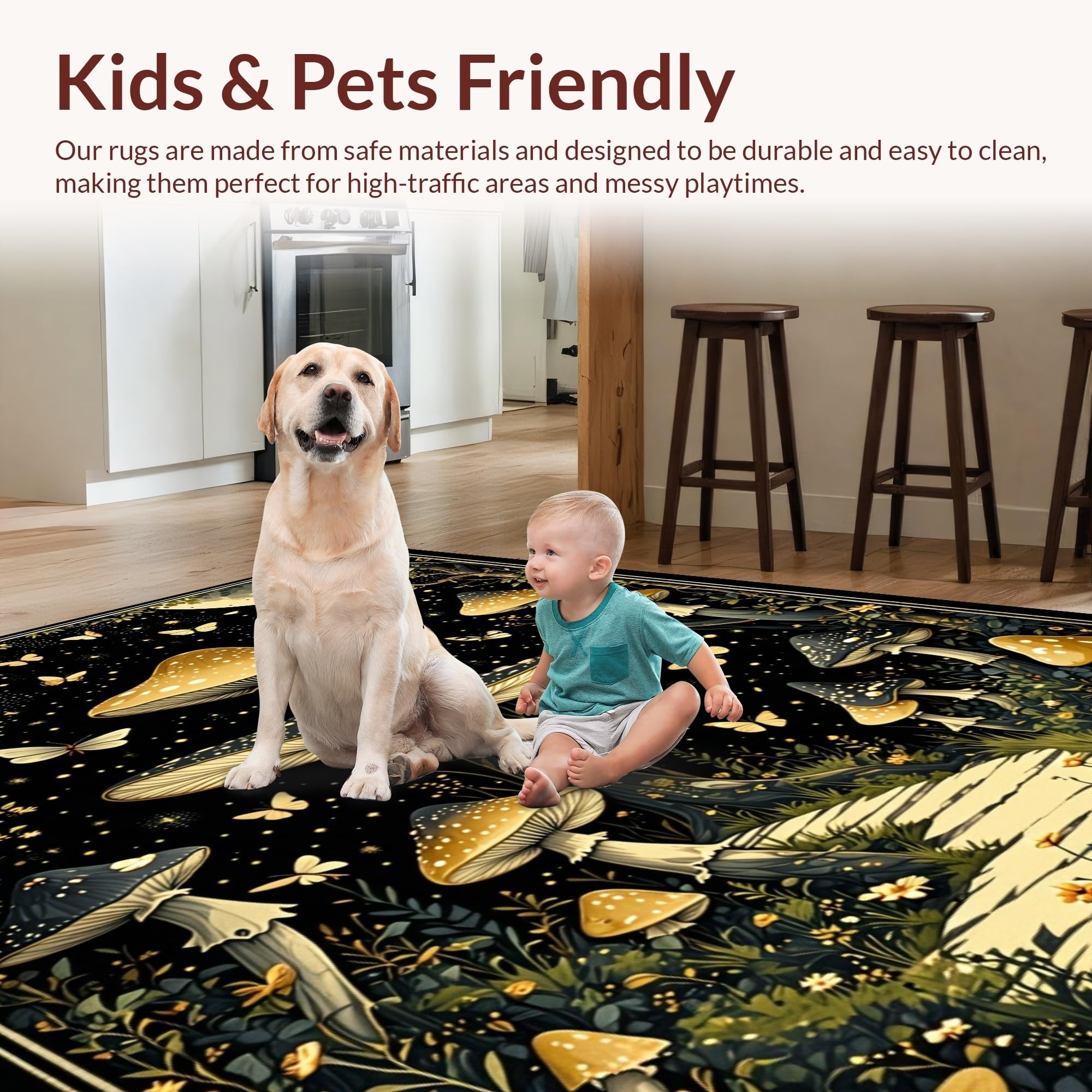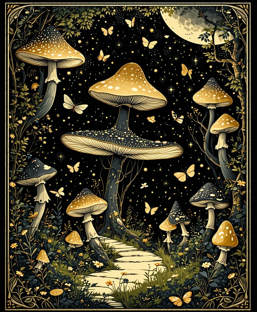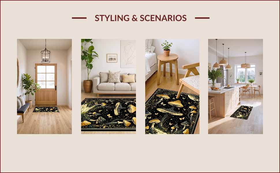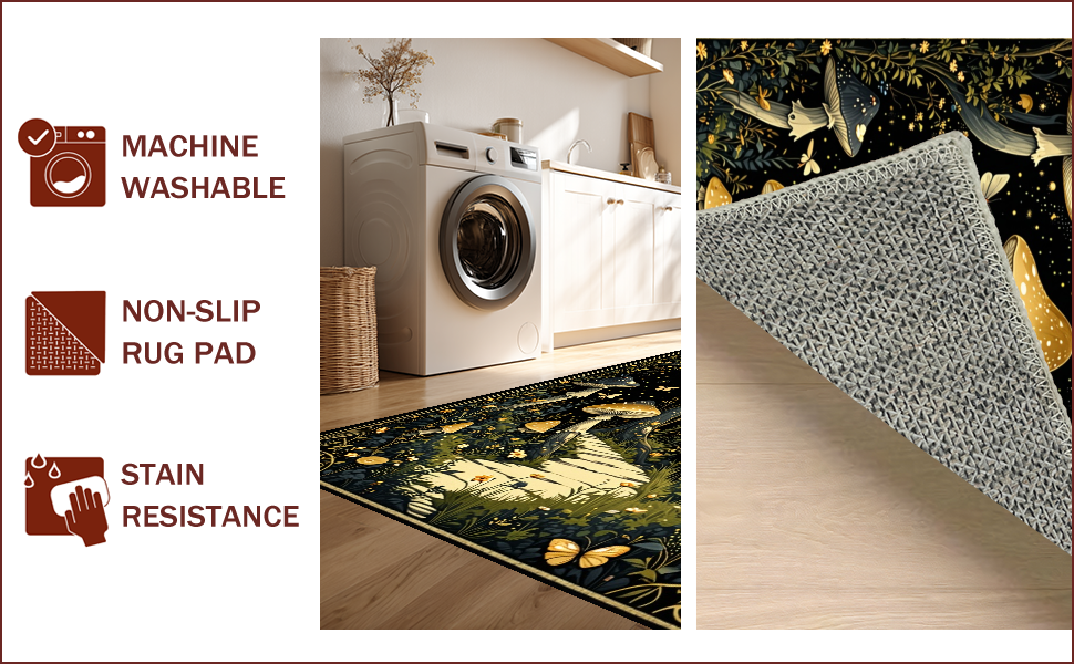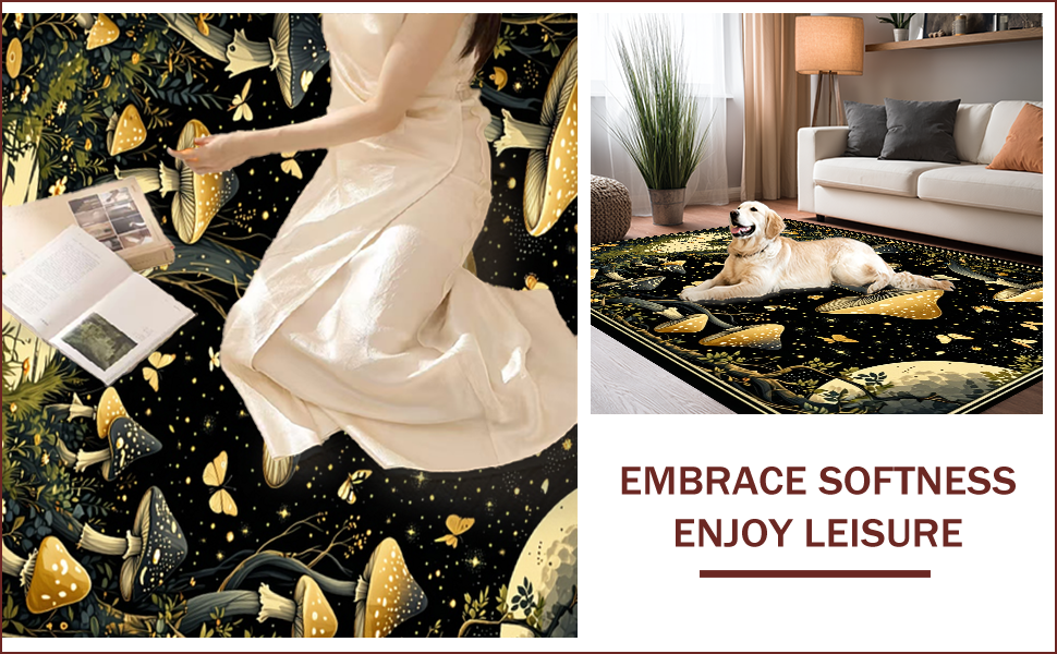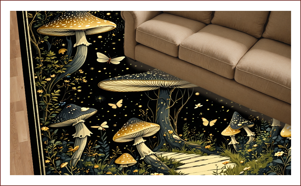 Ultra Soft Area Rug, Non Slip, Stain Resistant, Washable Area Rugs for Living Room, Bedroom, Enchanting Witchy Mushroom Tapestry(Black) Overview:
