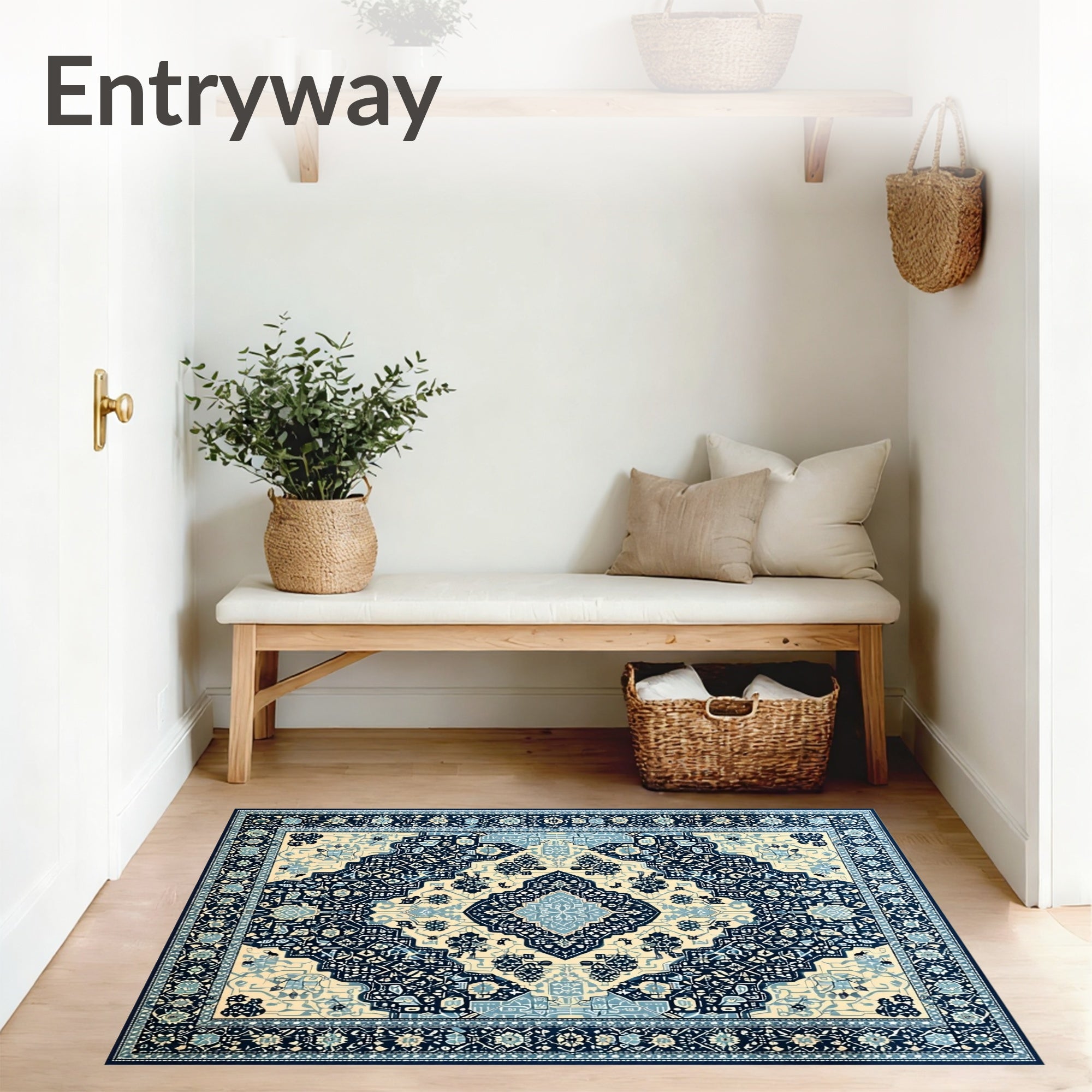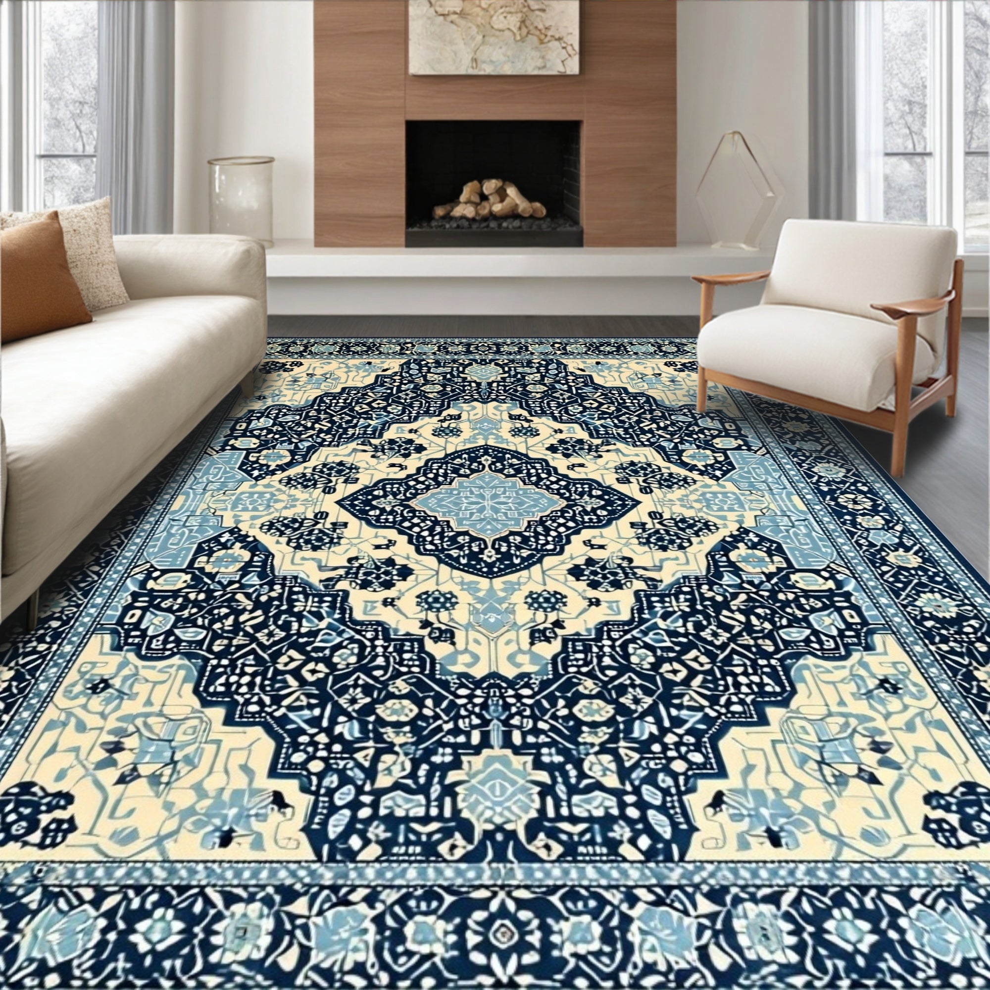 Ultra Soft Area Rug, Non Slip, Stain Resistant, Washable Area Rugs for Living Room, Bedroom, Ethereal Echoes Abstract Geometric Design in Navy Blue and Beige(Beige) Overview: