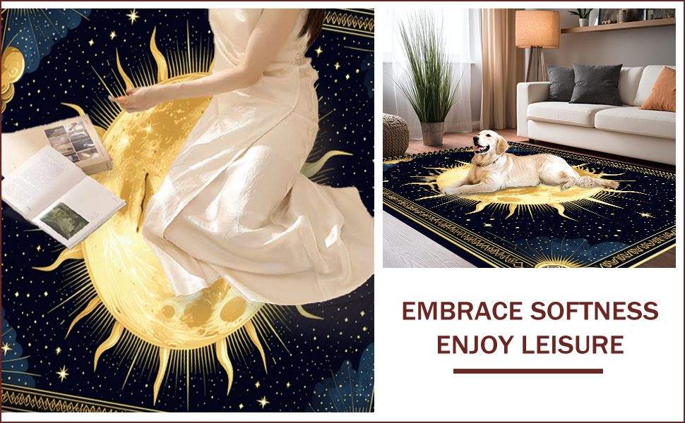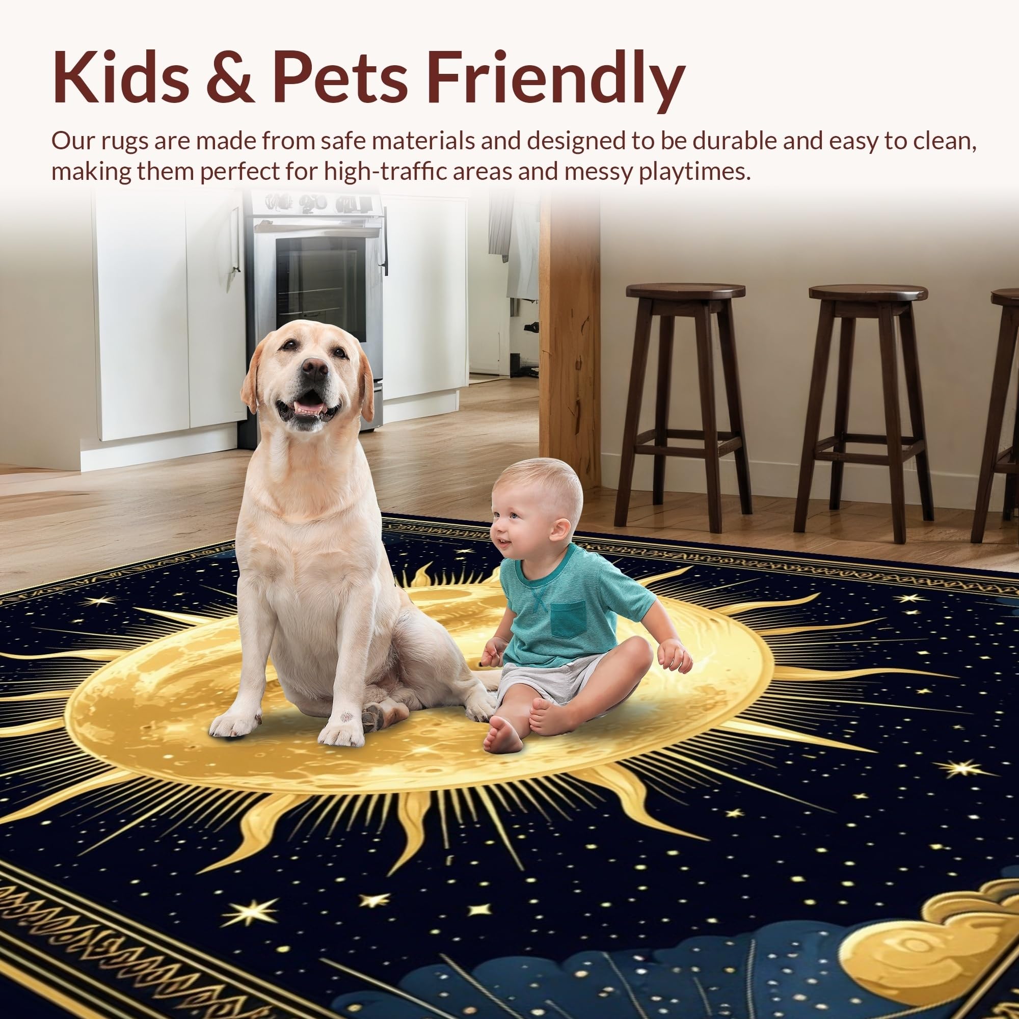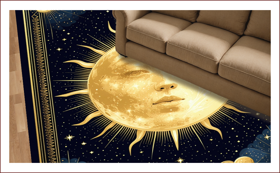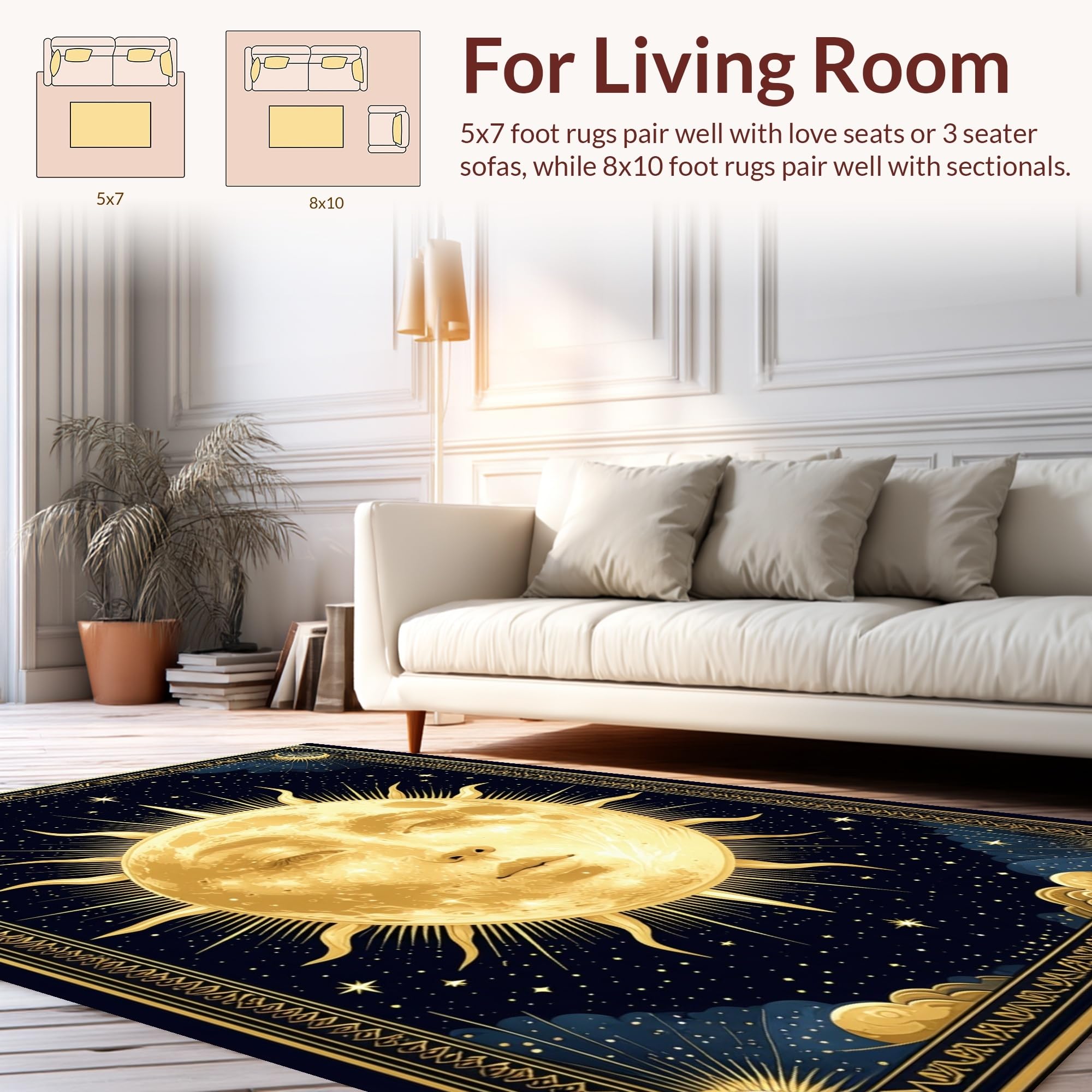 Ultra Soft Area Rug, Non Slip, Stain Resistant, Washable Area Rugs for Living Room, Bedroom, Ethereal Solar and Lunar Fusion(Gold) Overview: