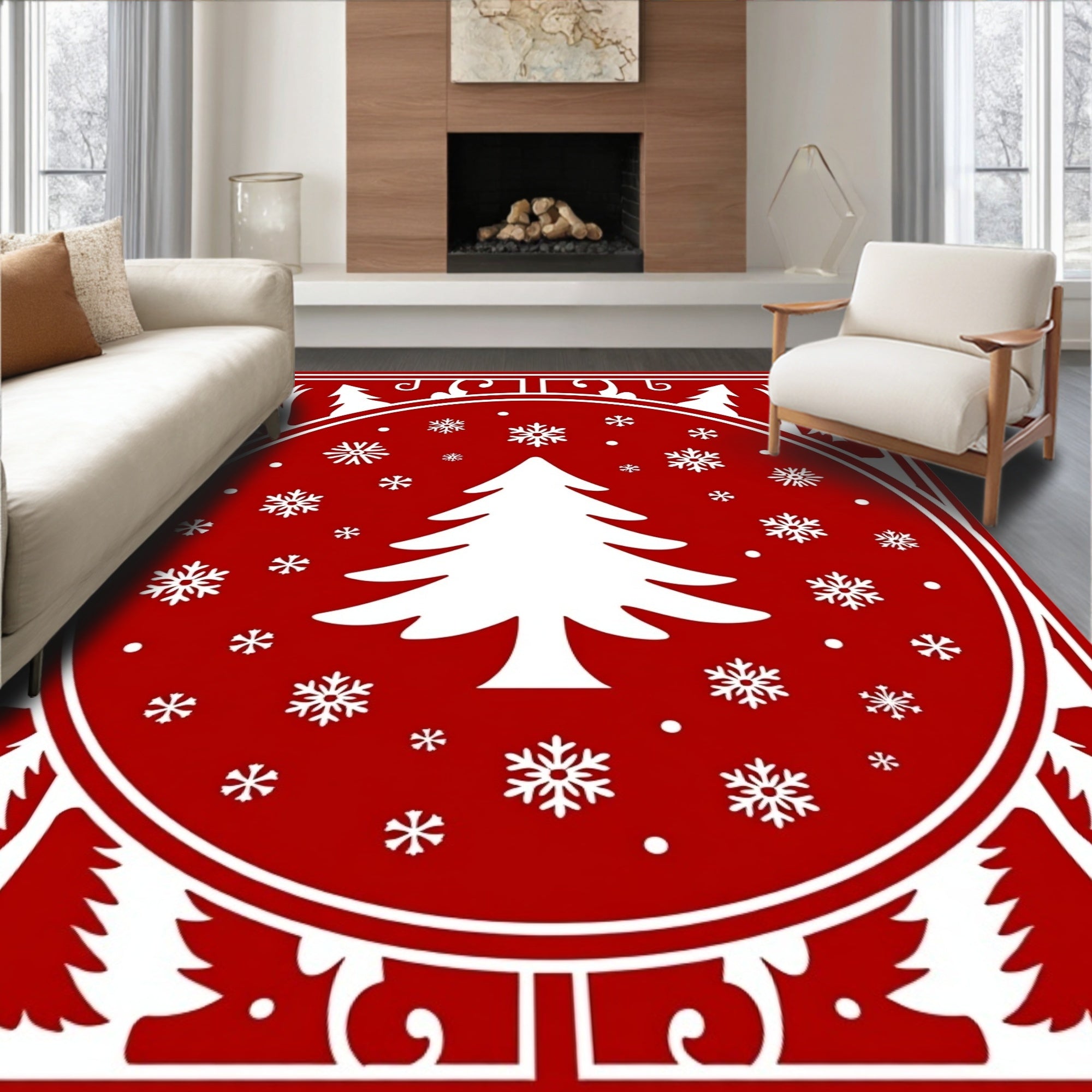 Ultra Soft Area Rug, Non Slip, Stain Resistant, Washable Area Rugs for Living Room, Bedroom, Festive Evergreen Snowfall Decorative Accent(Red) Overview: