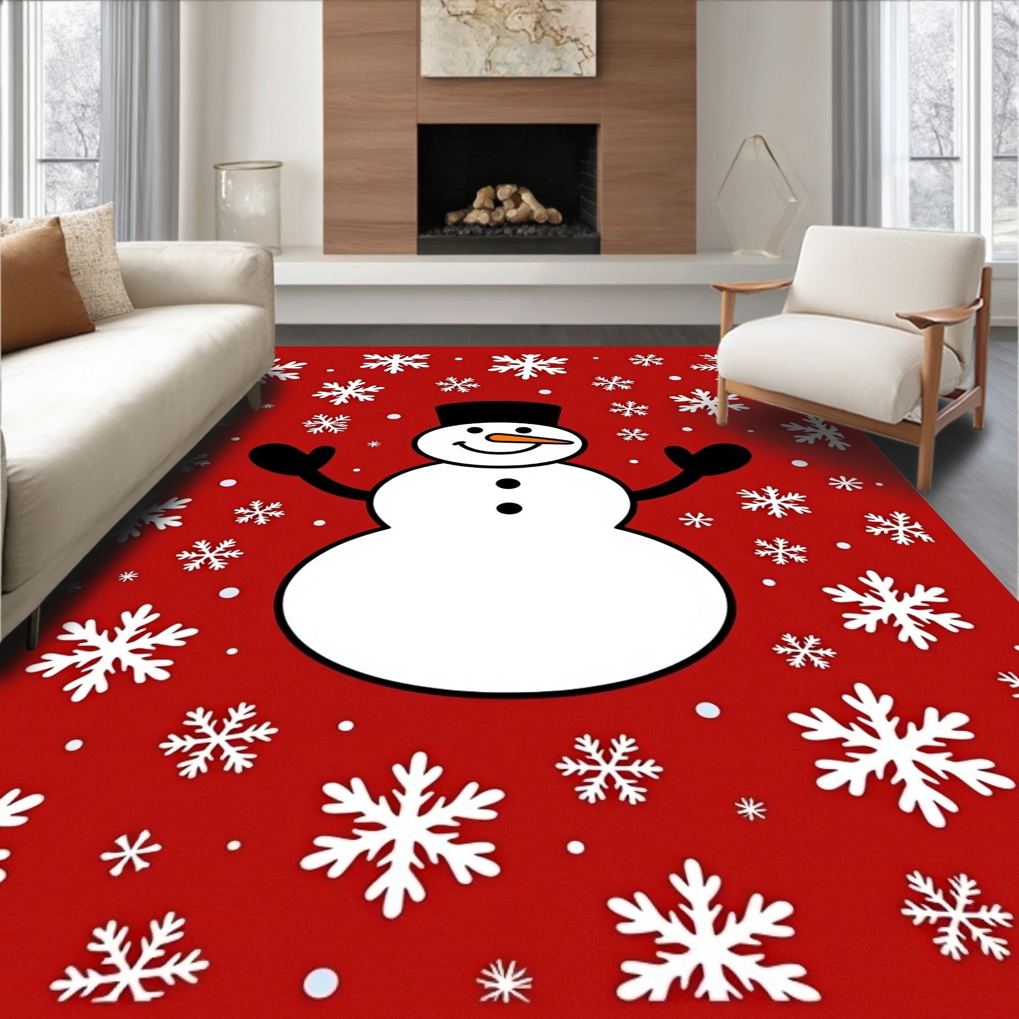Ultra Soft Area Rug, Non Slip, Stain Resistant, Washable Area Rugs for Living Room, Bedroom, Festive Snowman with Falling Snowflakes Holiday(Red) Overview: