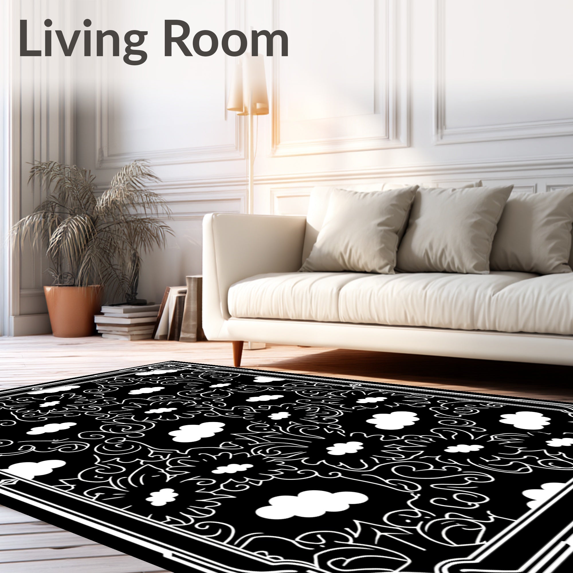 Flatwoven High Traffic Area Rug, Floating Puff Art Nouveau Inspired, Non Slip, Stain Resistant, Washable Area Rugs for Living Room, Bedroom (Black) Overview: