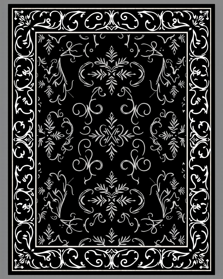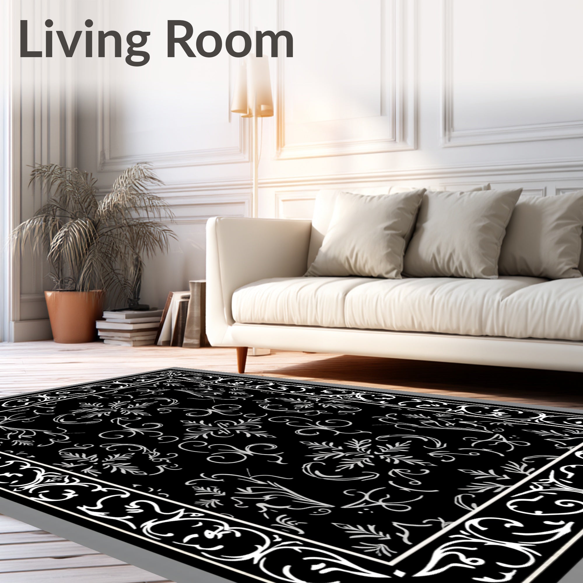 Flatwoven High Traffic Area Rug, Floral Damask Scroll Work Classic Interior Accent, Non Slip, Stain Resistant, Washable Area Rugs for Living Room, Bedroom (Black) Overview: