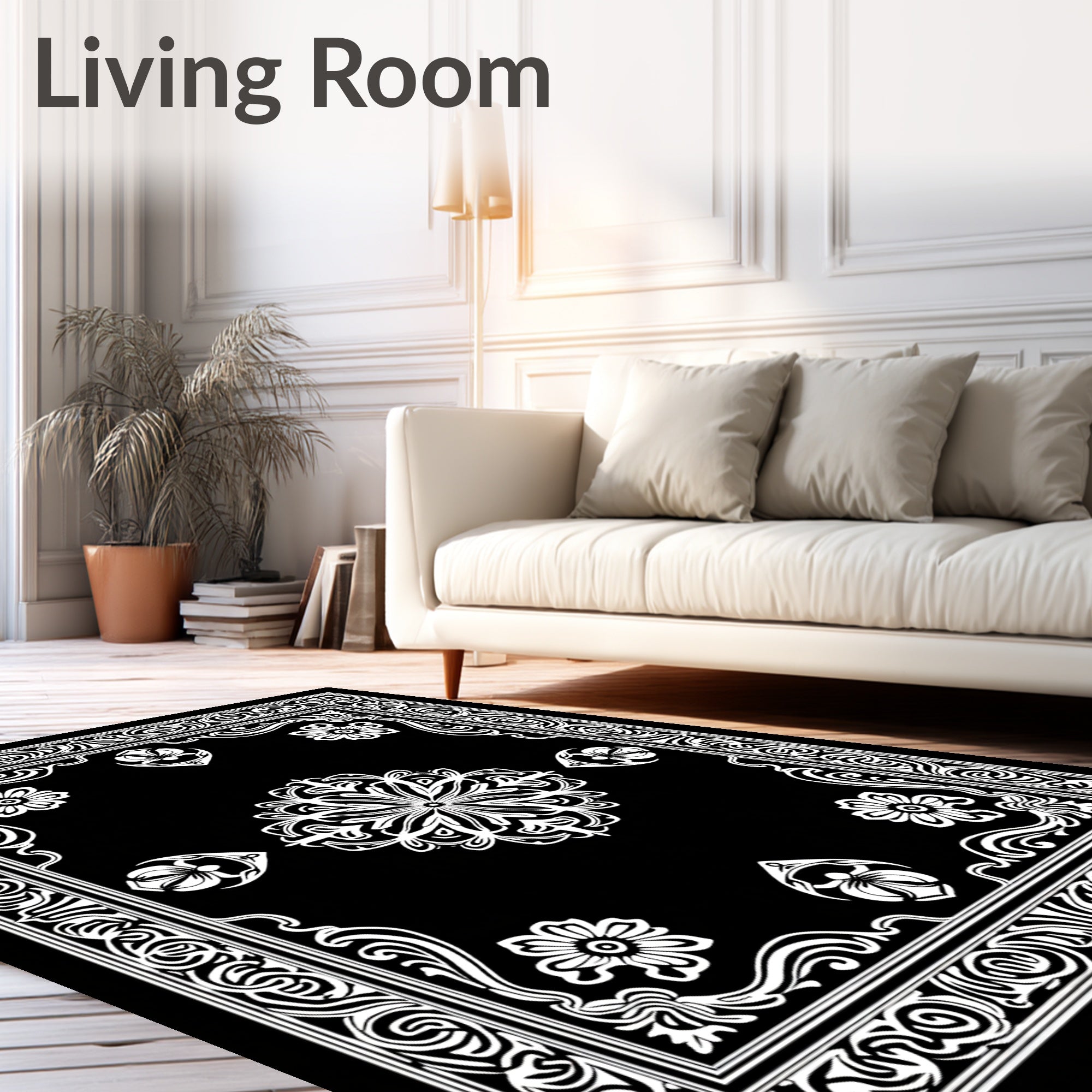 Ultra Soft Area Rug, Non Slip, Stain Resistant, Washable Area Rugs for Living Room, Bedroom, Floral Medallion Scrollwork with Ornate Detailing(Black) Overview: