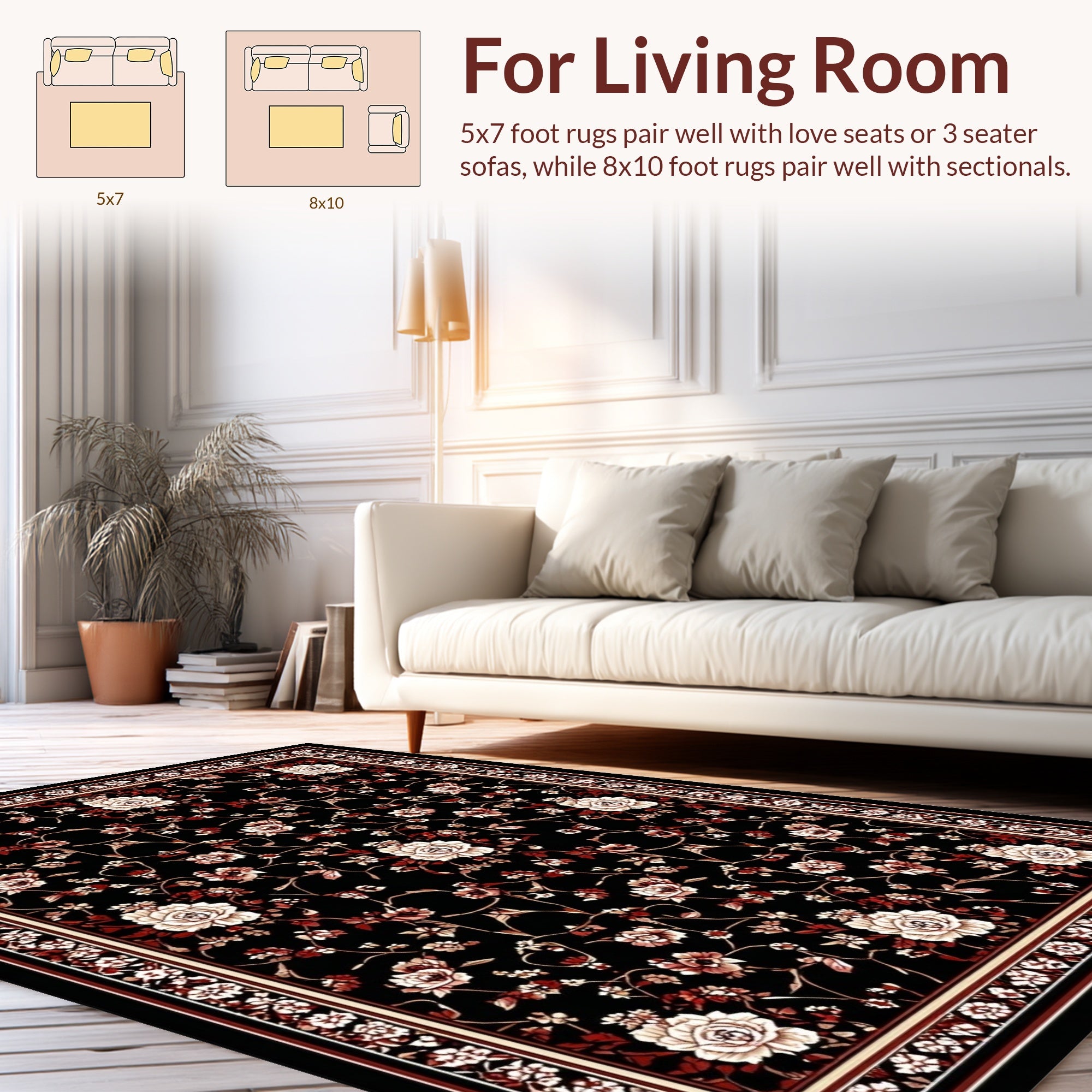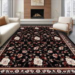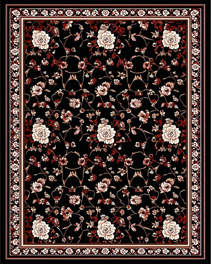 Flatwoven High Traffic Area Rug, Floral Motif in Rich Color Contrast, Non Slip, Stain Resistant, Washable Area Rugs for Living Room, Bedroom (Black) Overview: