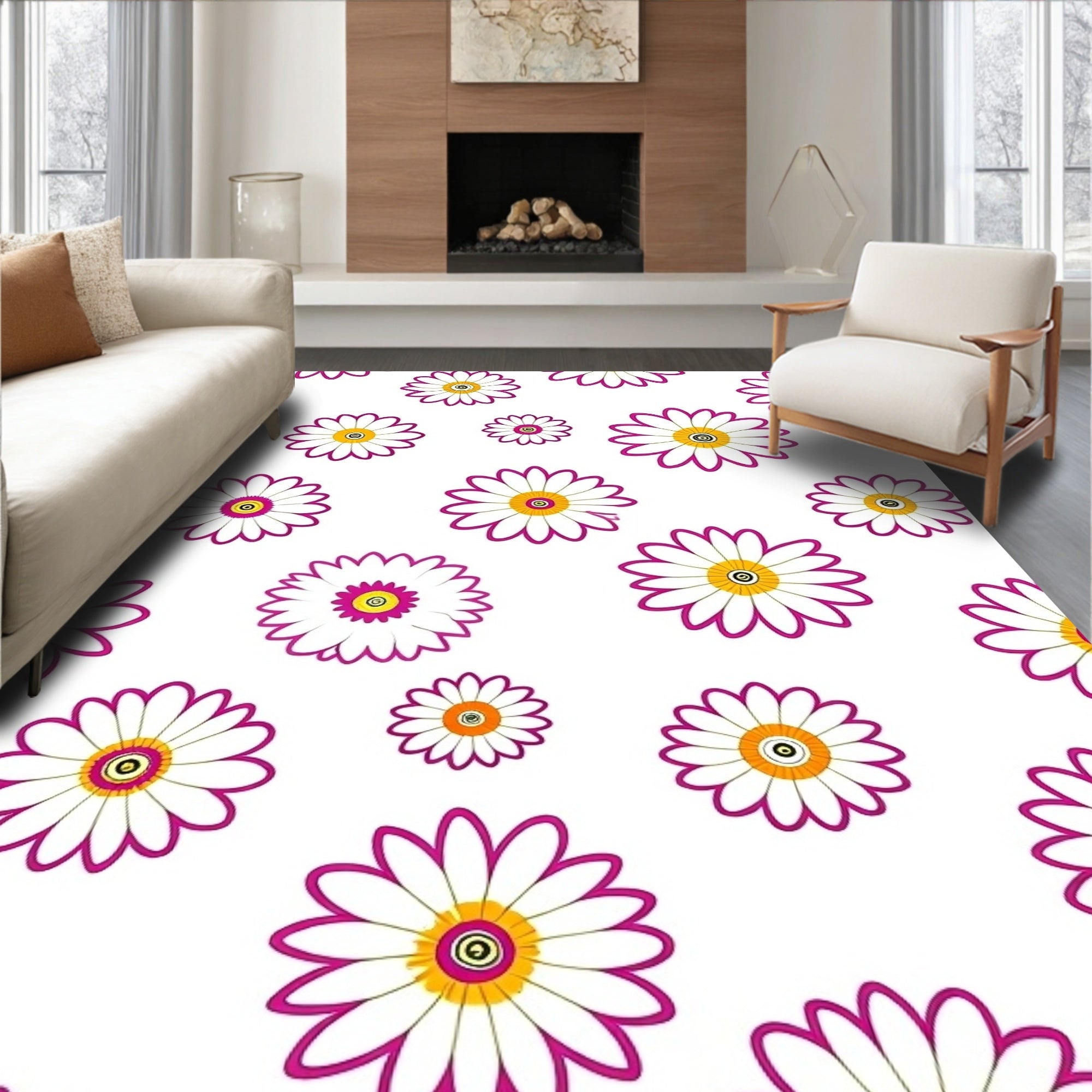 Ultra Soft Area Rug, Non Slip, Stain Resistant, Washable Area Rugs for Living Room, Bedroom, Flower Power Bloom with Daisy Chain Fluffy(White) Overview: