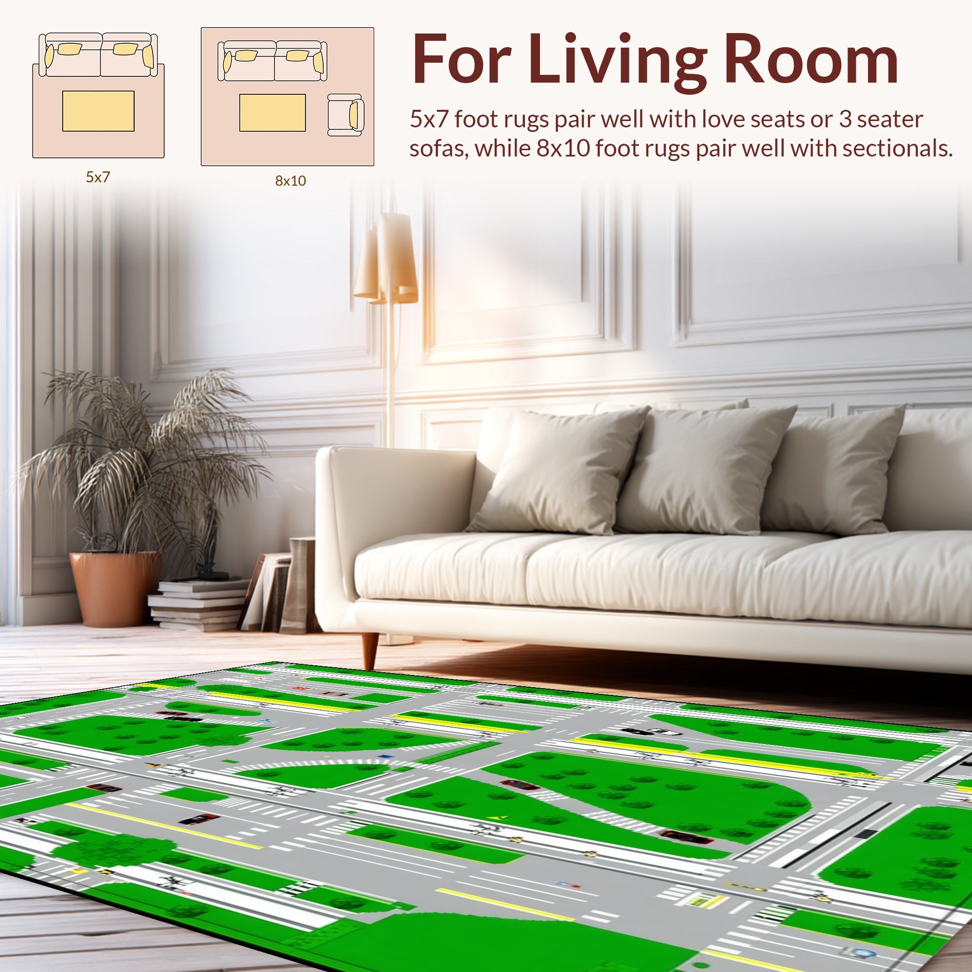 Flatwoven High Traffic Area Rug, Fun and Engaging Car Adventure, Non Slip, Stain Resistant, Washable Area Rugs for Living Room, Bedroom (Green) Overview: