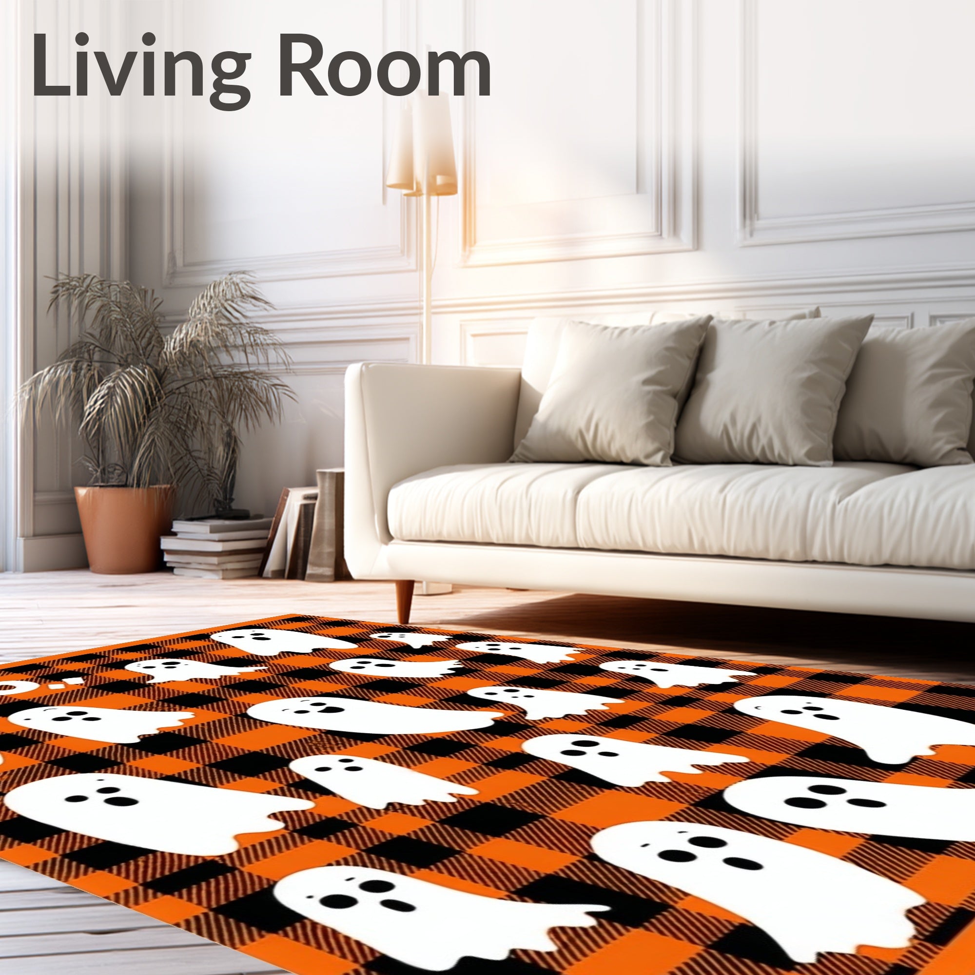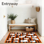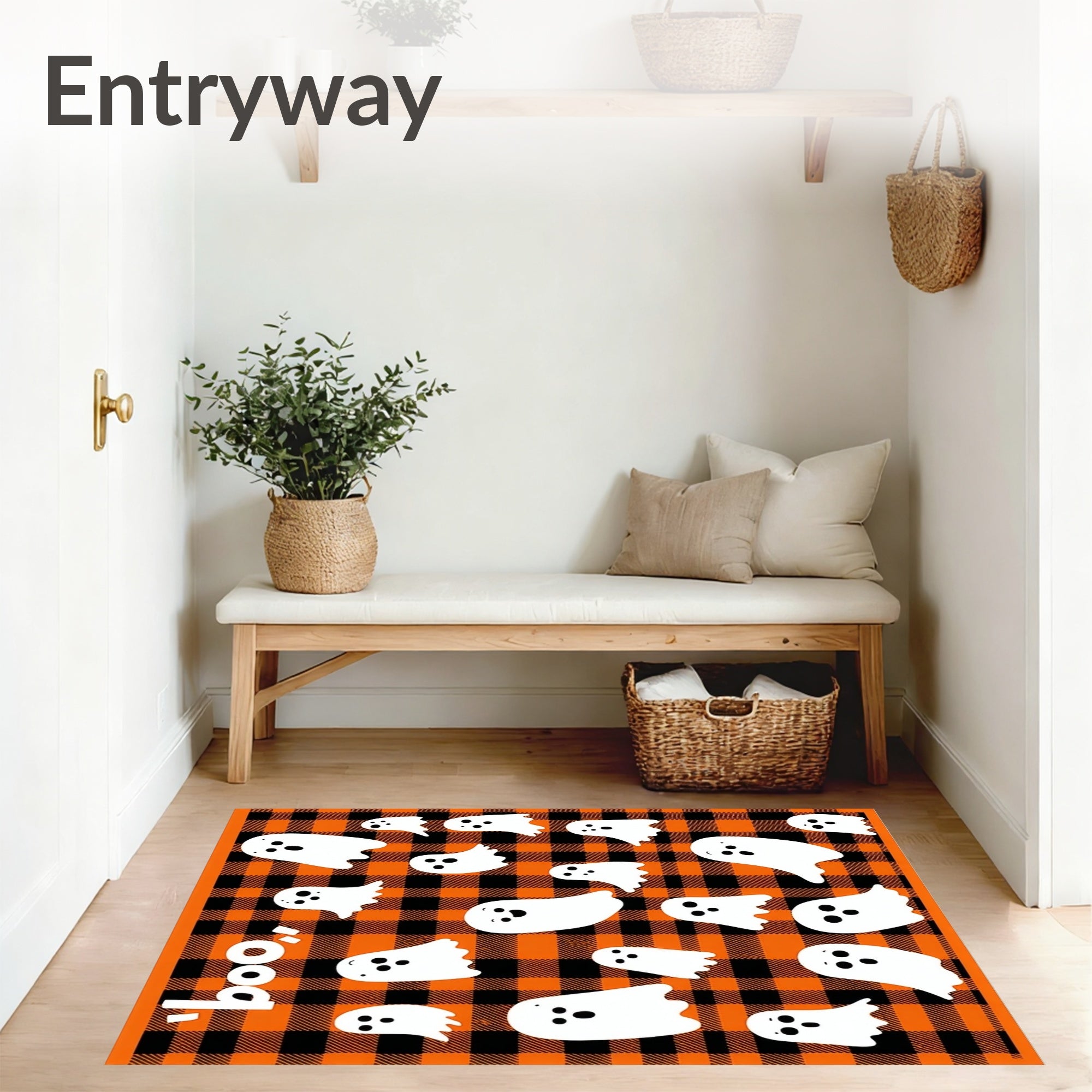 Flatwoven High Traffic Area Rug, Ghostly Greetings Spooky Welcome & Plaid Layered Entry, Non Slip, Stain Resistant, Washable Area Rugs for Living Room, Bedroom (Orange) Overview: