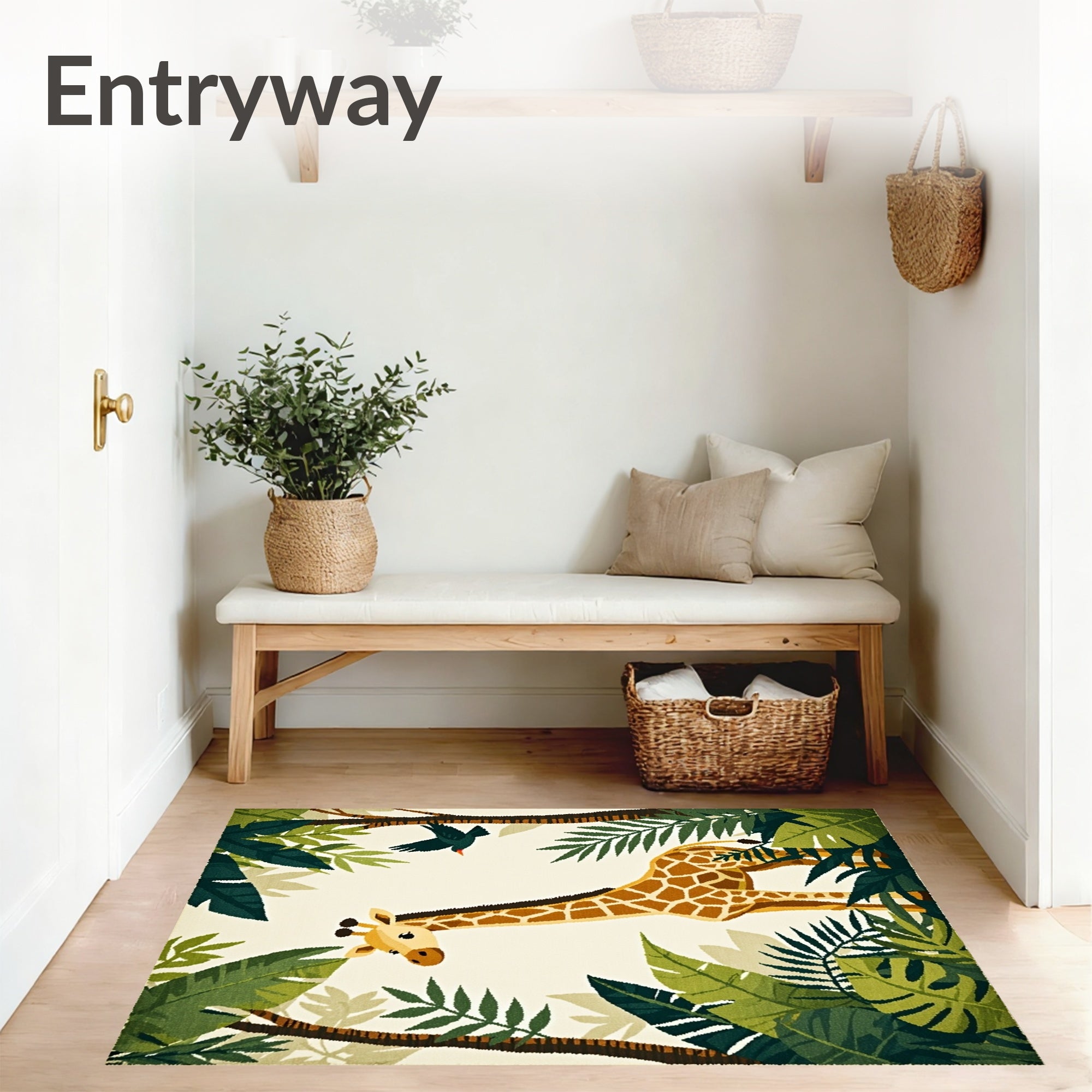 Ultra Soft Area Rug, Non Slip, Stain Resistant, Washable Area Rugs for Living Room, Bedroom, Giraffe Playtime Area with Jungle for Kids Rooms(Beige) Overview:
