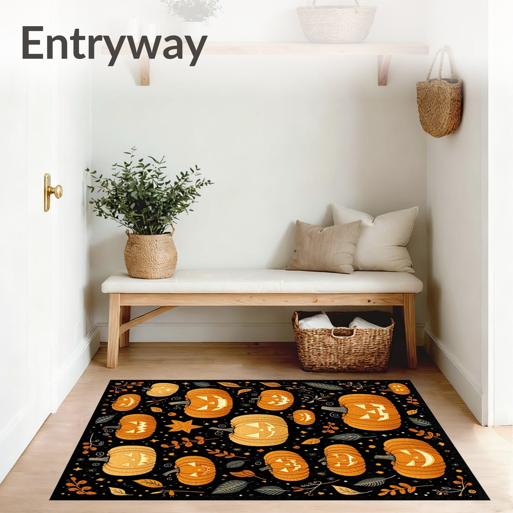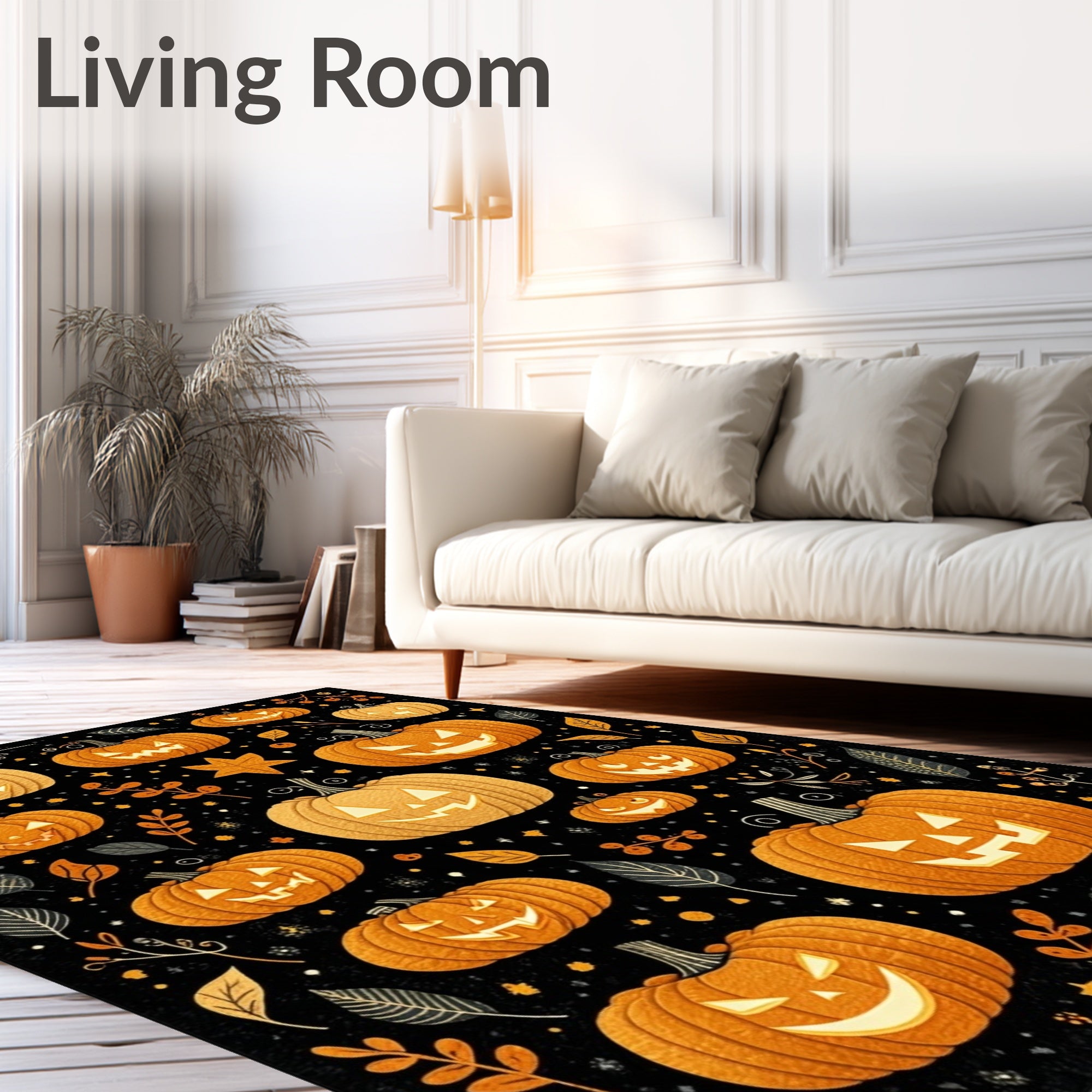 Flatwoven High Traffic Area Rug, Halloween Themed Round with Stylized Pumpkin and Lettering Motifs, Non Slip, Stain Resistant, Washable Area Rugs for Living Room, Bedroom (Orange) Overview: