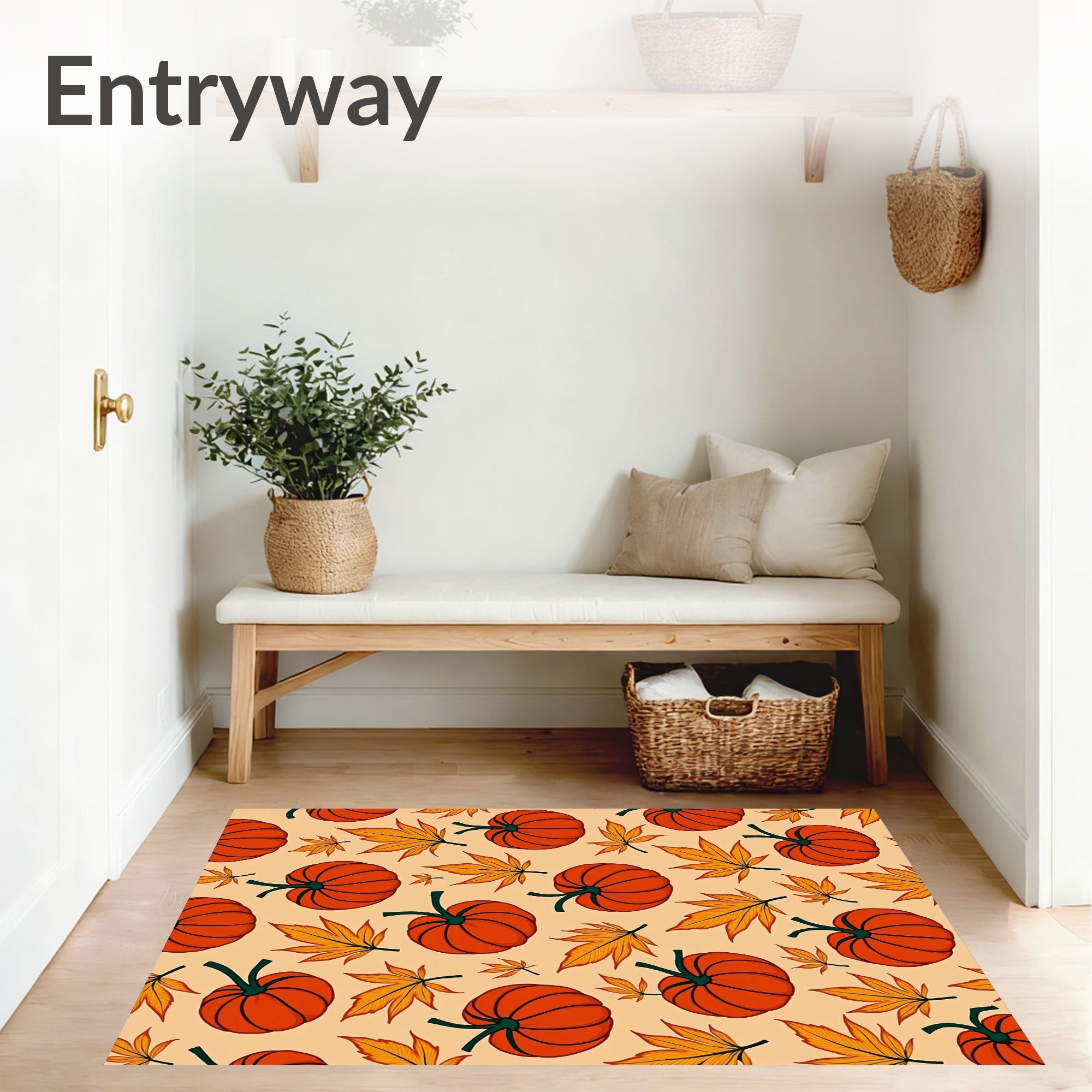 Ultra Soft Area Rug, Non Slip, Stain Resistant, Washable Area Rugs for Living Room, Bedroom, Harvest Pumpkin Patch Maple Leaf Scattered(Beige) Overview: