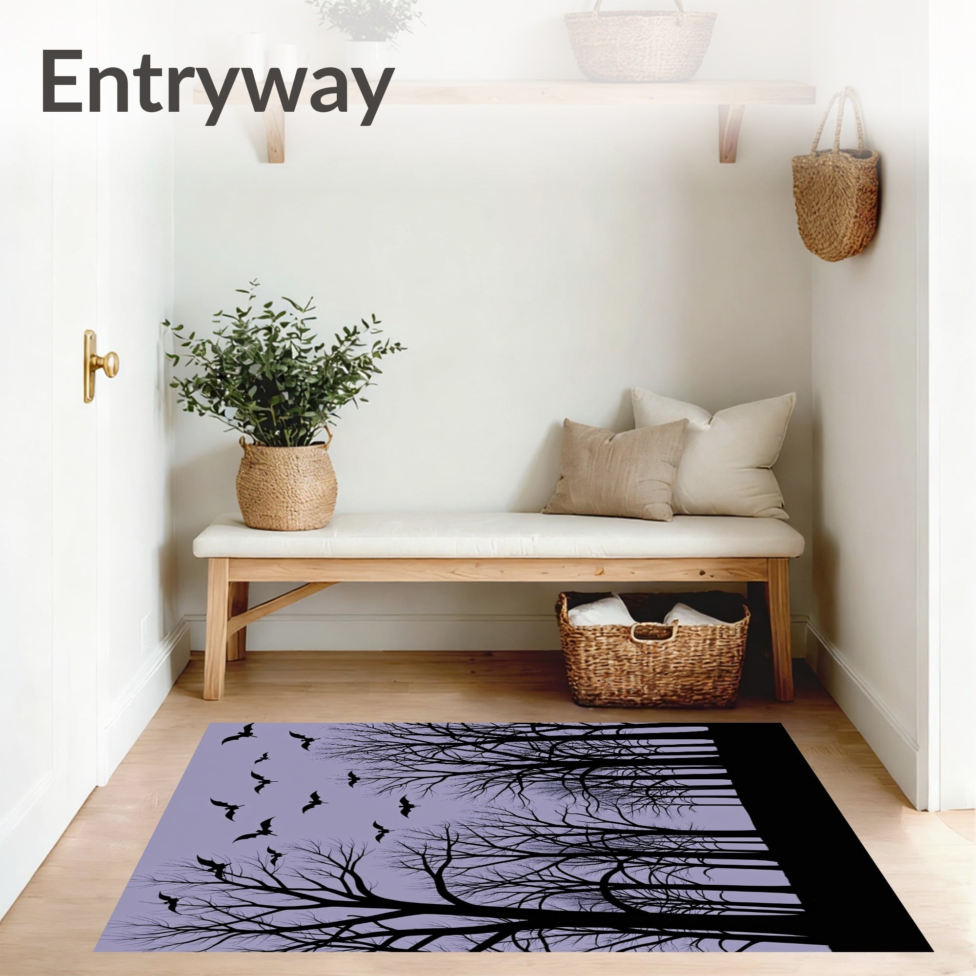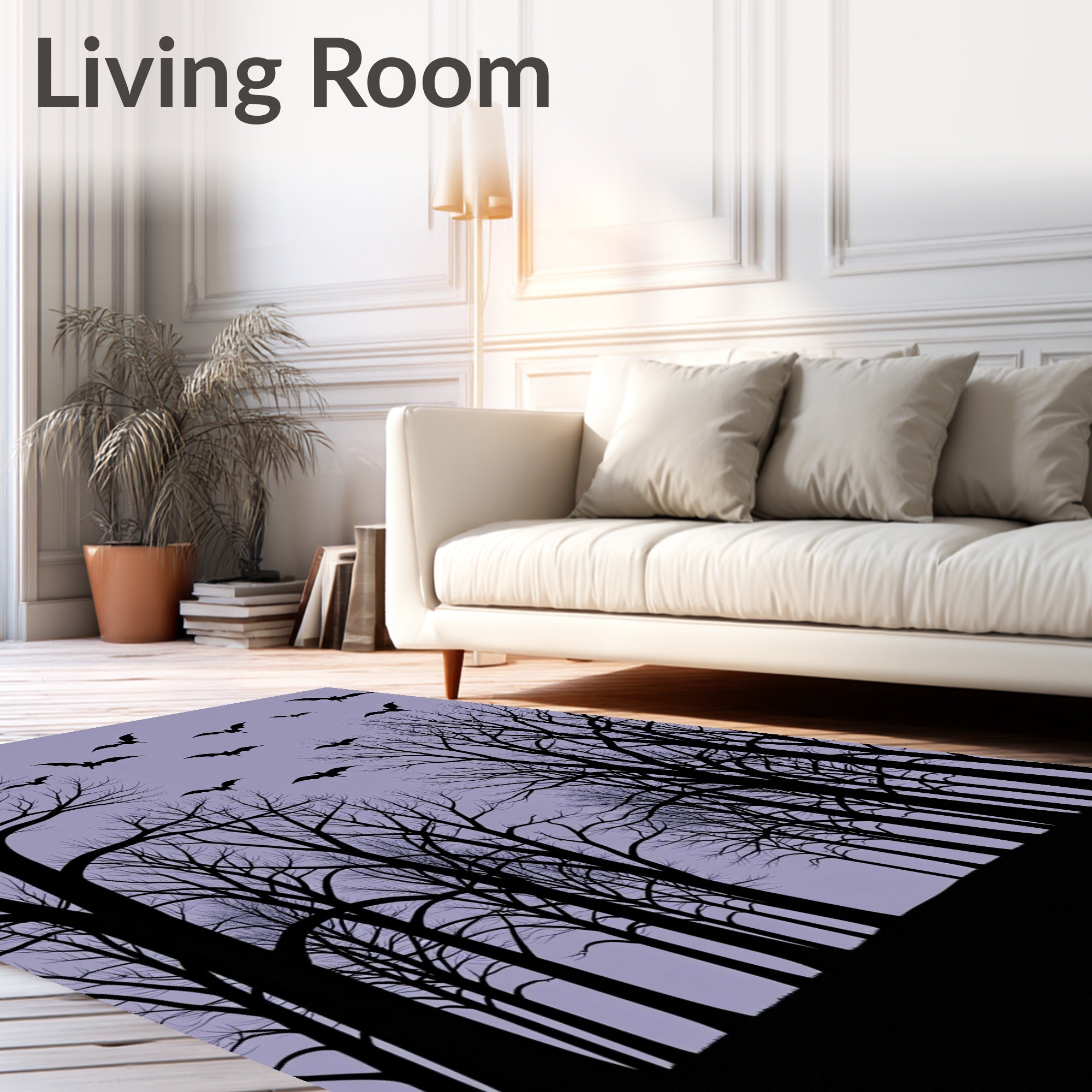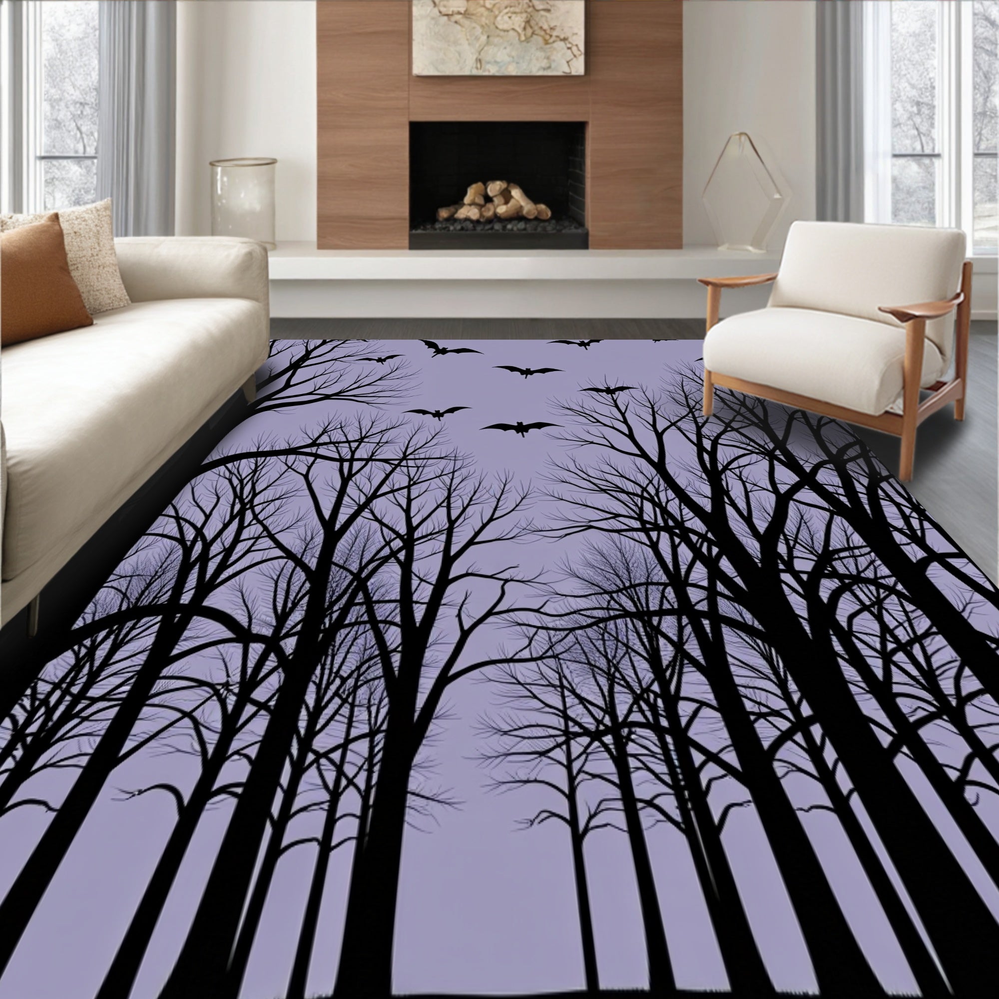 Ultra Soft Area Rug, Non Slip, Stain Resistant, Washable Area Rugs for Living Room, Bedroom, Haunted Forest with Shadowy Bats and Gnarled Trees(Purple) Overview: