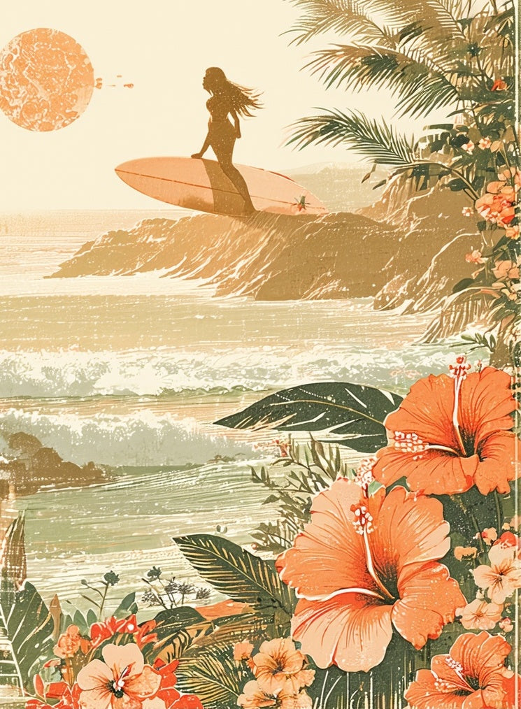 Hibiscus and Surfboard Inspired with Surfing Lady Artwork(Beige)