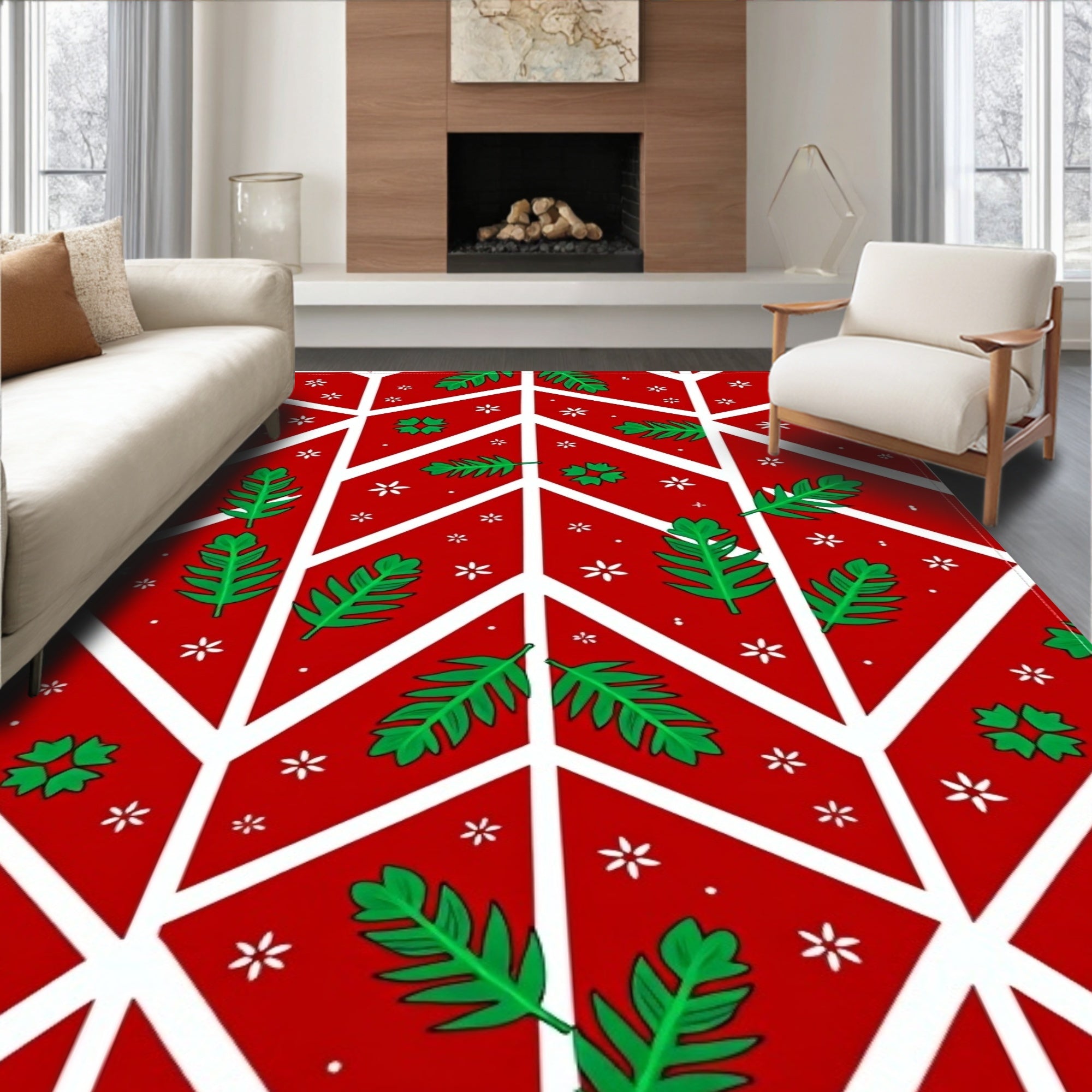 Ultra Soft Area Rug, Non Slip, Stain Resistant, Washable Area Rugs for Living Room, Bedroom, Holiday Chevron with Mistletoe Sprigs and Twinkle Dot Embellishments(Red) Overview: