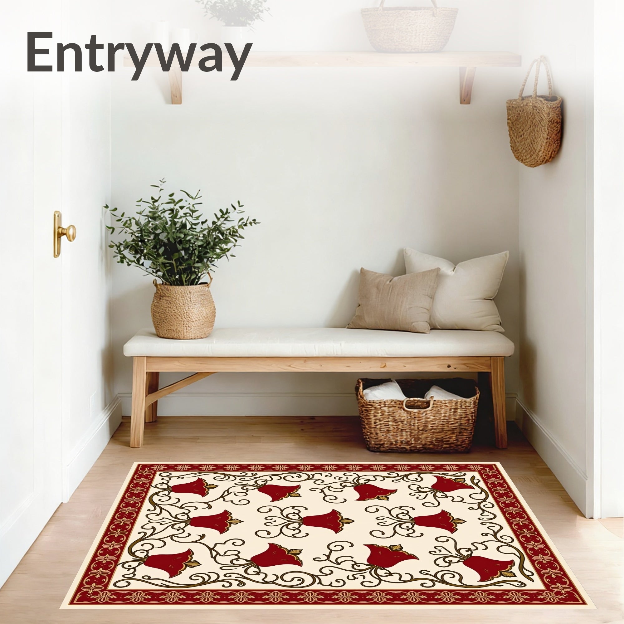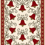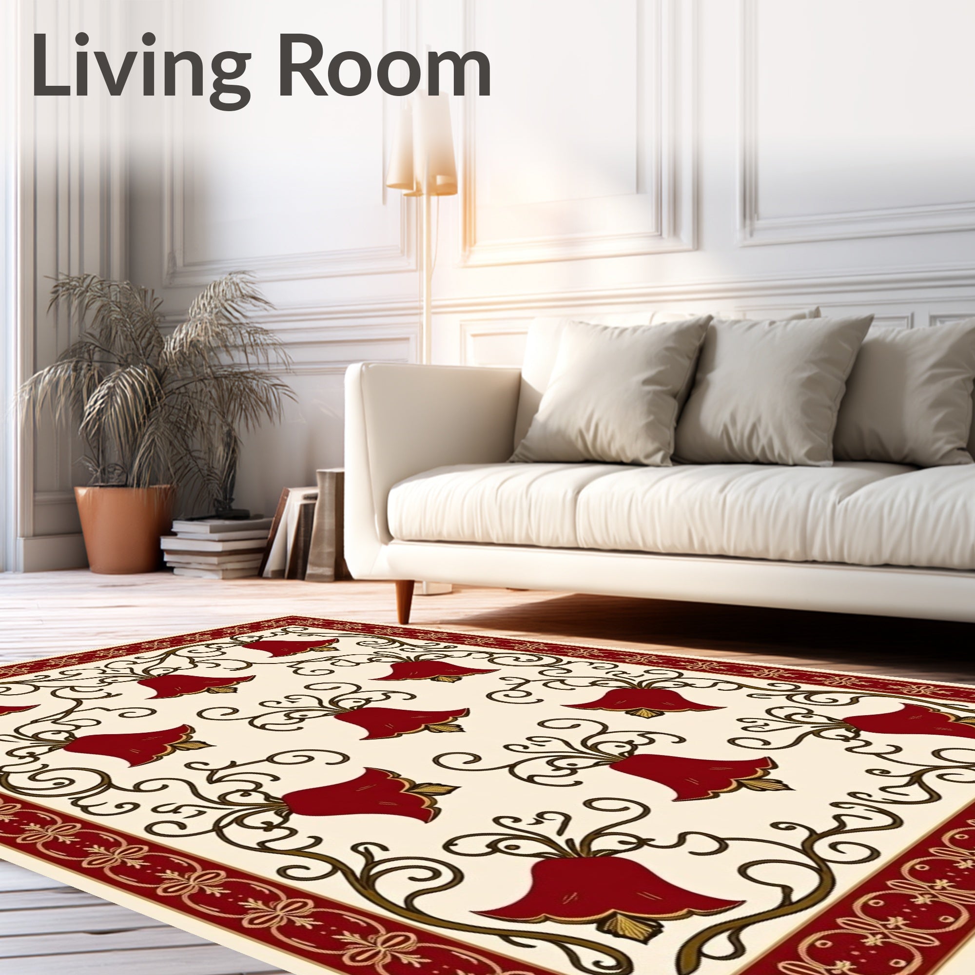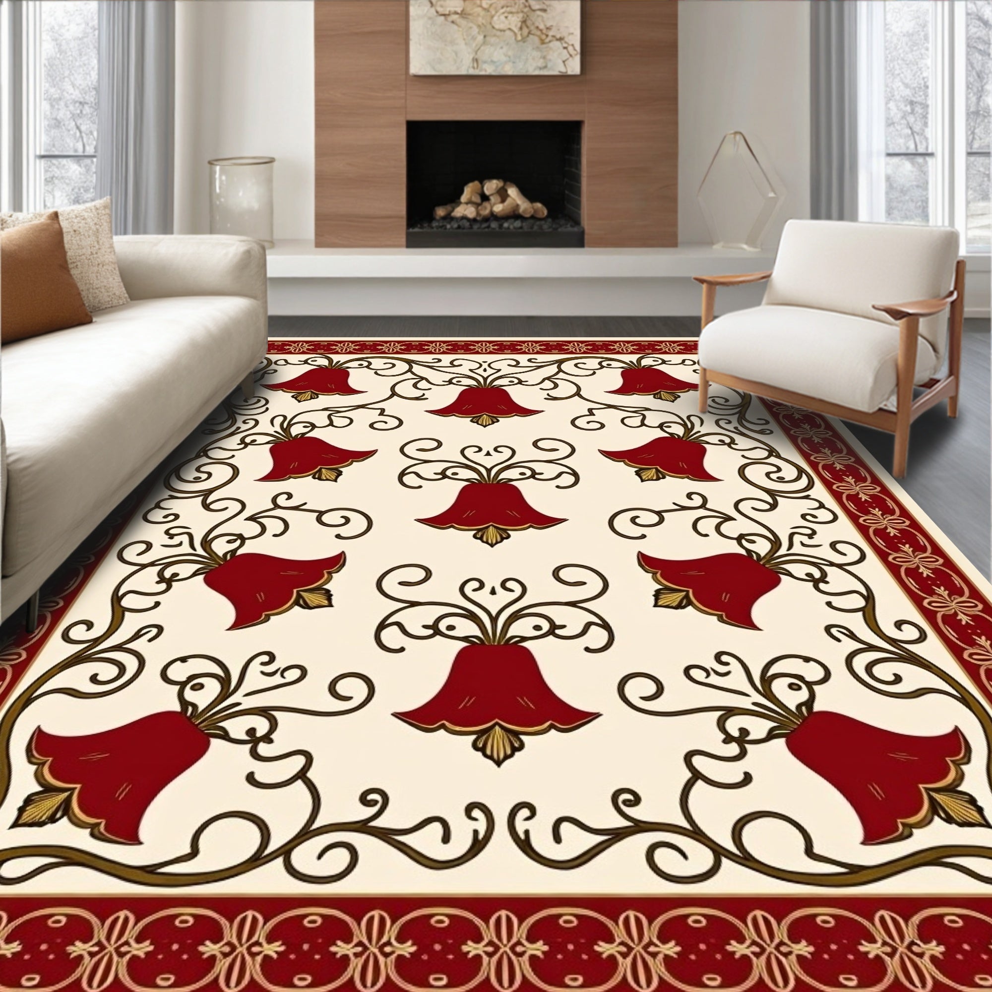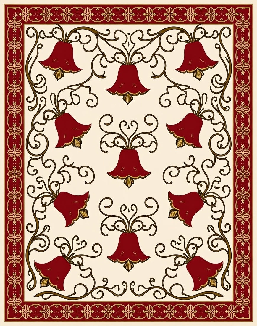 Ultra Soft Area Rug, Non Slip, Stain Resistant, Washable Area Rugs for Living Room, Bedroom, Holiday Chime Motif Featuring Stylized Bells And Curving Vine Embellishments(Red) Overview:
