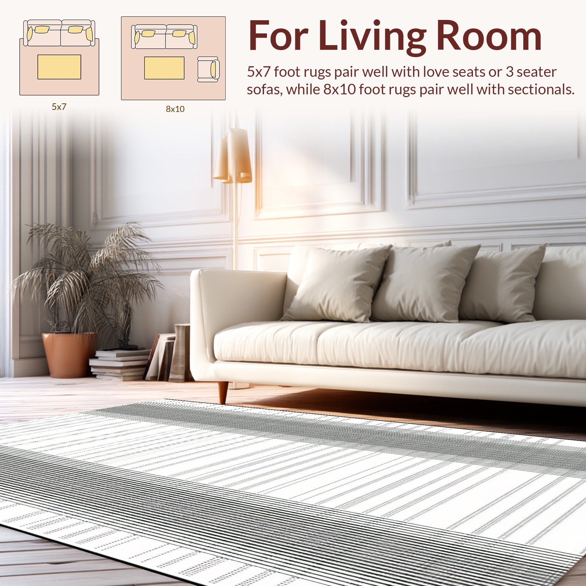 Ultra Soft Area Rug, Non Slip, Stain Resistant, Washable Area Rugs for Living Room, Bedroom, Ink & Linen Stripe Rug, Woven Graphic Carpet, Linear Art Floor Mat(Black) Overview: