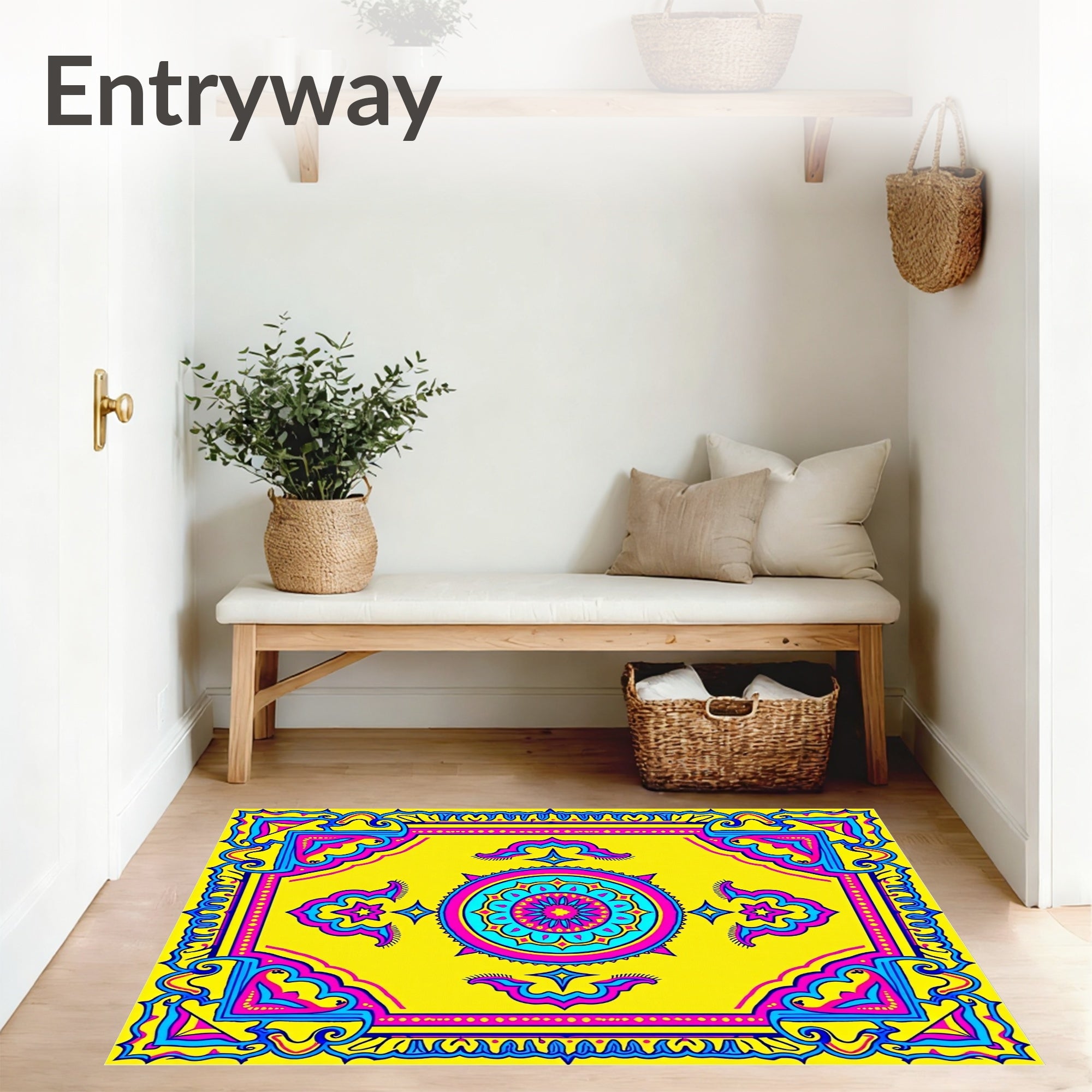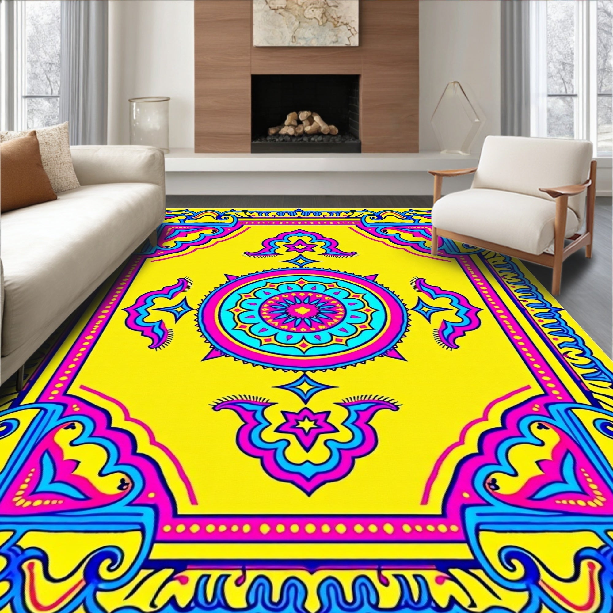 Ultra Soft Area Rug, Non Slip, Stain Resistant, Washable Area Rugs for Living Room, Bedroom, Interlocking Medallion Trellis with Vibrant Motif and Artistic Flourishes(Yellow) Overview: