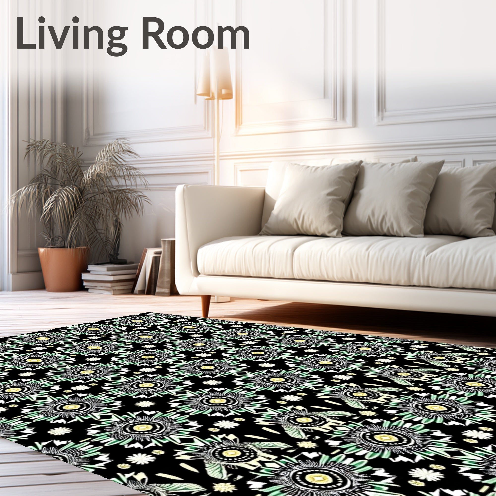 Flatwoven High Traffic Area Rug, Interlocking Starburst with Festive Emerald and Ivory Highlights, Non Slip, Stain Resistant, Washable Area Rugs for Living Room, Bedroom (Black) Overview: