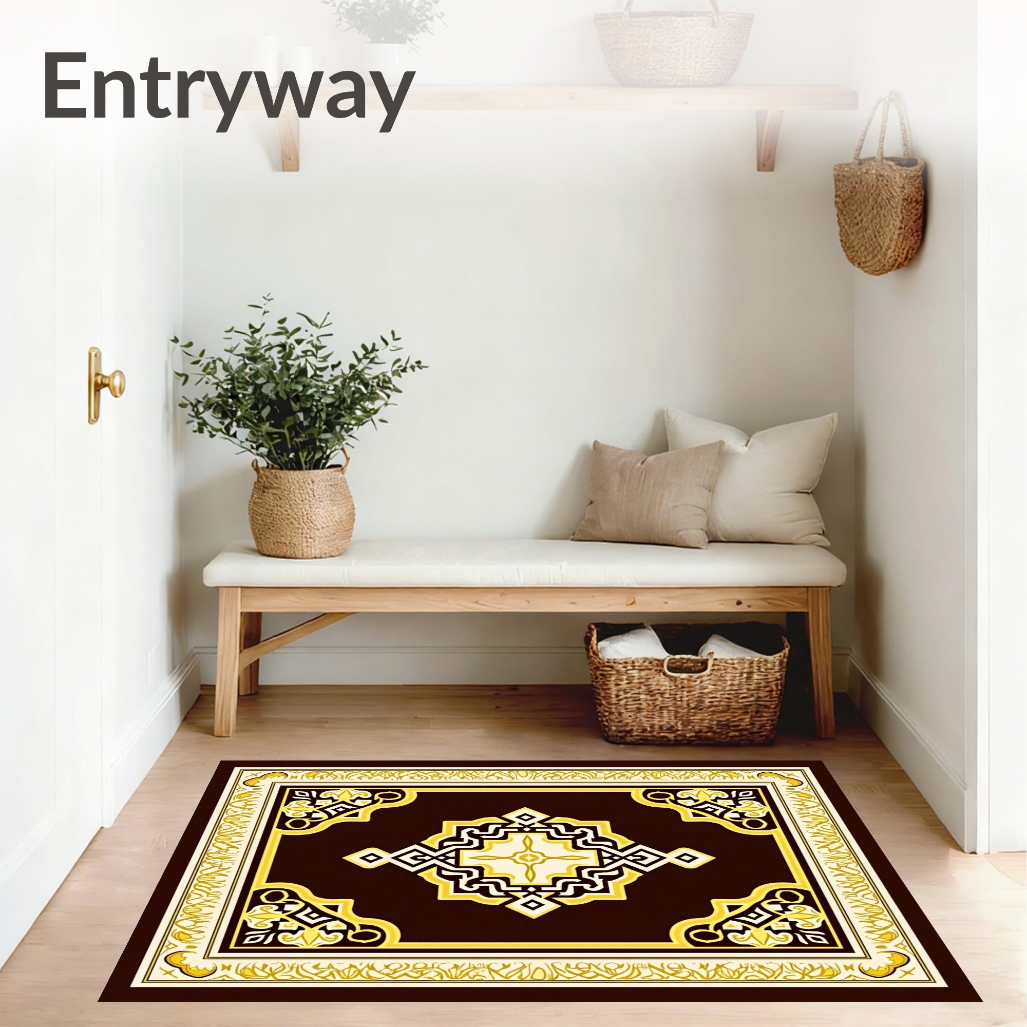 Flatwoven High Traffic Area Rug, Interlocking Trellis Medallion with Motifs and Art Flourishes, Non Slip, Stain Resistant, Washable Area Rugs for Living Room, Bedroom (Brown) Overview: