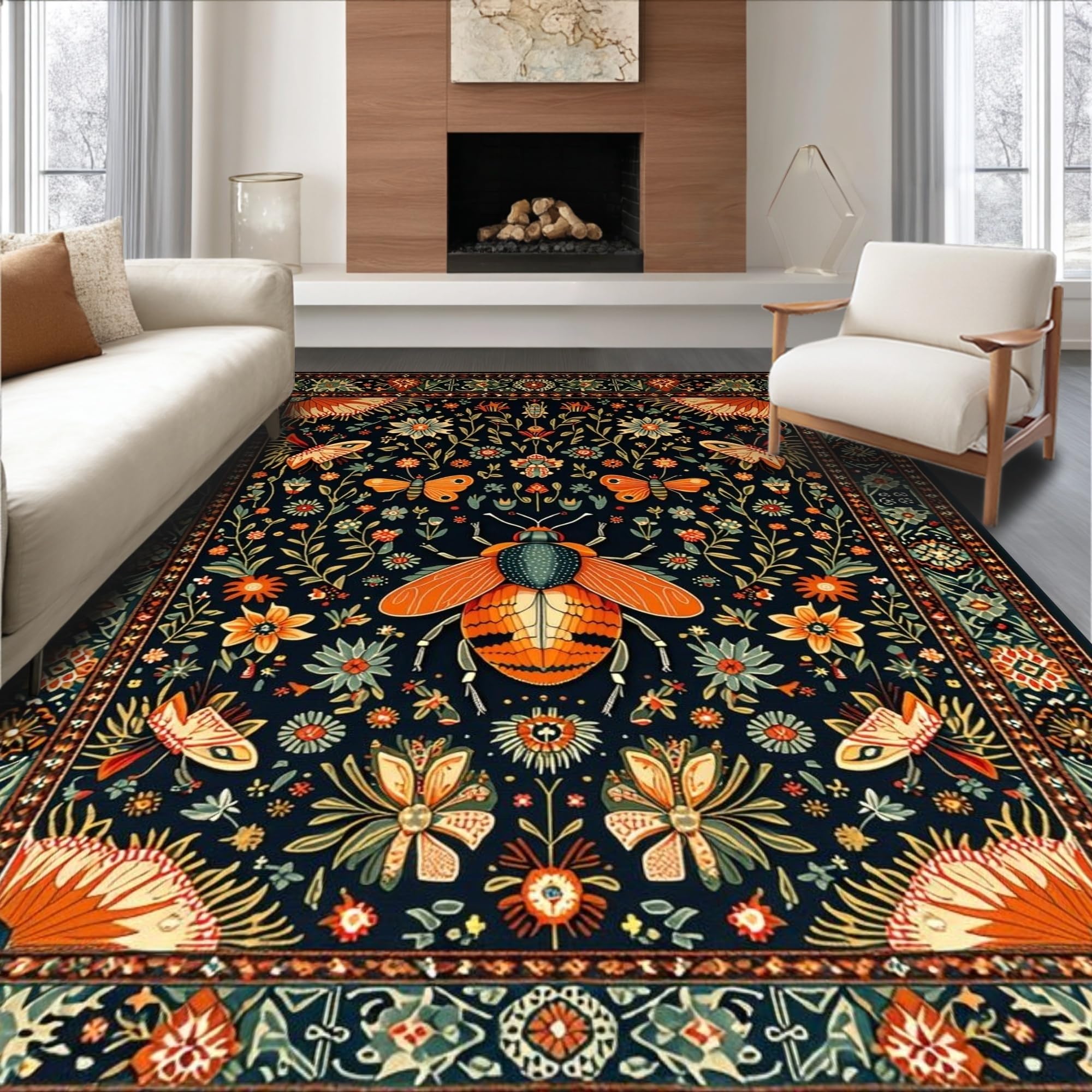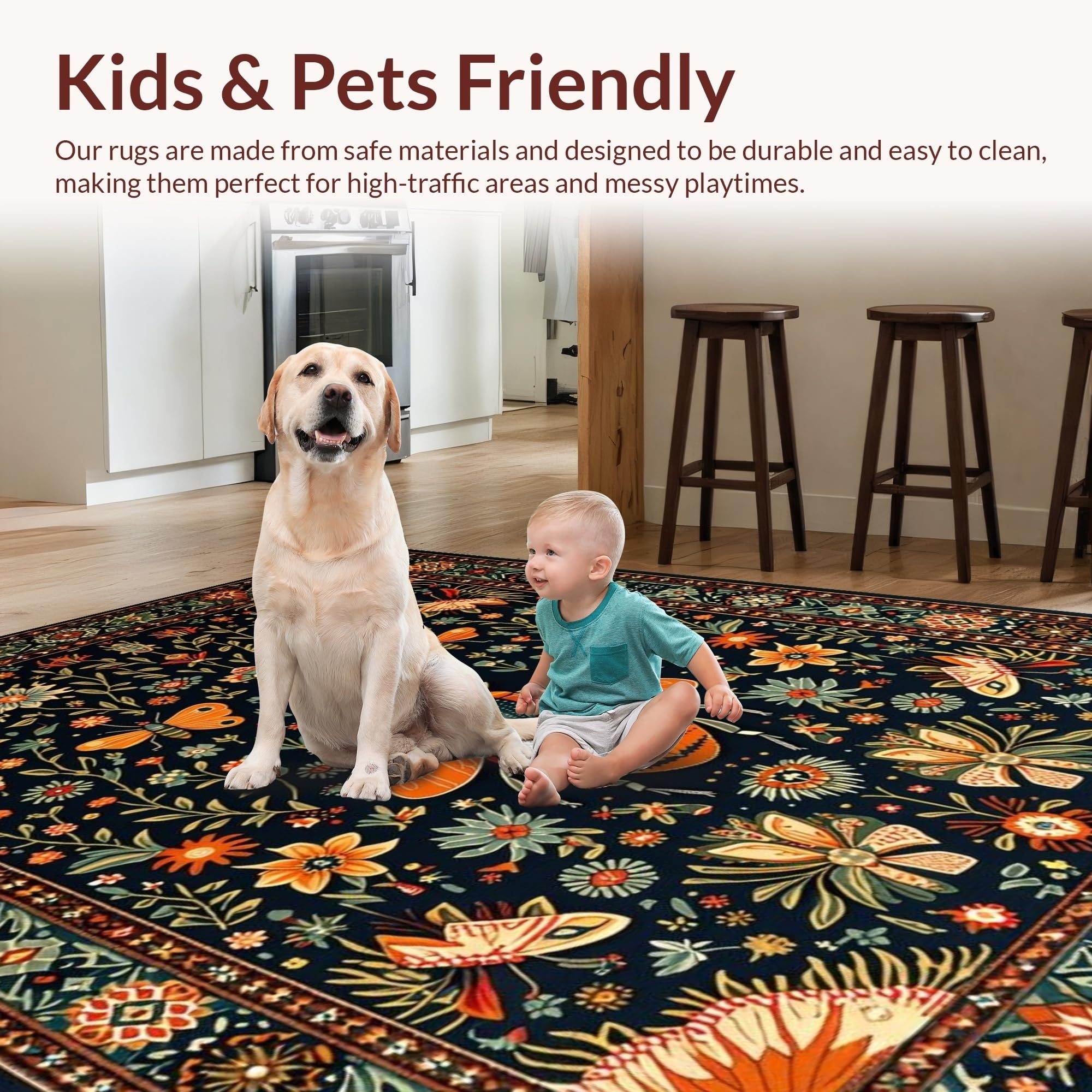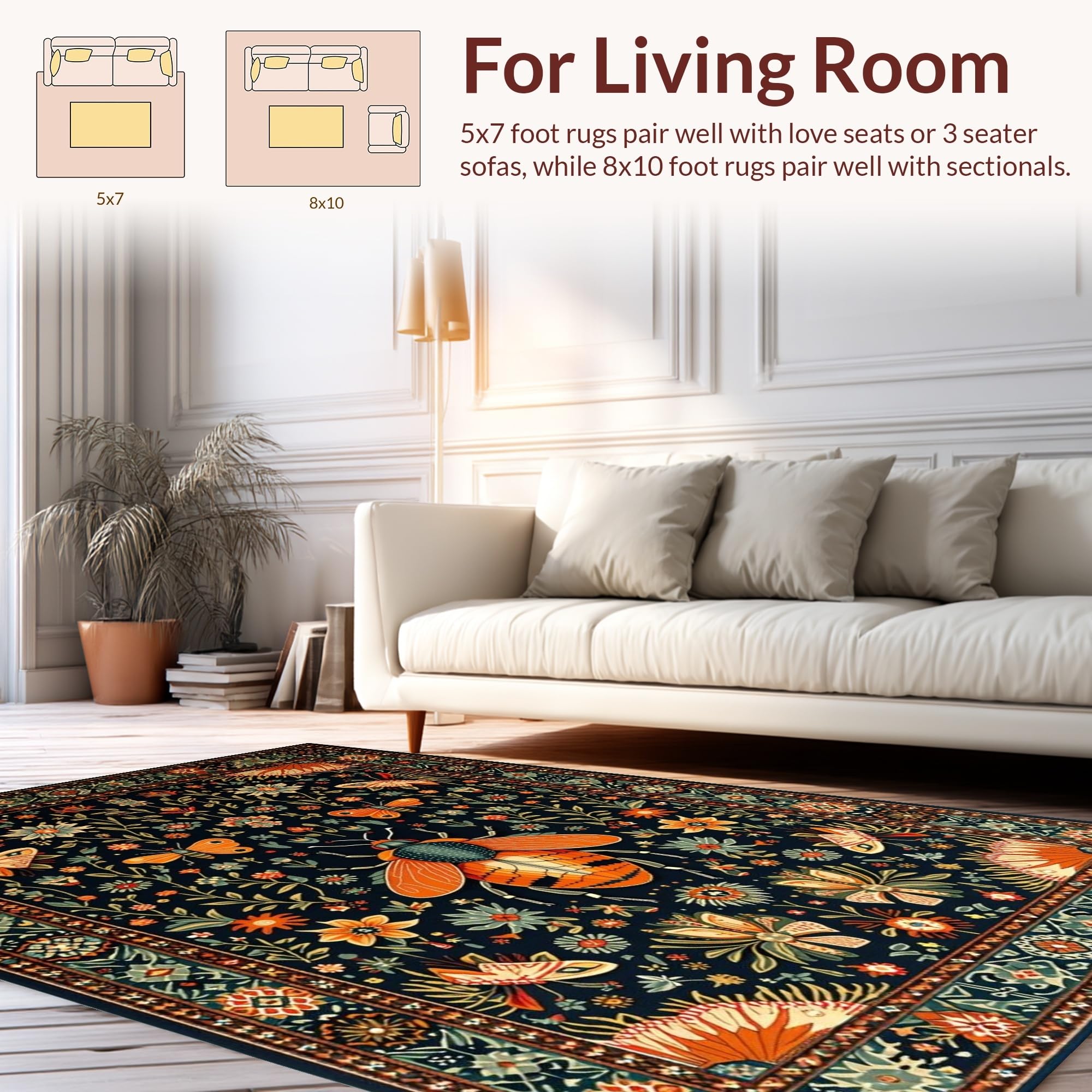 Ultra Soft Area Rug, Non Slip, Stain Resistant, Washable Area Rugs for Living Room, Bedroom, Intricate Nature-Inspired Floral Motif(Black) Overview: