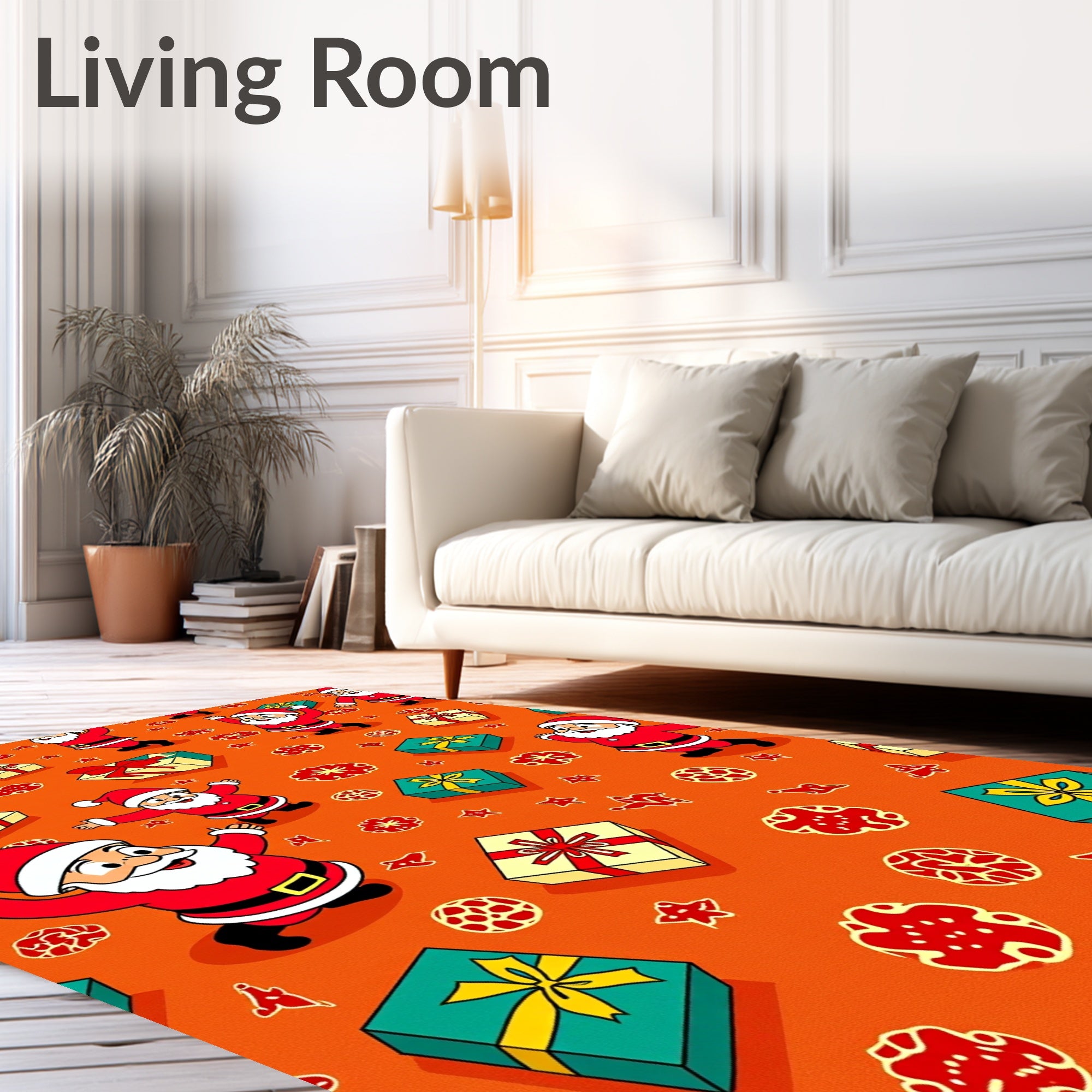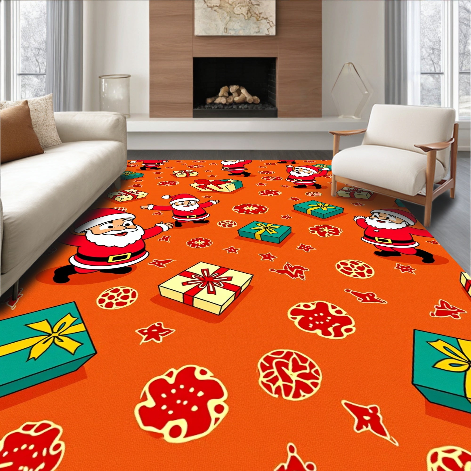 Ultra Soft Area Rug, Non Slip, Stain Resistant, Washable Area Rugs for Living Room, Bedroom, Jolly Santa and Gift Box Parade with Festive Bows(Orange) Overview: