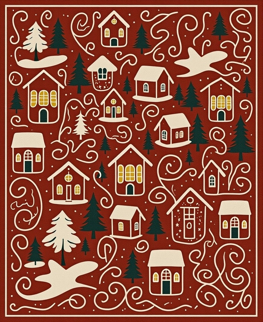 Joyful Holiday Village Scene with Cabins and Twinkling Snow Drifts(Red)