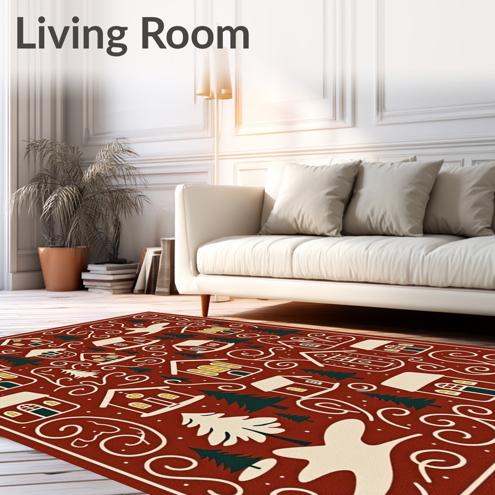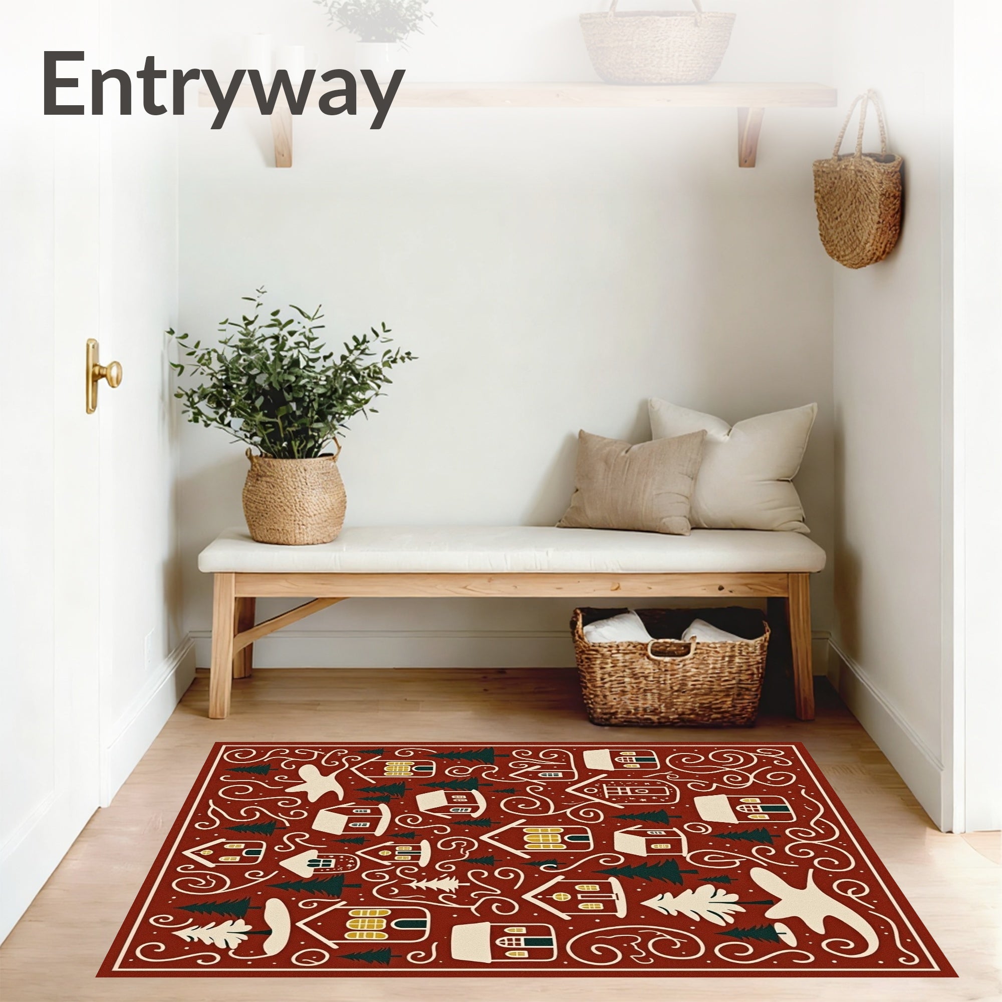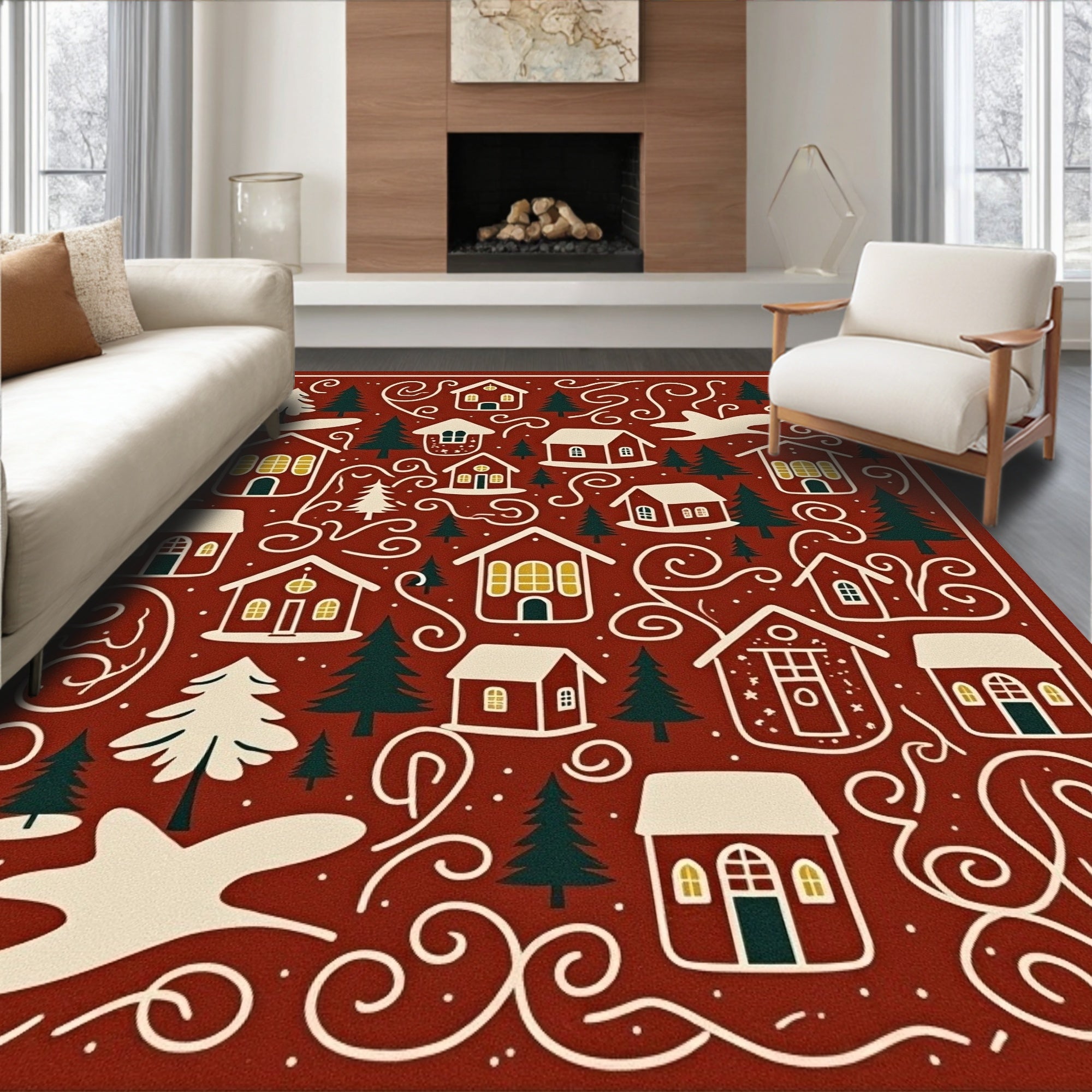 Ultra Soft Area Rug, Non Slip, Stain Resistant, Washable Area Rugs for Living Room, Bedroom, Joyful Holiday Village Scene with Cabins and Twinkling Snow Drifts(Red) Overview: