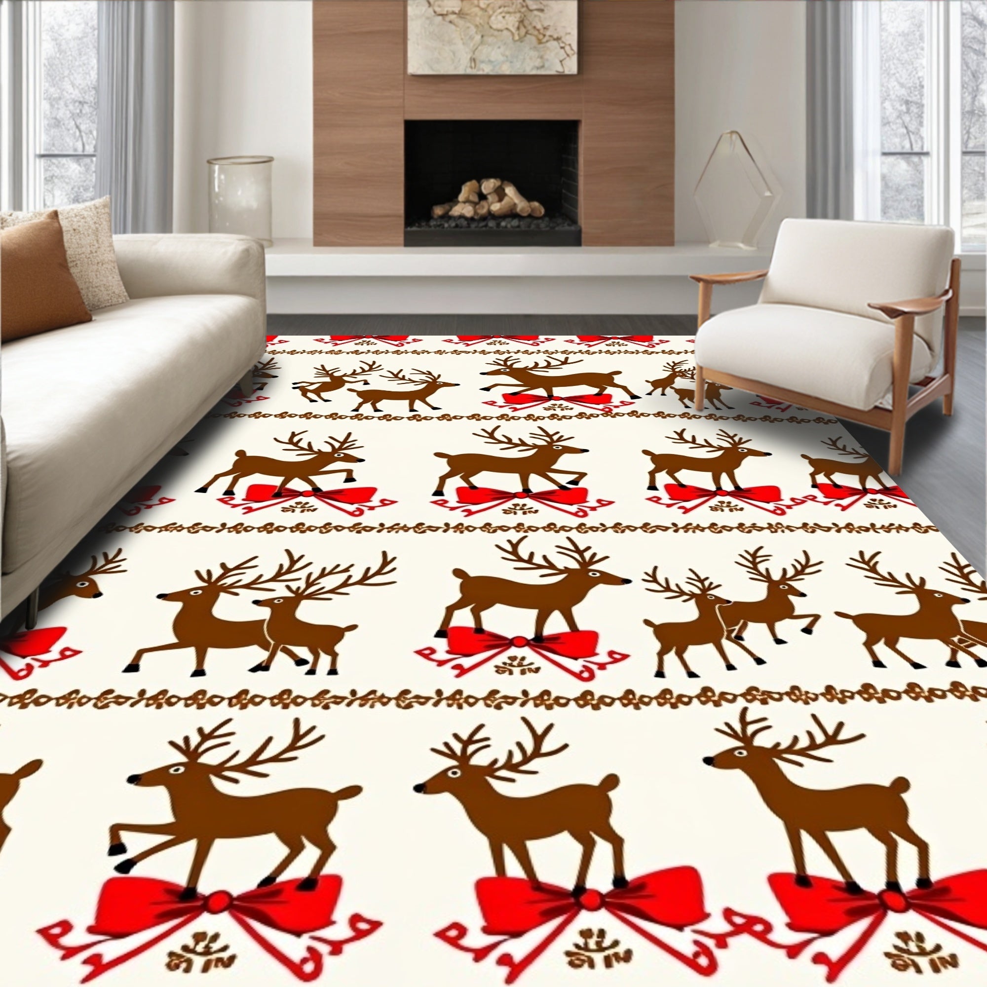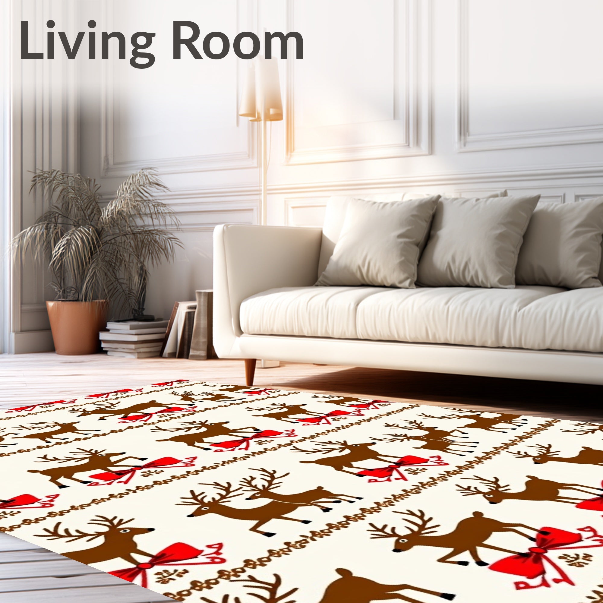 Ultra Soft Area Rug, Non Slip, Stain Resistant, Washable Area Rugs for Living Room, Bedroom, Joyful Reindeer Parade with Ribbon Bow Accents Celebration(Brown) Overview: